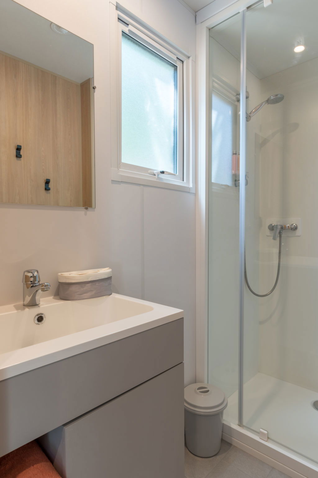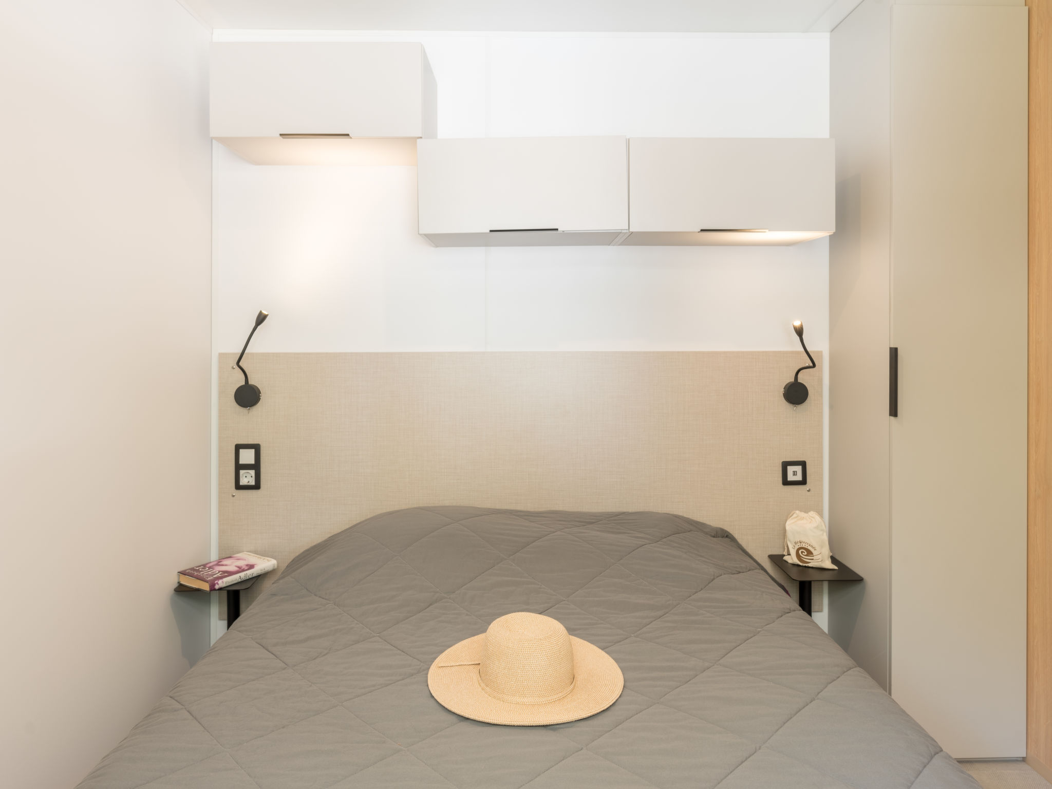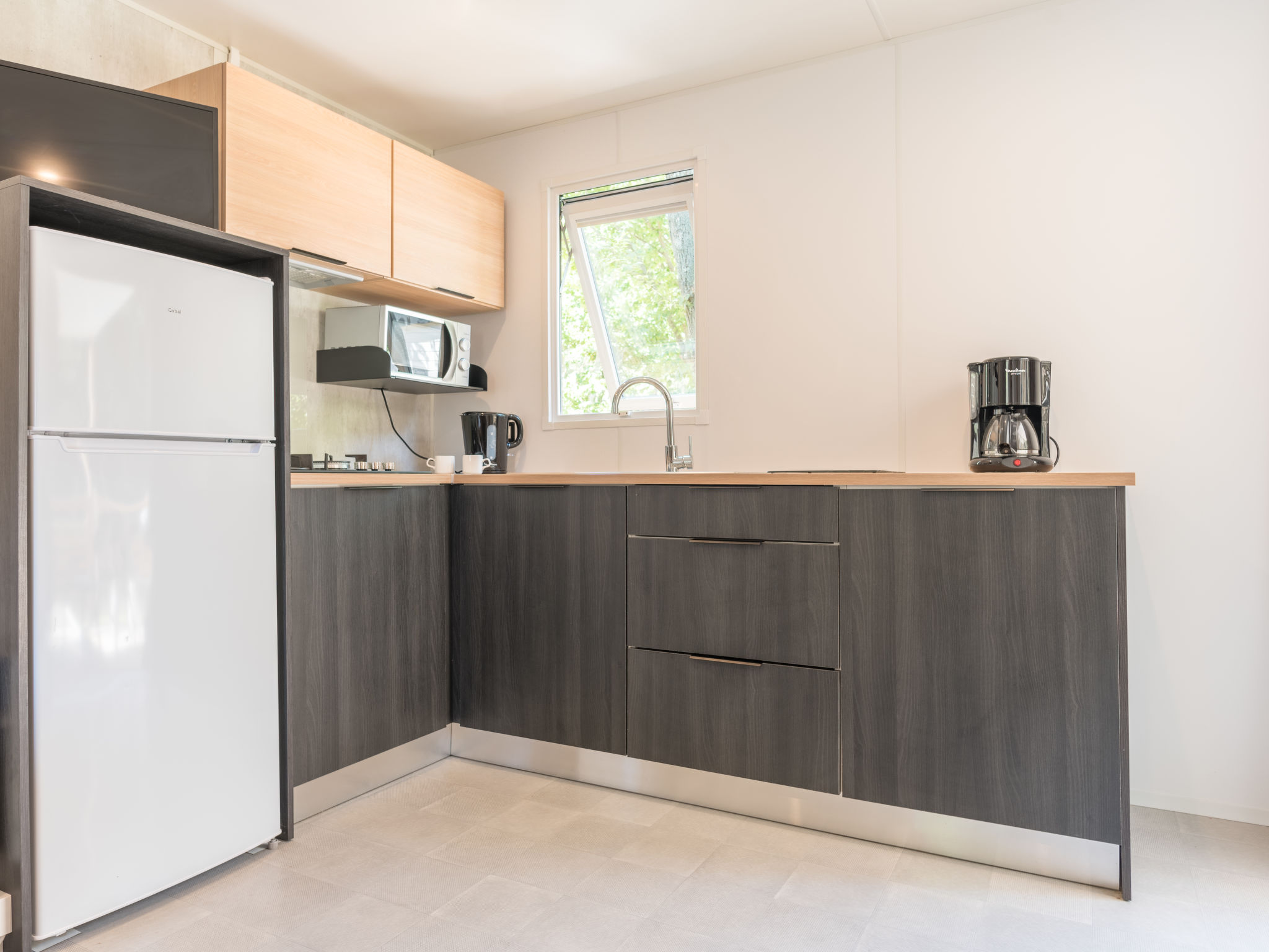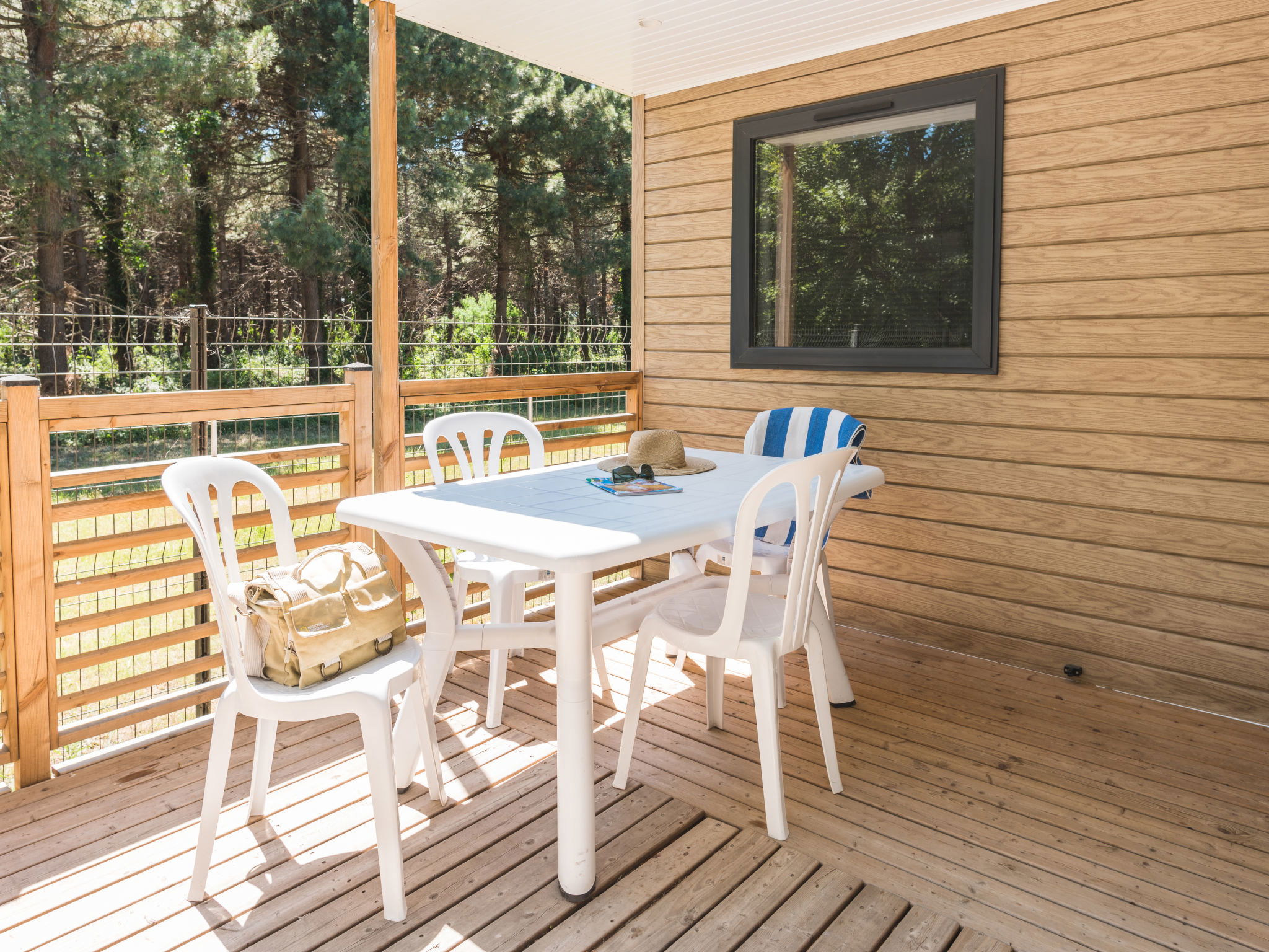 "Le Mediterranée", 3-room mobile home 35 m2. Comfortable furnishings: living/dining room with dining table and TV (flat screen). Exit to the terrace. 1 room with 1 french bed (140 cm, length 190 cm). 1 room with 2 beds (80 cm, length 190 cm). Open kitchen (4 gas rings, microwave, freezer, electric coffee machine). Shower, sep. WC. Air-conditioning, forced-air heating. Terrace partly roofed. Terrace furniture, deck chairs (2). Facilities: children's high chair, baby cot for up to 2 year olds (extra). Internet (WiFi, extra). Please note: maximum 1 pet/ dog allowed. Smoke alarm.