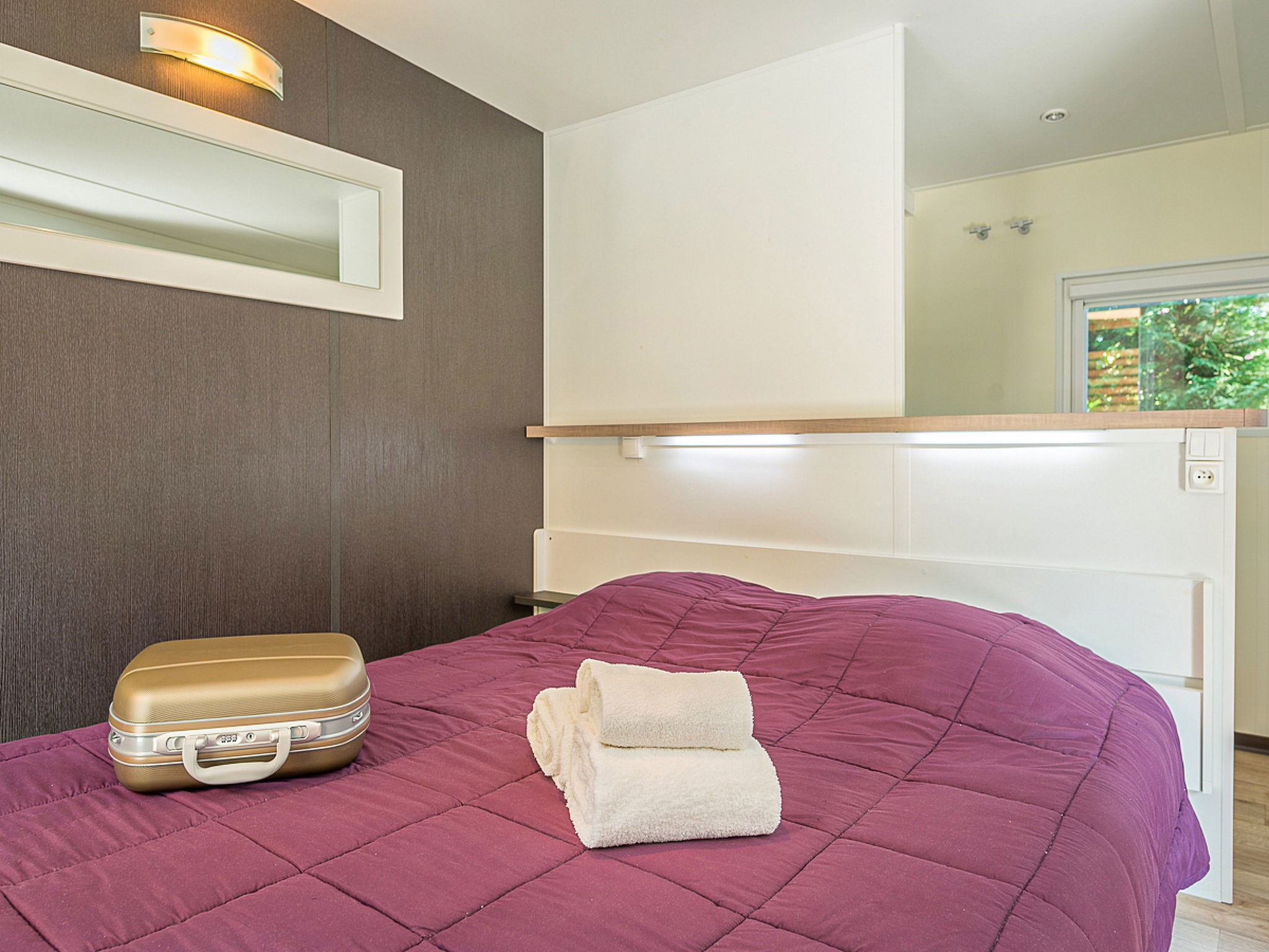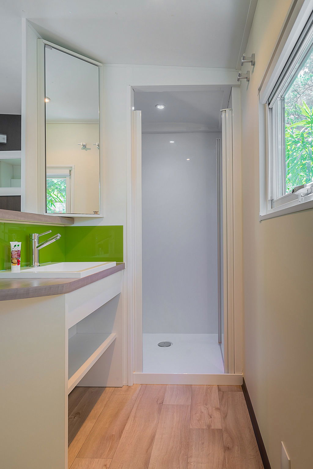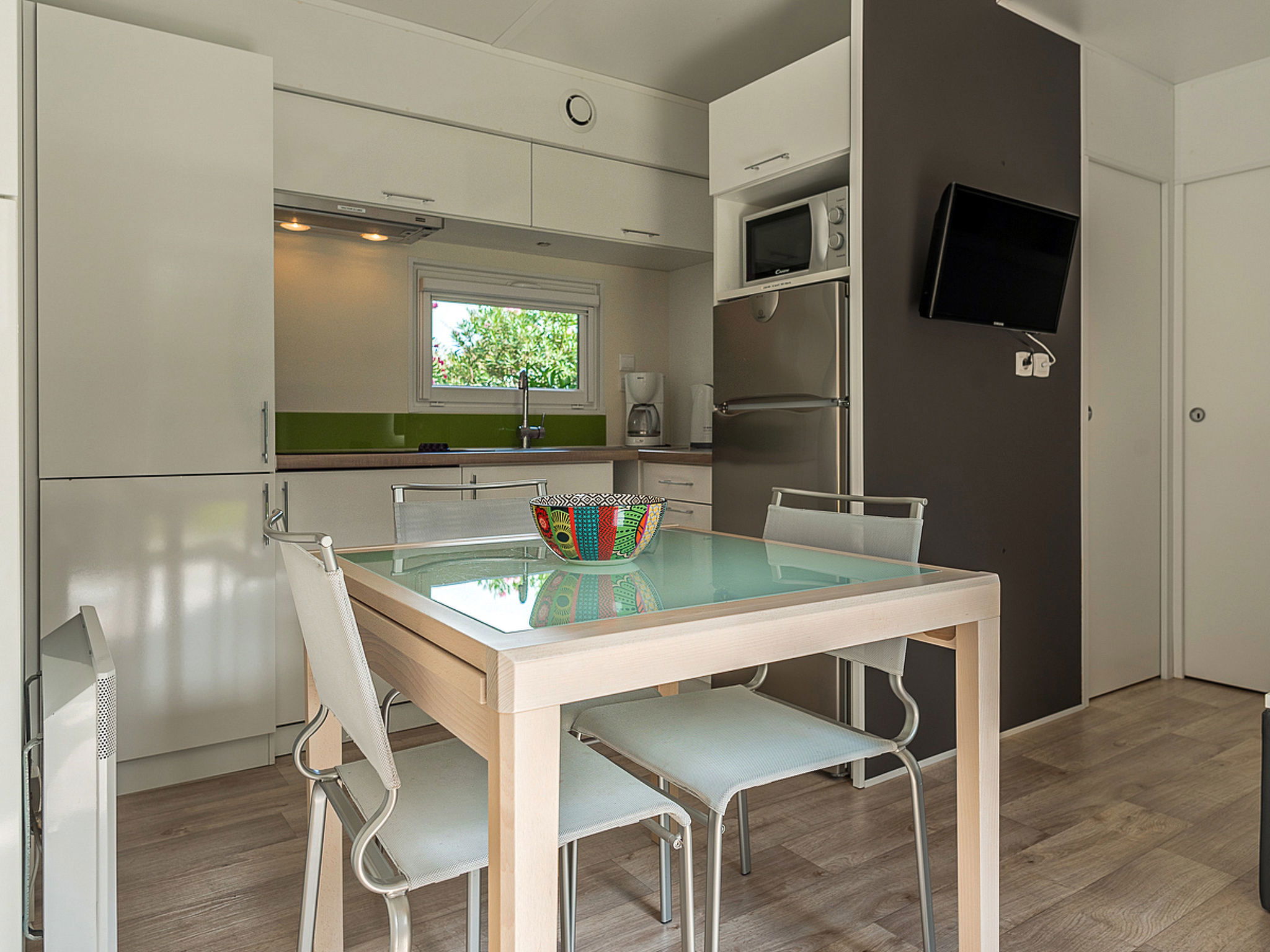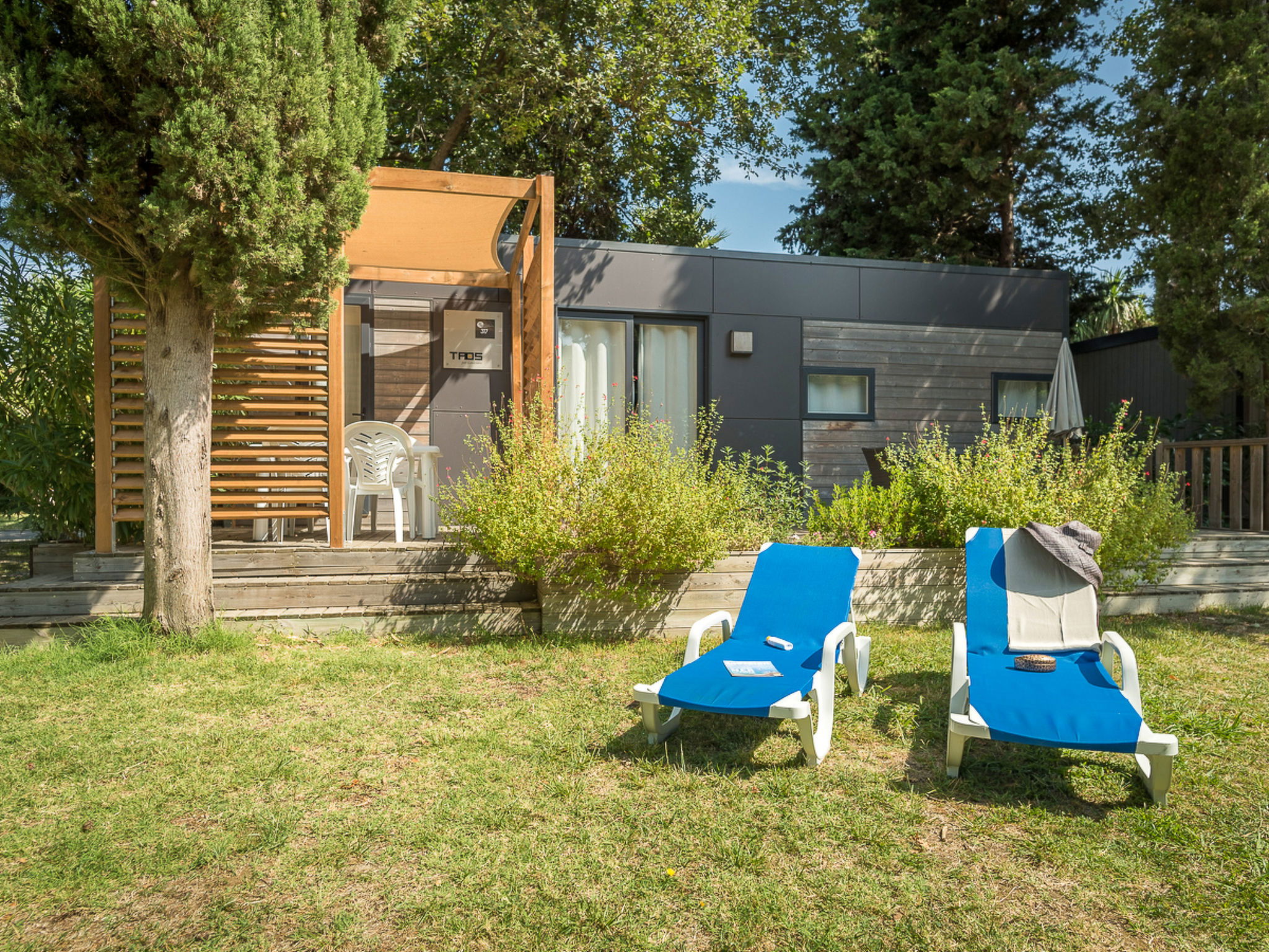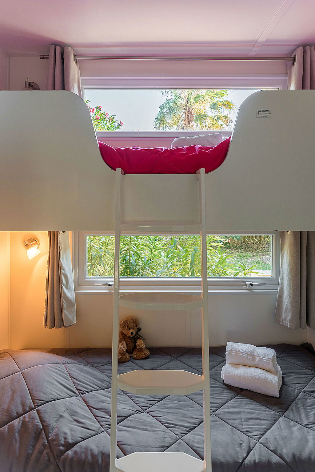 "Le Mediterranée", 4-room mobile home 40 m2. Comfortable furnishings: living/dining room with dining table and satellite TV (flat screen). Exit to the terrace. 1 room with 1 french bed (160 cm, length 200 cm), separate WC and shower. 1 room with 2 beds (80 cm, length 190 cm), shower/WC. 1 small room with 1 x 2 bunk beds (80 cm, length 190 cm). Open kitchen (dishwasher, 4 gas rings, toaster, kettle, microwave, freezer, electric coffee machine). Electric heating, air-conditioning, forced-air heating. Terrace. Terrace furniture, barbecue (portable), deck chairs (2). Facilities: children's high chair, baby cot for up to 2 year olds (extra). Internet (WiFi, free). Please note: maximum 1 pet/ dog allowed. Smoke alarm.