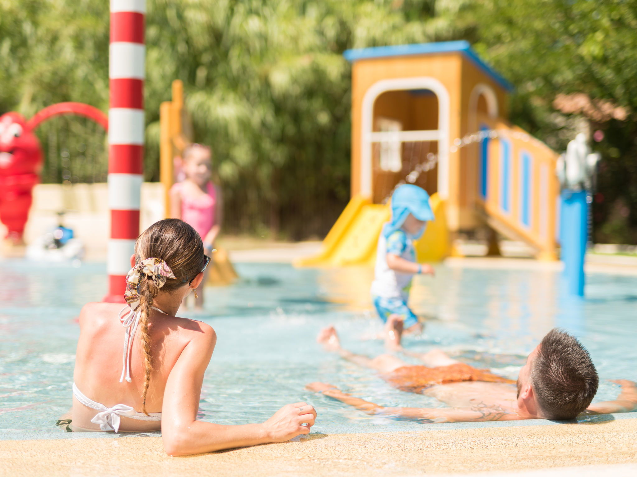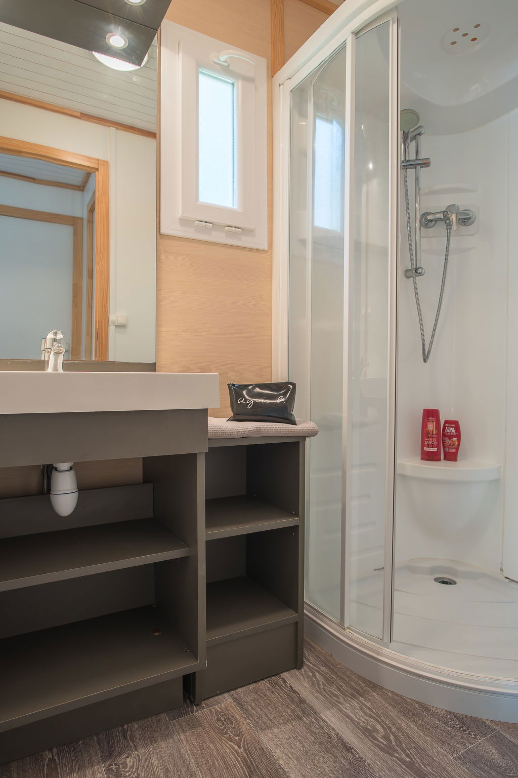 "Le Mediterranée", 4-room bungalow 35 m2. Modern furnishings: living/dining room with dining table and satellite TV (flat screen), air conditioning. Exit to the terrace. 1 room with 1 french bed (160 cm, length 200 cm). 1 room with 2 beds (80 cm, length 190 cm). 1 small room with 1 x 2 bunk beds (70 cm, length 190 cm). Kitchenette (4 ceramic glass hob hotplates, toaster, kettle, microwave, freezer, electric coffee machine). Shower, sep. WC. Electric heating, forced-air heating. Terrace roofed. Terrace furniture, deck chairs (2). Facilities: children's high chair, baby cot for up to 2 year olds (extra). Internet (WiFi, extra). Please note: maximum 1 pet/ dog allowed. Smoke alarm.