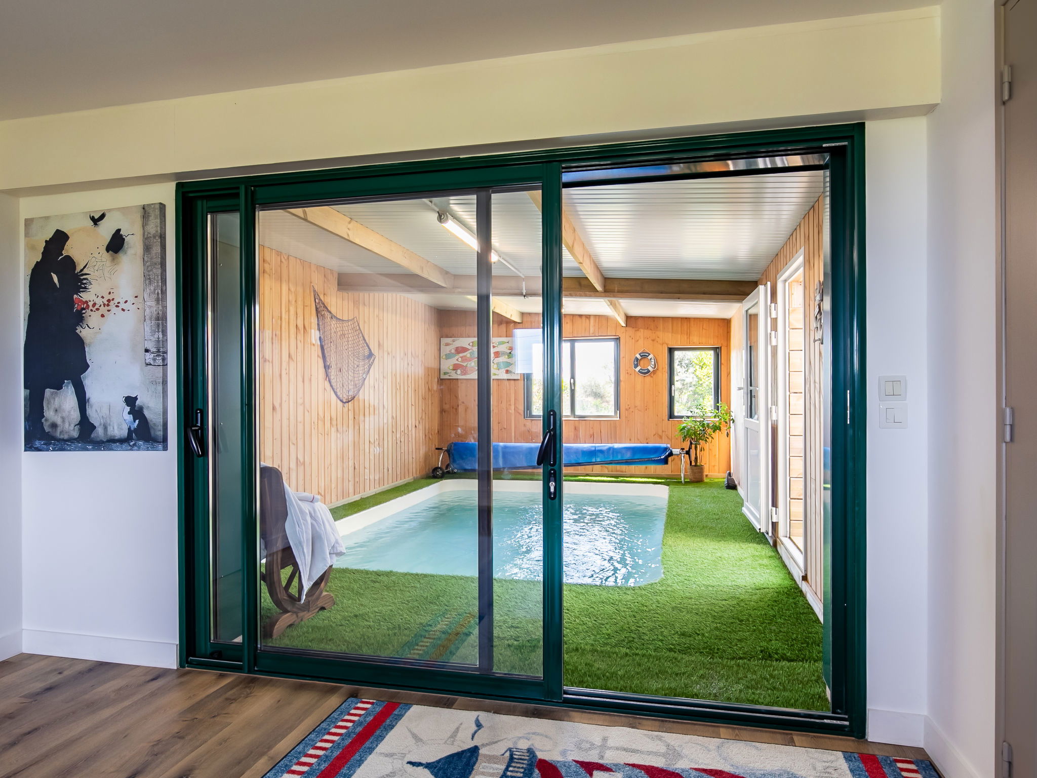 10 km from Locquirec: Very modern, beautiful, comfortable terraced house "Ty Man", 2 storeys. In the resort 5.7 km from the centre of Guimaec, 4.5 km from the centre of Plougasnou, in a quiet position, 500 m from the sea, 2.5 km from the beach. For shared use: property 8'000 m2, well-kept garden (not fenced) with lawn and plants. Private: well-kept garden with lawn 2'000 m2 wildlife garden, indoor pool angular, heated, with privacy, secured, fenced (3 x 4 m, 12 m2, depth 140 cm). Outdoor shower, pool maintenance by the owner/gardener. Parking (for 2 cars) on the premises. Shop 4.6 km, grocery 4.6 km, supermarket 5 km, restaurant 4.5 km, bus stop 4.7 km, sandy beach "Plage de Vilin Izella" 2.4 km, diving center 13 km. Sports harbour 12 km, golf course (18 hole) 40 km, surf school 7 km, sailing school 12 km, walking paths from the house 500 m. Nearby attractions: Morlaix 20 km, Lannion 30 km, Côte du Granit Rose 40 km, Cairn de Barnenez 14 km, Roscoff, Jardin exotique 47 km. Hiking paths: GR34, sentier des Douaniers 500 m. Please note: Property ref. FR2963.646.1 is situated on the same property. All houses/apartments are individually designed/furnished.