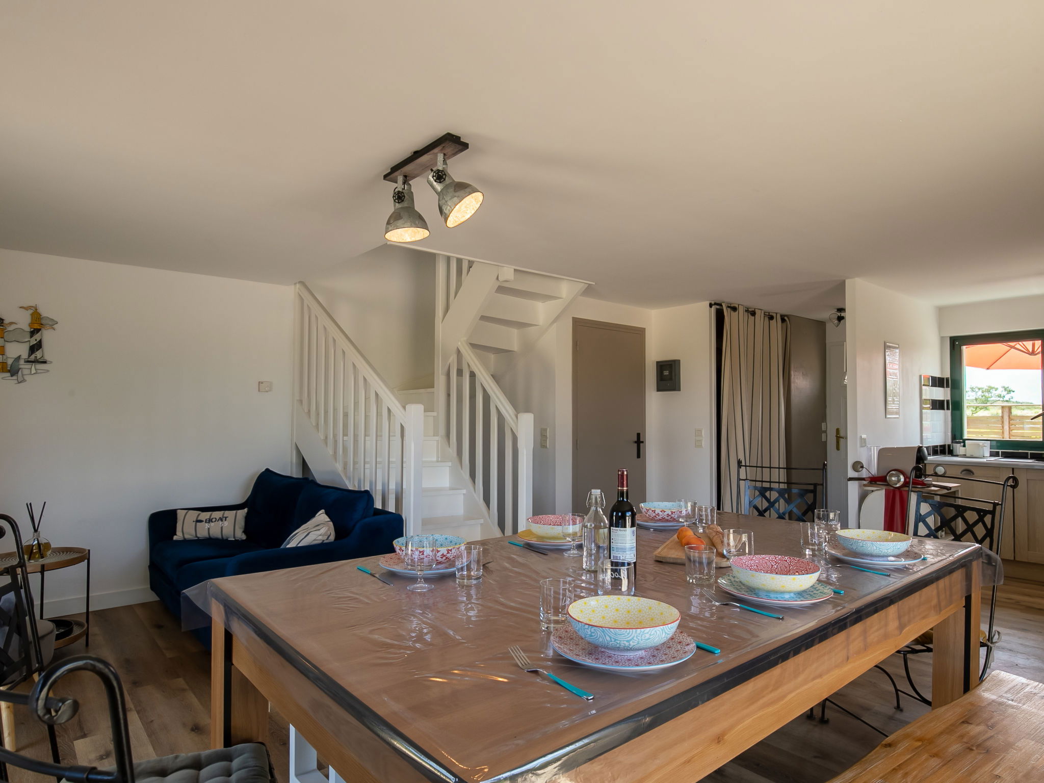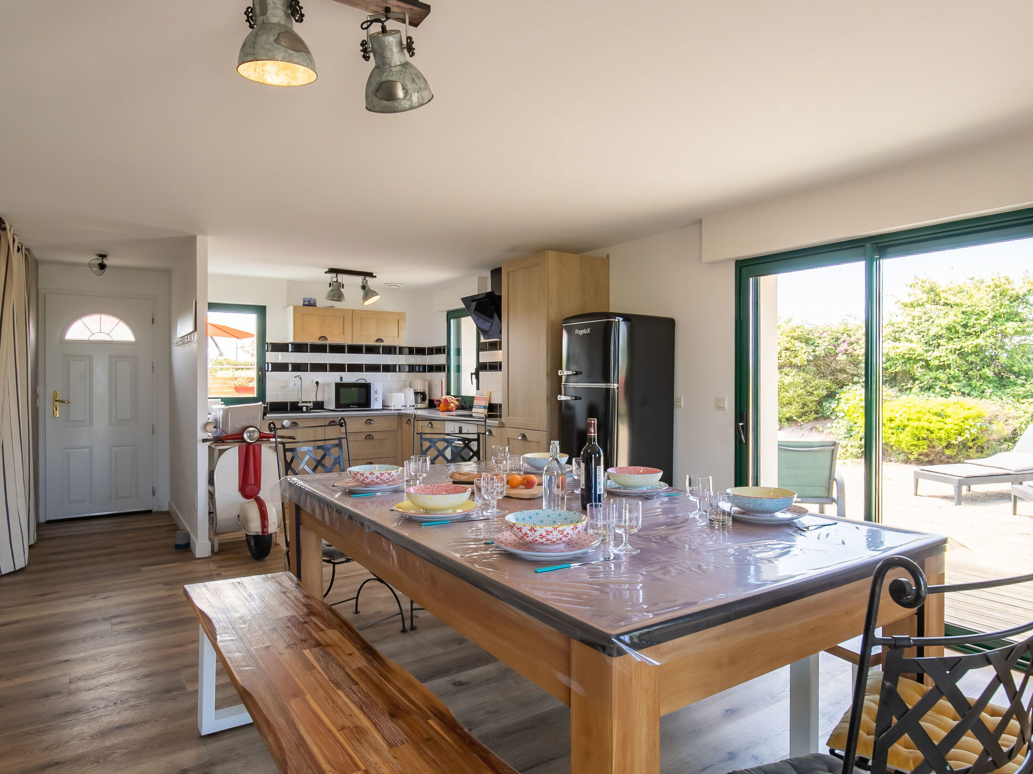 "Ty Man", 5-room house 80 m2. Fully renovated in 2022, beautiful and tasteful furnishings: large living/dining room with dining table, TV and flat screen. Exit to the terrace, to the swimming pool. Living room 15 m2 with sliding door with TV and flat screen. Exit to the swimming pool. Open kitchen (oven, dishwasher, 4 induction hot plates, toaster, kettle, microwave, electric coffee machine, Capsules for coffee machine (Philipps) extra). Exit to the terrace, south facing position. Sep. WC. Upper floor: 1 room with 1 french bed (160 cm, length 200 cm). 2 rooms, each room with 2 beds (90 cm, length 200 cm). Bath/WC. Electric heating. Terrace 15 m2, south-west facing position. Terrace furniture, barbecue (portable), deck chairs (2). View of the sea. Facilities: washing machine, dryer, iron, children's high chair, baby cot for up to 2 year olds, hair dryer. Internet (WiFi, free). Please note: non-smoking house. Maximum 1 pet/ dog allowed. Smoke alarm. Offer by a private individual according to Art. 155, IV of CGI.