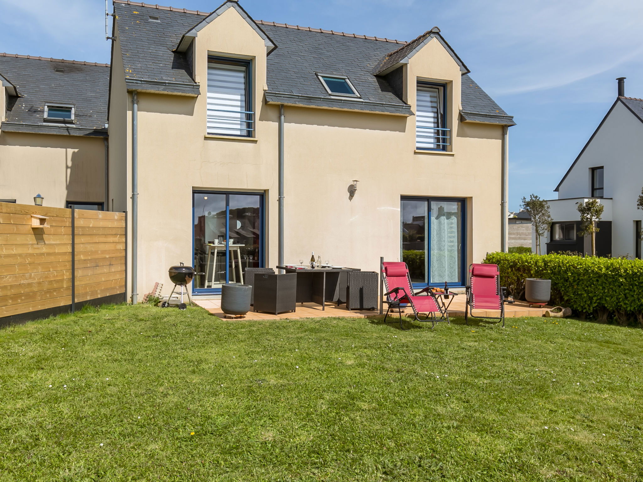 "Portsall Paradise", 3-room terraced house 76 m2. Bright, comfortable and tasteful furnishings: open large living/dining room 35 m2 with TV (flat screen). Exit to the terrace. Open kitchen (dishwasher, 3 induction hot plates, toaster, kettle, microwave, freezer, electric coffee machine) with dining table. Sep. WC. Upper floor: 1 room with 1 french bed (160 cm, length 200 cm). 1 room with 1 double bed (2 x 80 cm, length 200 cm). Bath/WC. Electric heating. Garden 236 m2, south facing position. Terrace furniture, barbecue (portable), deck chairs (2). Facilities: washing machine, dryer, hair dryer. Internet (WiFi, free). Please note: non-smoking house. Maximum 2 pets/ dogs allowed. Smoke alarm. Offer by a private individual according to Art. 155, IV of CGI.