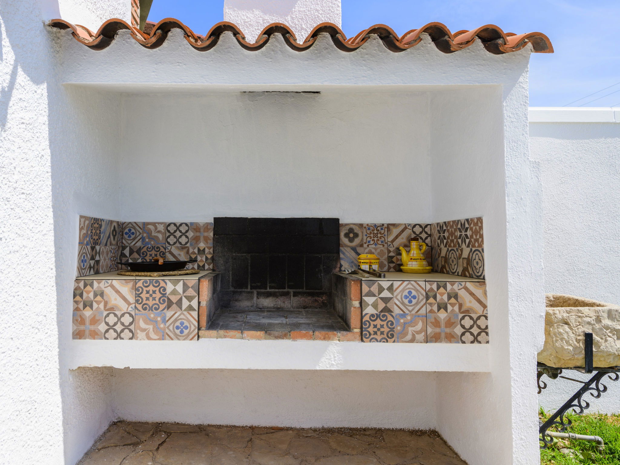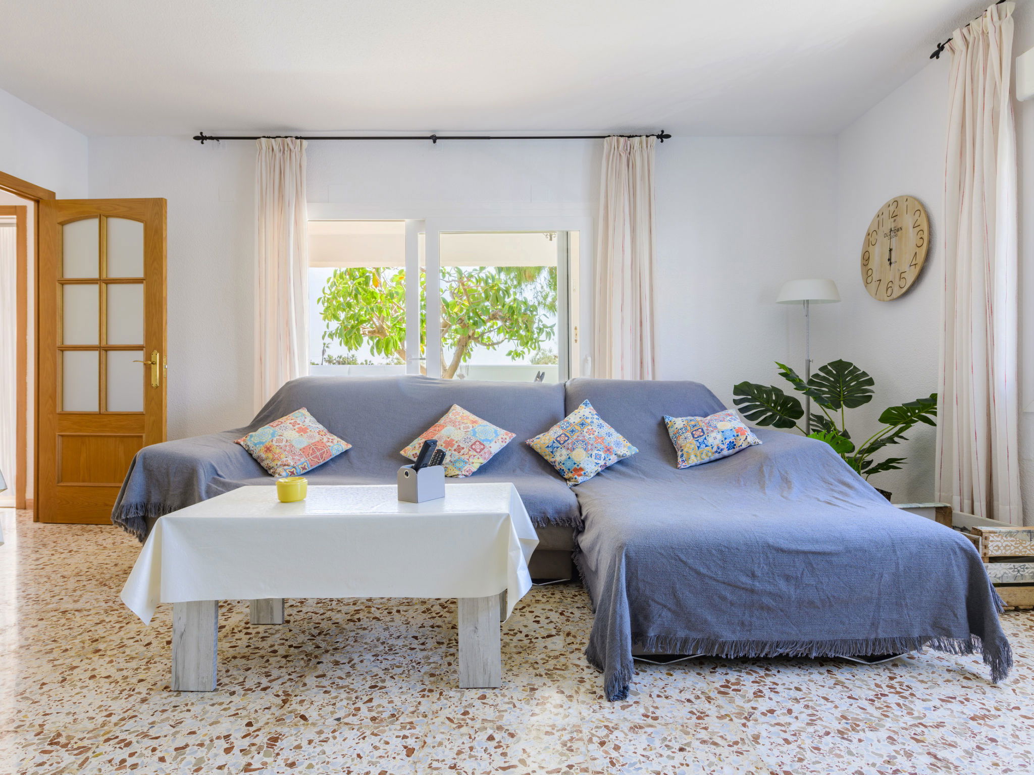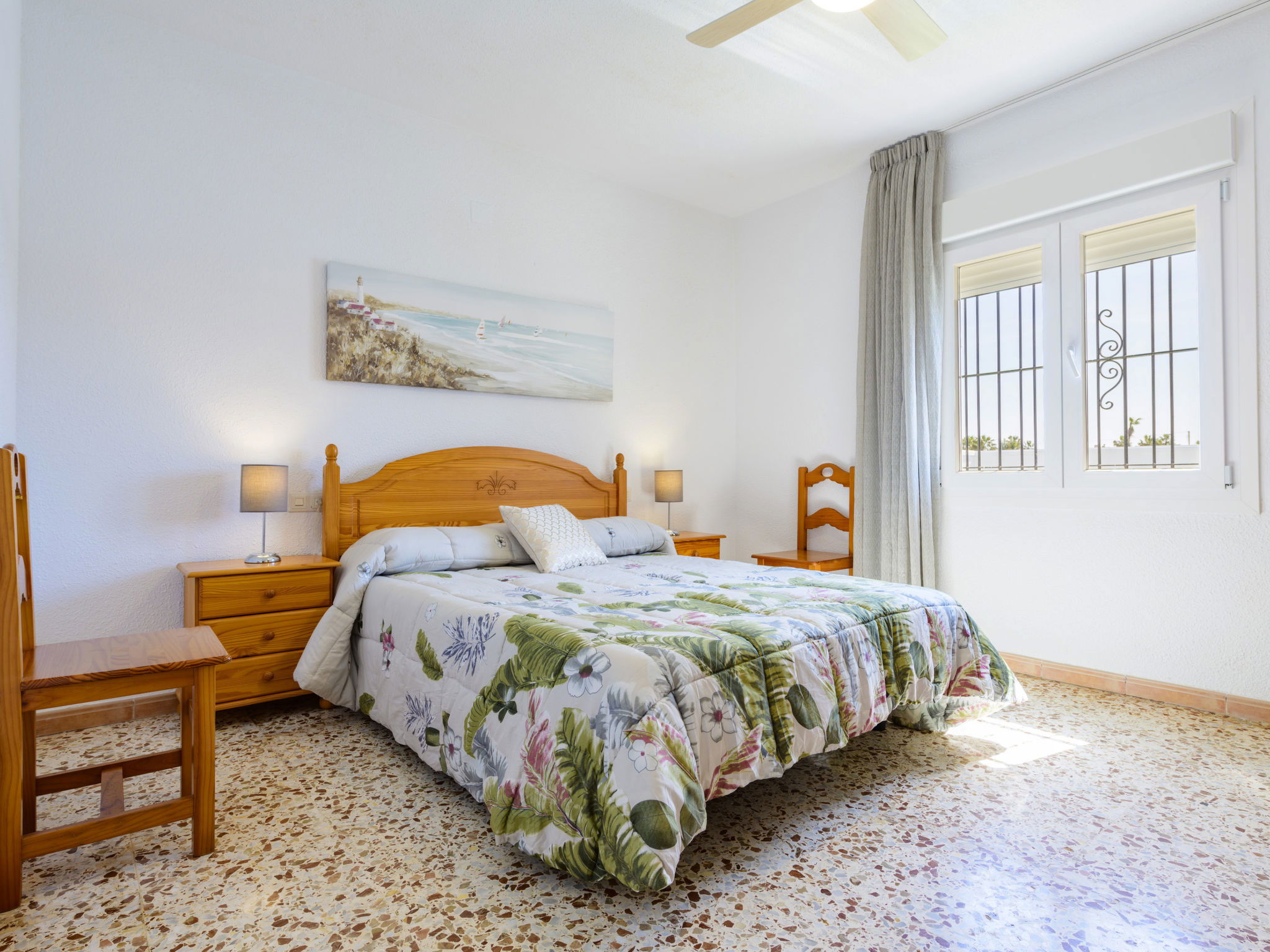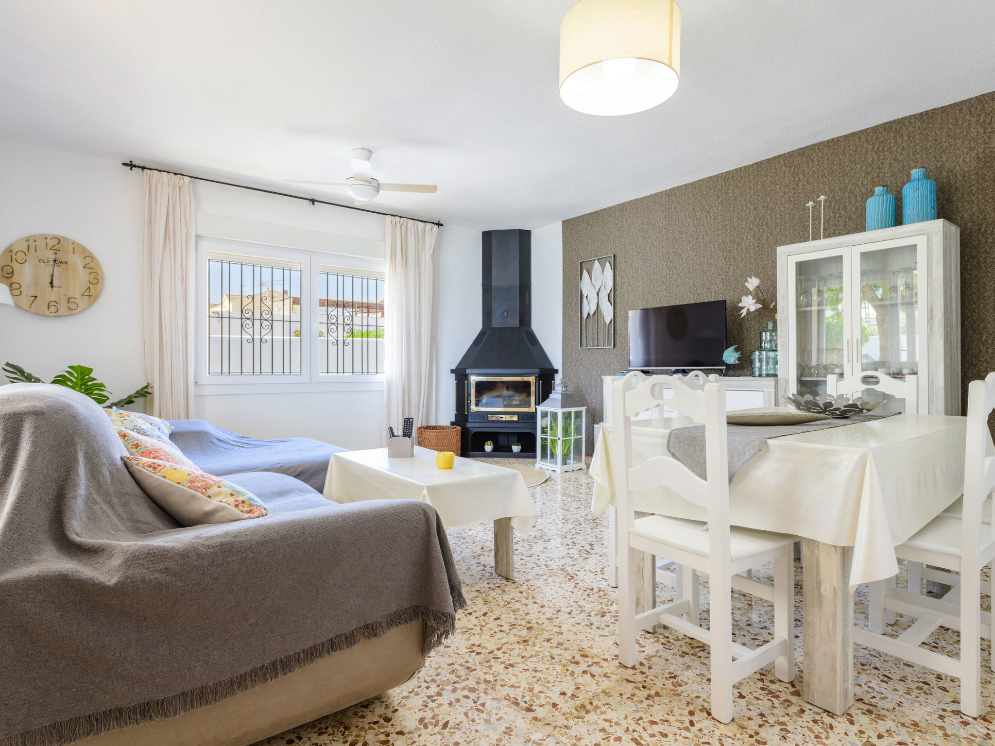 "Villa Lolin", 4-room villa 116 m2. Partly renovated in 2023, practical furnishings: living/dining room with open-hearth fireplace, dining table and satellite TV. 2 rooms, each room with 2 beds (90 cm, length 190 cm). 1 room with 1 french bed (150 cm, length 190 cm). Kitchen (oven, dishwasher, 4 gas rings, toaster, kettle, microwave, freezer, electric coffee machine). Bath/WC, shower/WC. Heating not available in all rooms. Terrace 20 m2, roofed, large garden, lawn. Terrace furniture, barbecue, deck chairs (6), covered balcony. No view. Facilities: washing machine, iron, hair dryer. Internet (WiFi, free). Parking (fenced 2 cars). Please note: maximum 2 pets/ dogs allowed. TV only ES. VT-35066CS // Reg. Nr.: ESFCTU000012009000043067000000000000000000VT-35066CS5