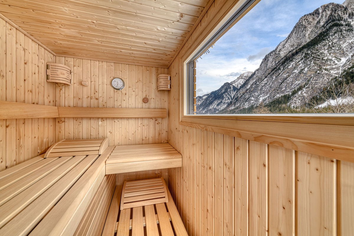 A modern dining area with two large tables invites you to enjoy dining and grilling outside. Sundowners can be enjoyed in the evening sun on the two lounge sofas and deck chairs. The absolute highlight is the Finnish sauna in the garden with a view of the mountains and the town of Brand, which guests can use free of charge.