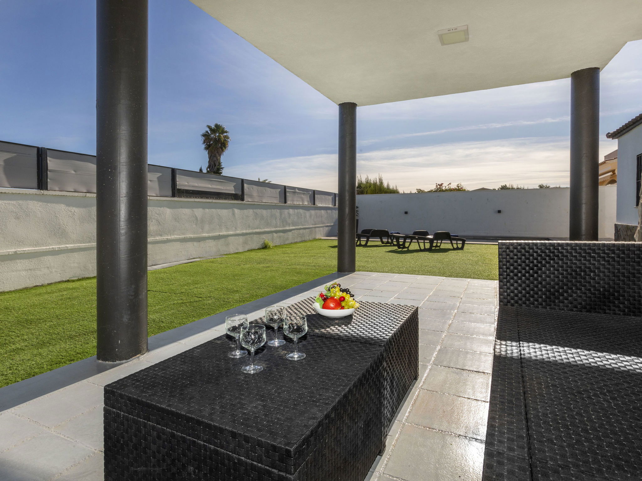 Peñiscola: Large house "Villa Miami", detached, renovated in 2024. 8 houses in the resort. In the resort 500 m from the centre of Peñiscola, in a quiet position residential area (villas), 850 m from the sea, 850 m from the beach. Private: large garden (fenced) with lawn, swimming pool angular (seasonal availability: 01.Apr. - 15.Oct.). Outdoor shower, patio (30 m2). In the house: washing machine. Parking on the premises. Supermarket 600 m, shopping centre 5.5 km, restaurant 500 m, bar 700 m, bakery 900 m, bus stop "Plaza Constitución" 900 m, railway station "Benicarló-Peñíscola" 10 km, sandy beach "Playa Sur". Golf course (18 hole) 30 km. Nearby attractions: Castillo de Peñiscola 1.8 km, Laberinto Peñiscola (más grande España) 7 km, Port Aventura 120 km, Ciutat de les Arts i les Ciències 140 km, Delta del Ebro 45 km, Morella 75 km. Hiking paths: Parque Natural Sierra de Irta 4.5 km. Please note: no lift. Groups of teenagers on request only. Neighbourhood highly sensitive to noise. Quietness and good behaviour expected.