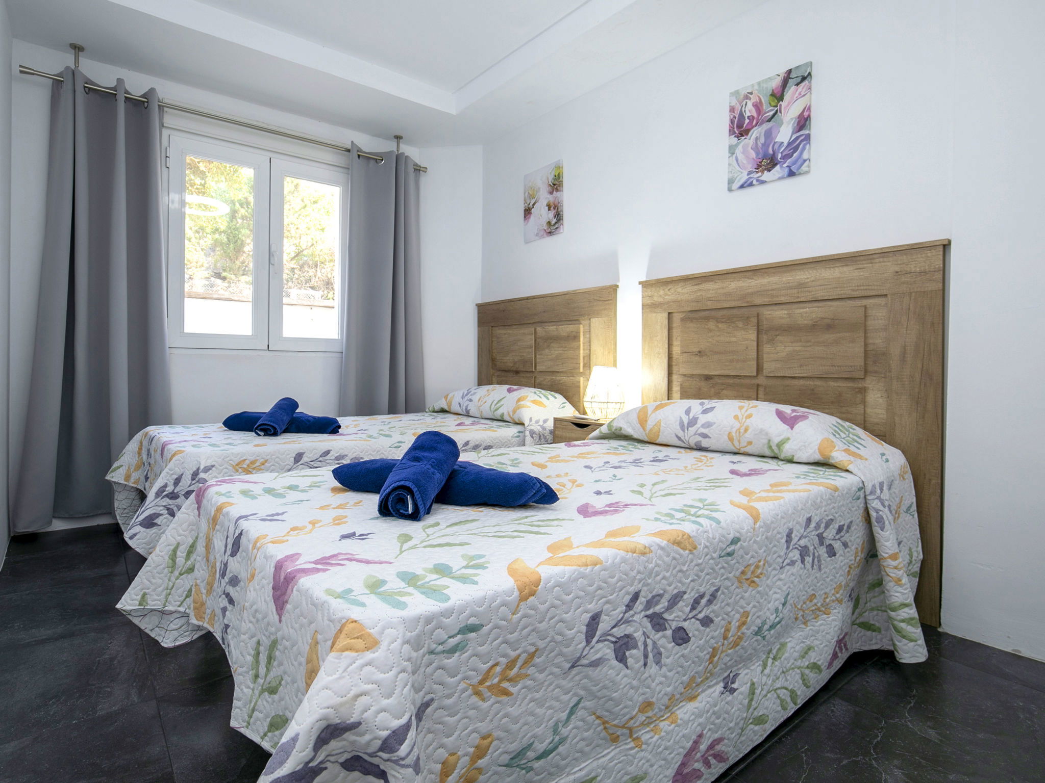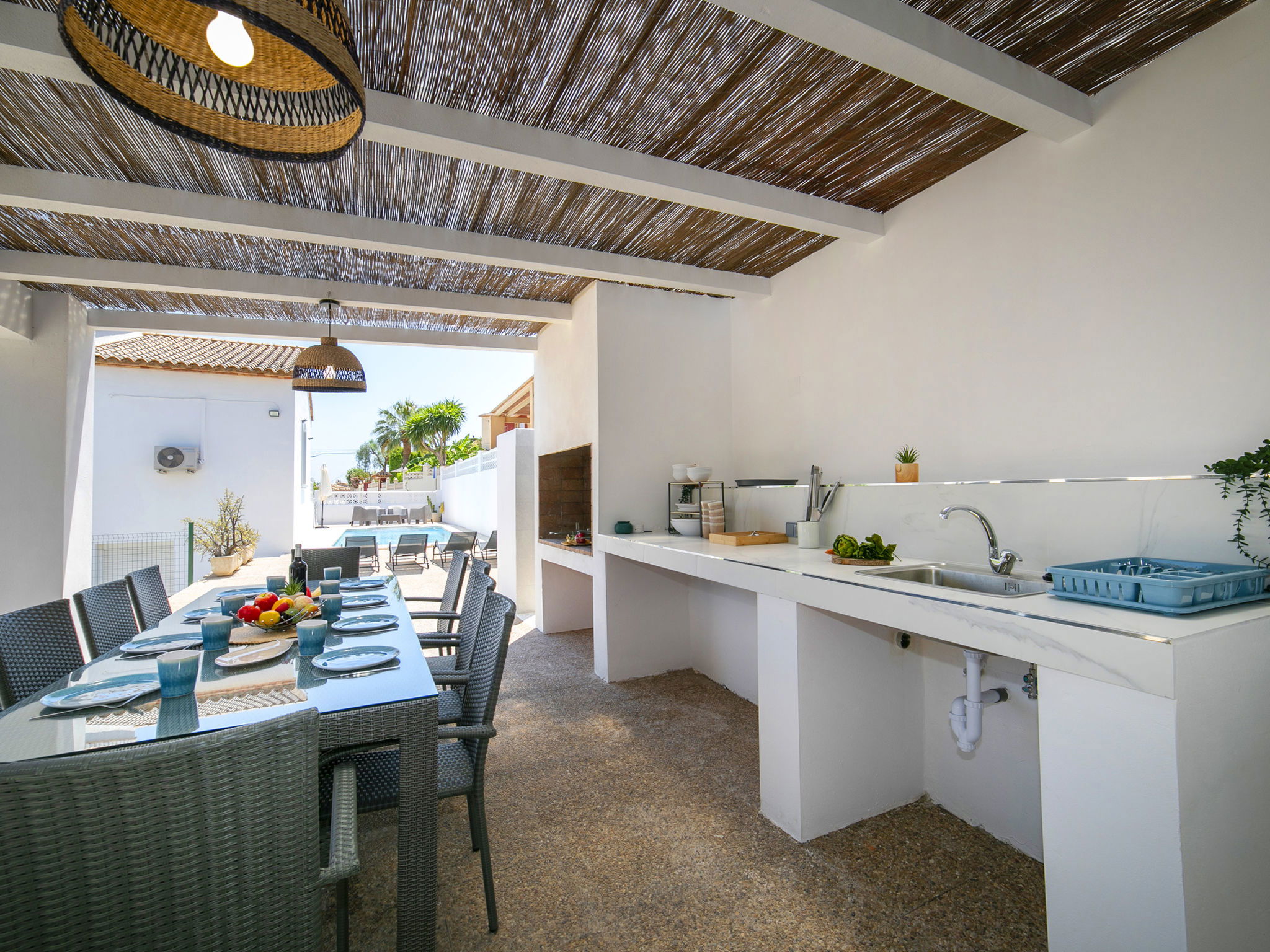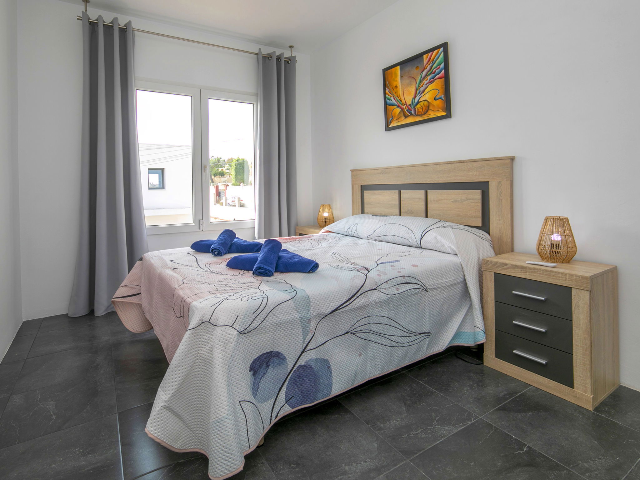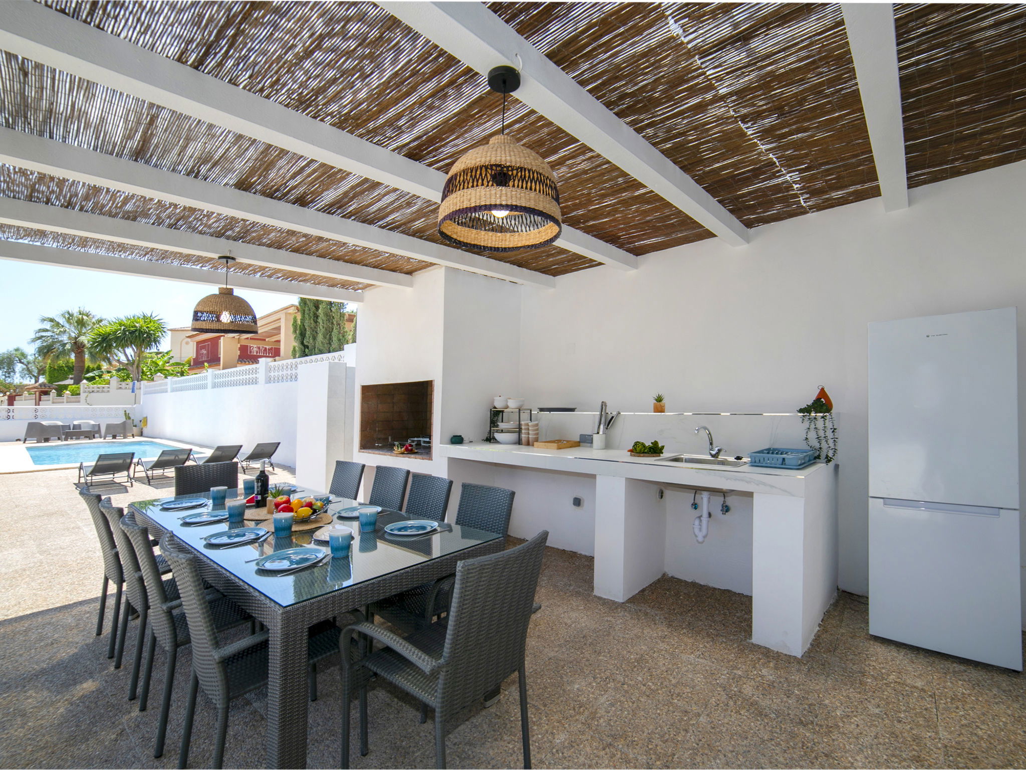 Canuta de Ifach: Beautiful, cosy villa "Guadalete", 2 storeys, renovated in 2023. In the district Canuta de Ifach, residential area (villas), 1.8 km from the sea, 1.8 km from the beach. Private: natural state property (fenced), swimming pool angular (seasonal availability: 01.Jan. - 31.Dec.). Garden furniture, barbecue, parking on the premises. Grocery 3 km, supermarket 3 km, restaurant 1.8 km, bakery 3 km, bus stop 1.7 km, sandy beach "Playa del Arenal" 3.2 km, swimming bay 1.8 km. Sports harbour 5.9 km, marina 5.9 km, surf school 5.9 km, sailing school 5.9 km. Nearby attractions: Peñon de Ifach 6 km, Aqualandia 25 km, Terra Mitica 35 km.