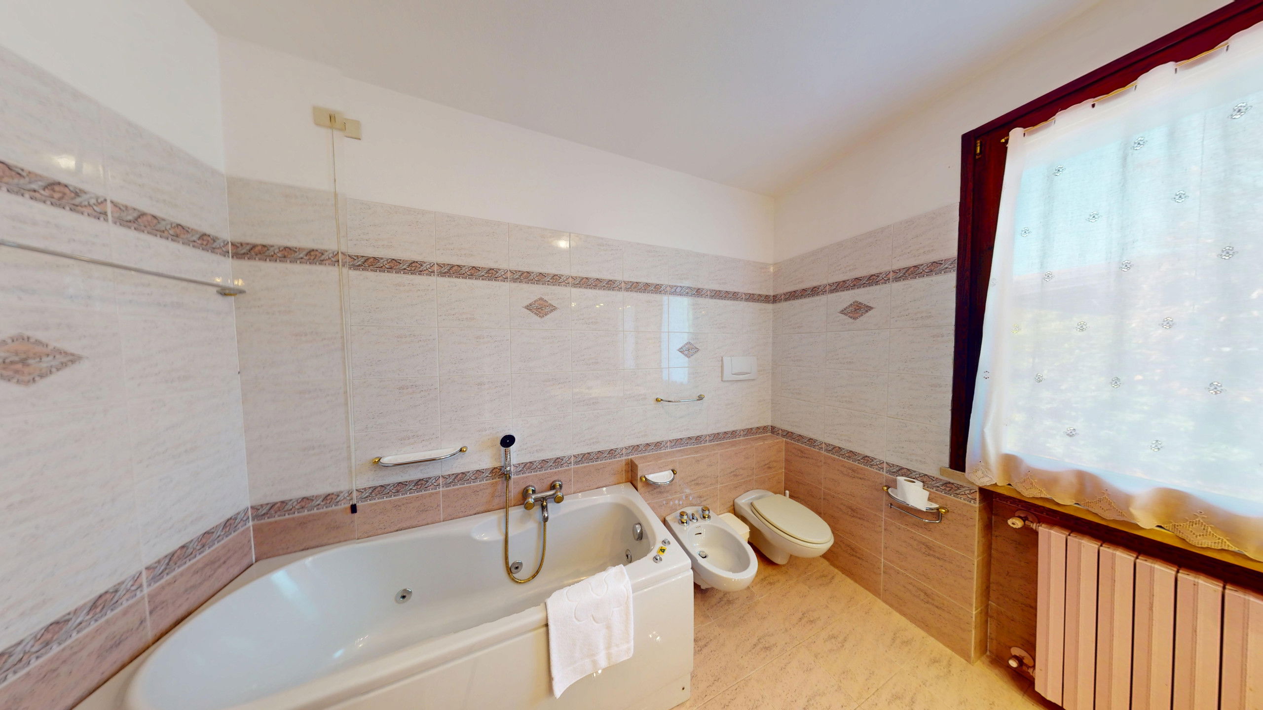 The accommodation has three bedrooms, carefully furnished with two double beds and a single bed, capable of comfortably accommodating up to 5 people. The rooms are equipped with air conditioning in the living room and bedroom area, while electric heating ensures optimal comfort throughout the year.