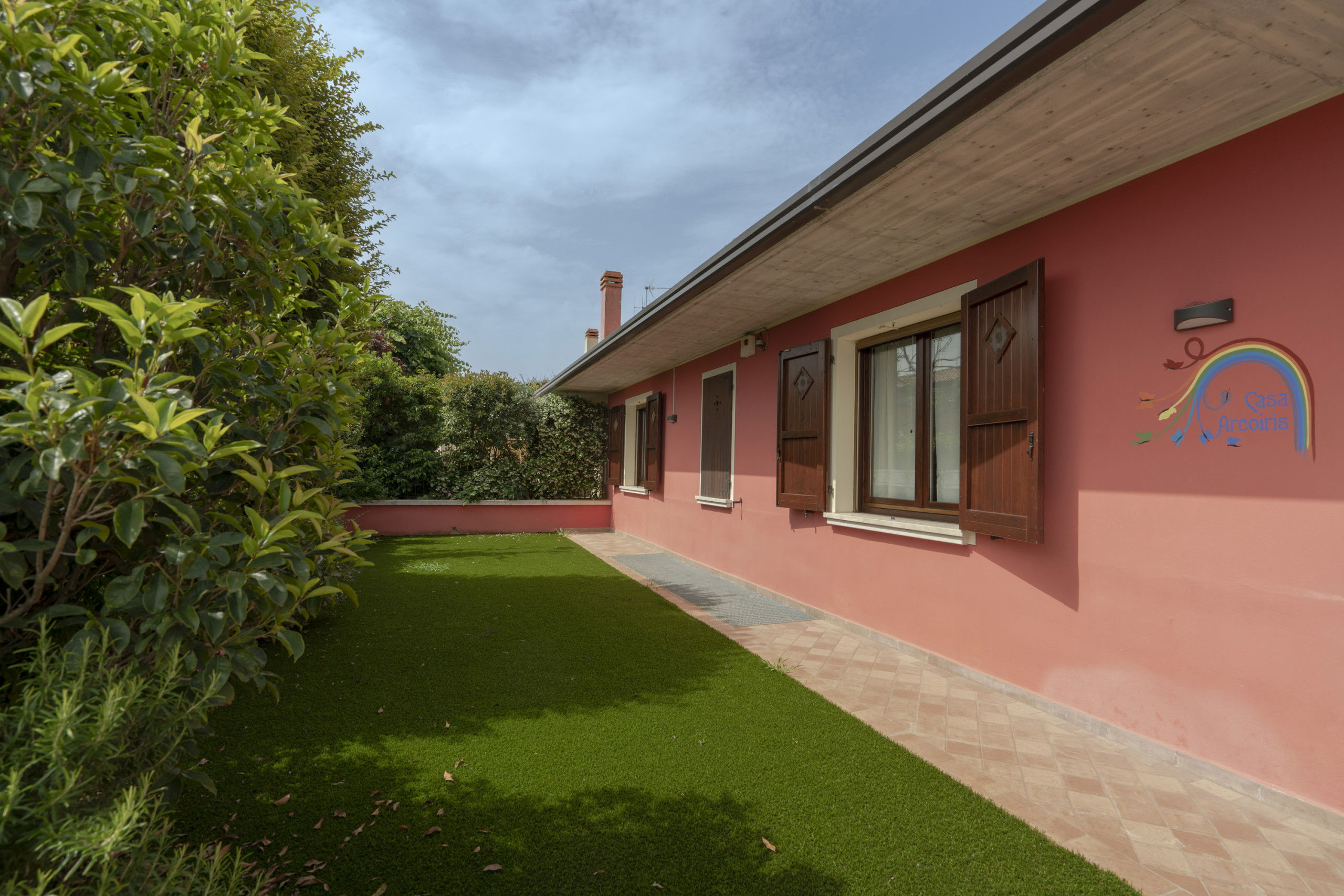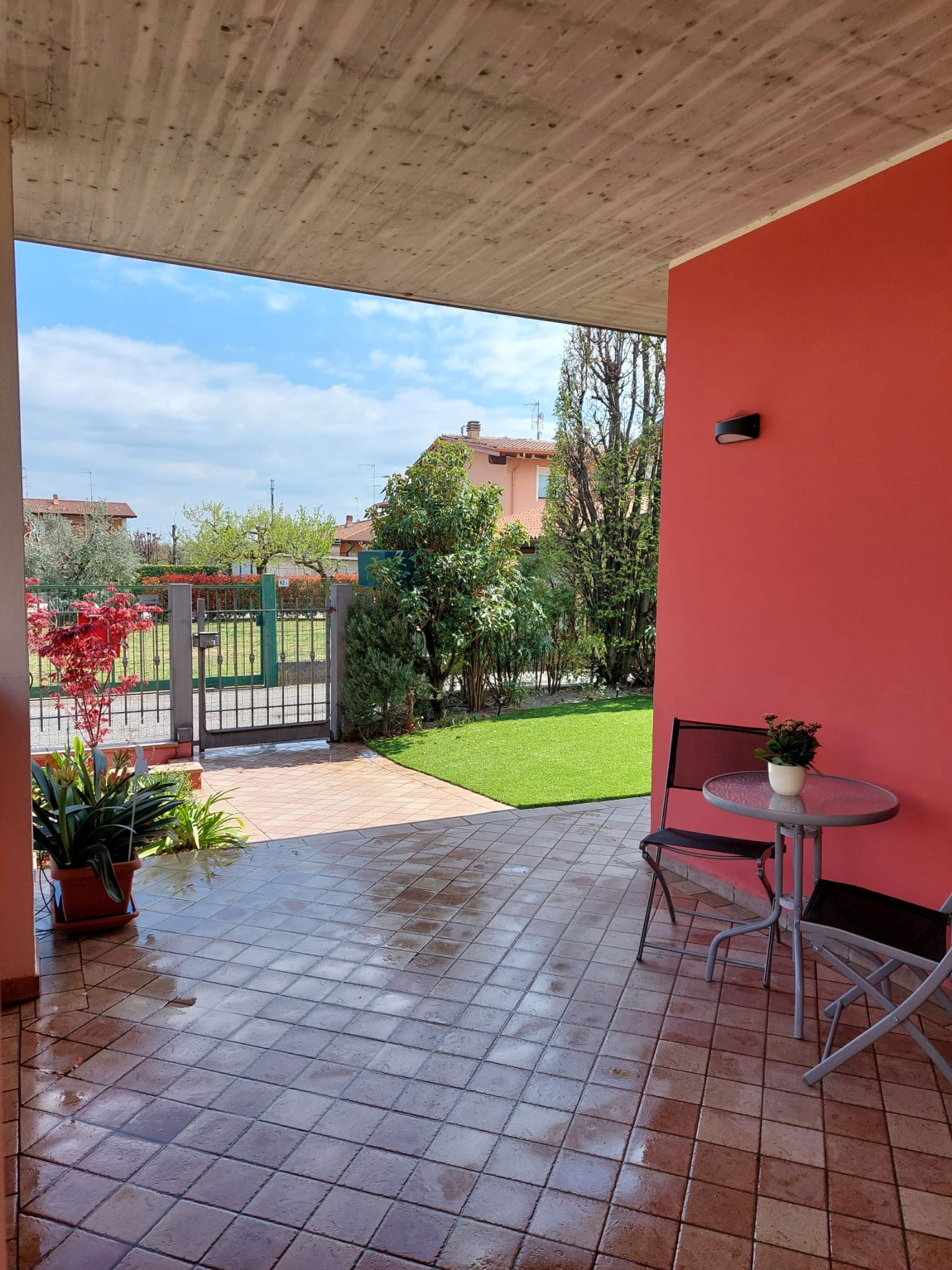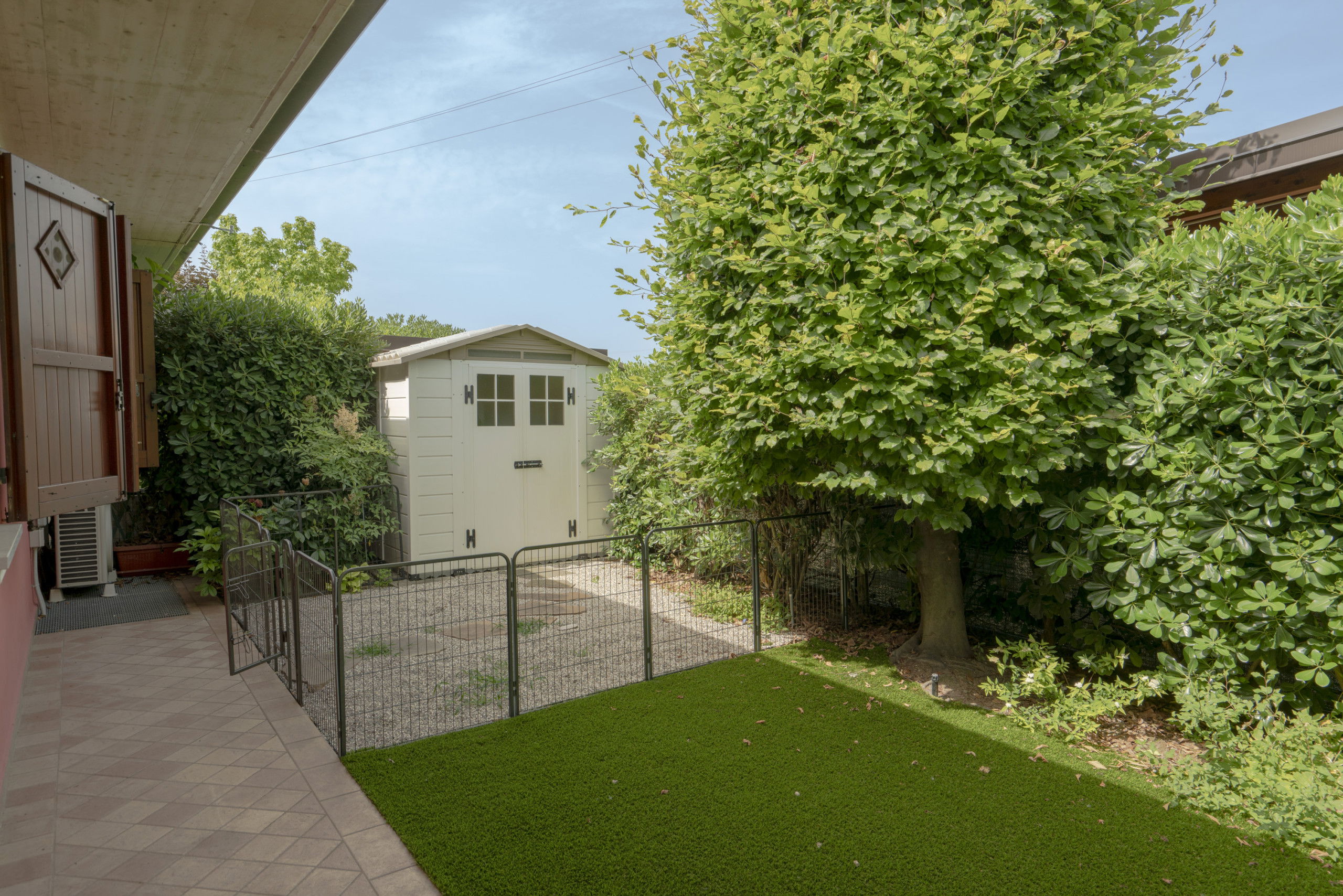The external spaces are particularly well-maintained, with a 150 sqm garden of synthetic grass enclosed and furnished with garden furniture, perfect for outdoor relaxation moments. The property is pet-friendly, allowing up to two pets, and features two private parking spaces outside.