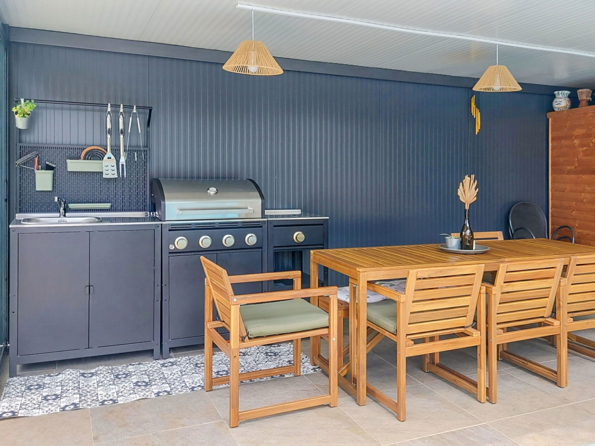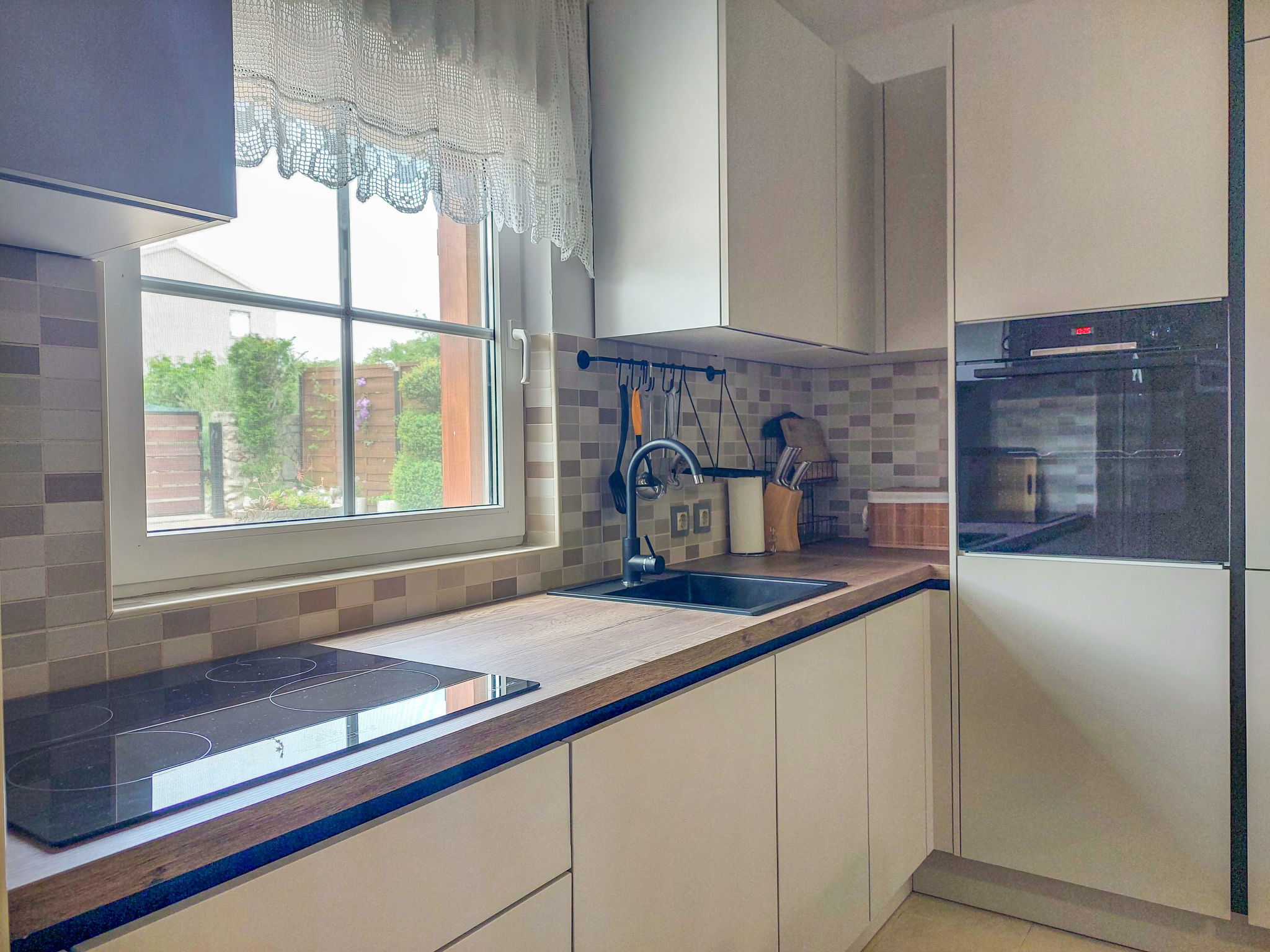 6-room house 110 m2 on 2 levels. Living/dining room with satellite TV and air conditioning. Exit to the terrace. 1 room with 1 french bed (160 cm, length 200 cm). 2 rooms, each room with 1 french bed (140 cm, length 200 cm). Open kitchen (oven, dishwasher, 4 ceramic glass hob hotplates, toaster, kettle, microwave, freezer, electric coffee machine). 2 showers/WC. Upper floor: (exterior staircase) living/dining room with sloping ceilings with 1 double sofabed (140 cm, length 200 cm), satellite TV and air conditioning. Exit to the balcony. 1 room with sloping ceilings with 1 french bed (160 cm, length 200 cm). Open kitchen (2 hot plates, toaster, kettle, electric coffee machine). Shower/WC. Heating (extra), air-conditioning (extra). Balcony 4 m2. Deck chairs. Facilities: mosquito net, baby cot. Internet (WiFi, free). Please note: non-smoking house. Maximum 3 pets/ dogs allowed. No internal connecting door between the floors. One shower/WC on the ground floor is located outside the house. When there are less than the maximum number of guests staying at the property, one floor will not be available for use.