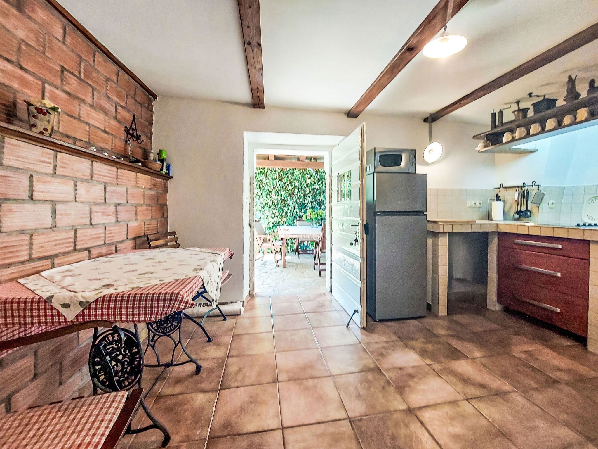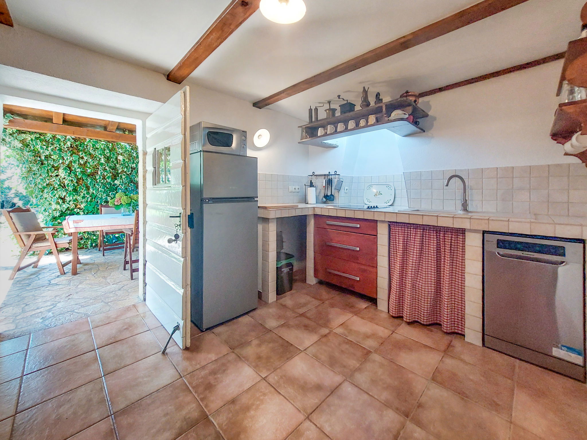4-room house 70 m2 on 2 levels. Dining room with dining table. Kitchen (dishwasher, 4 ceramic glass hob hotplates, toaster, kettle, microwave, freezer, electric coffee machine). Exit to the terrace. Shower/WC. Upper floor: (exterior staircase) entrance hall with air conditioning. Exit to the terrace. Living room with 1 double sofabed and satellite TV. 1 room with 1 double bed (2 x 80 cm, length 200 cm). 1 room with 1 french bed (160 cm, length 200 cm). Open kitchen (2 hot plates, oven, 2 gas rings, freezer). Bath/WC. No heating option. Terrace 28 m2, terrace 30 m2, roofed. Terrace furniture, deck chairs (2). Facilities: children's high chair, baby cot. Internet (WiFi, free). Please note: non-smoking house. Maximum 2 pets/ dogs allowed. No internal connecting door between the floors. UP/I-335-03/06-01/594 Ur.broj:2170-83-03-06-3