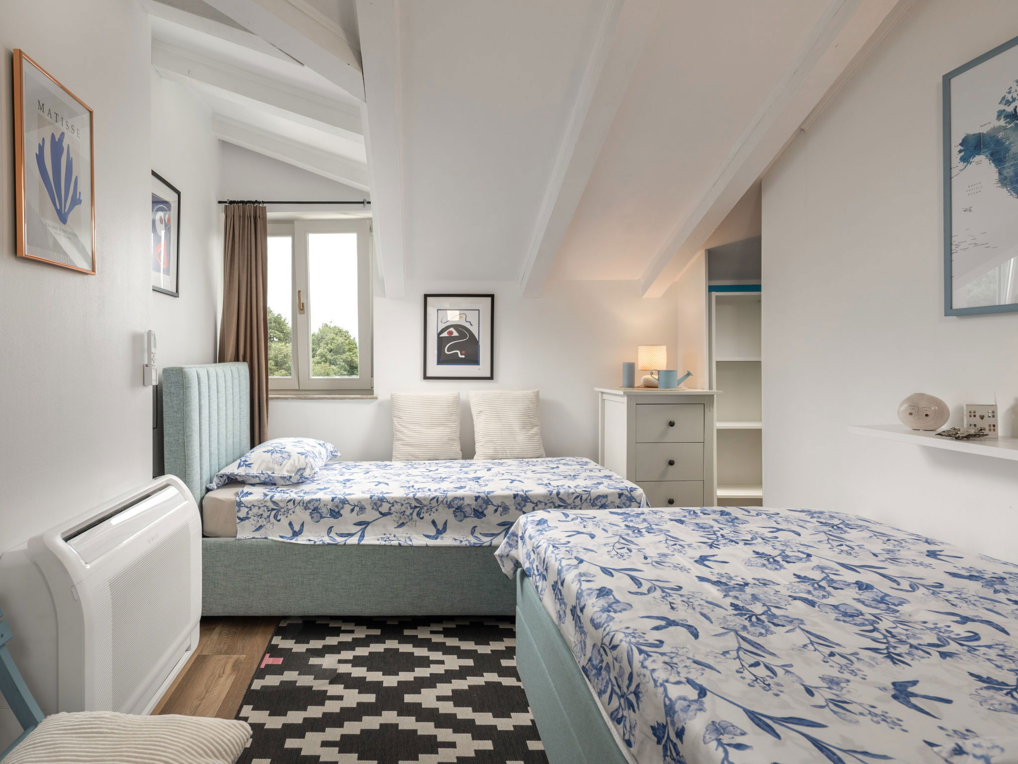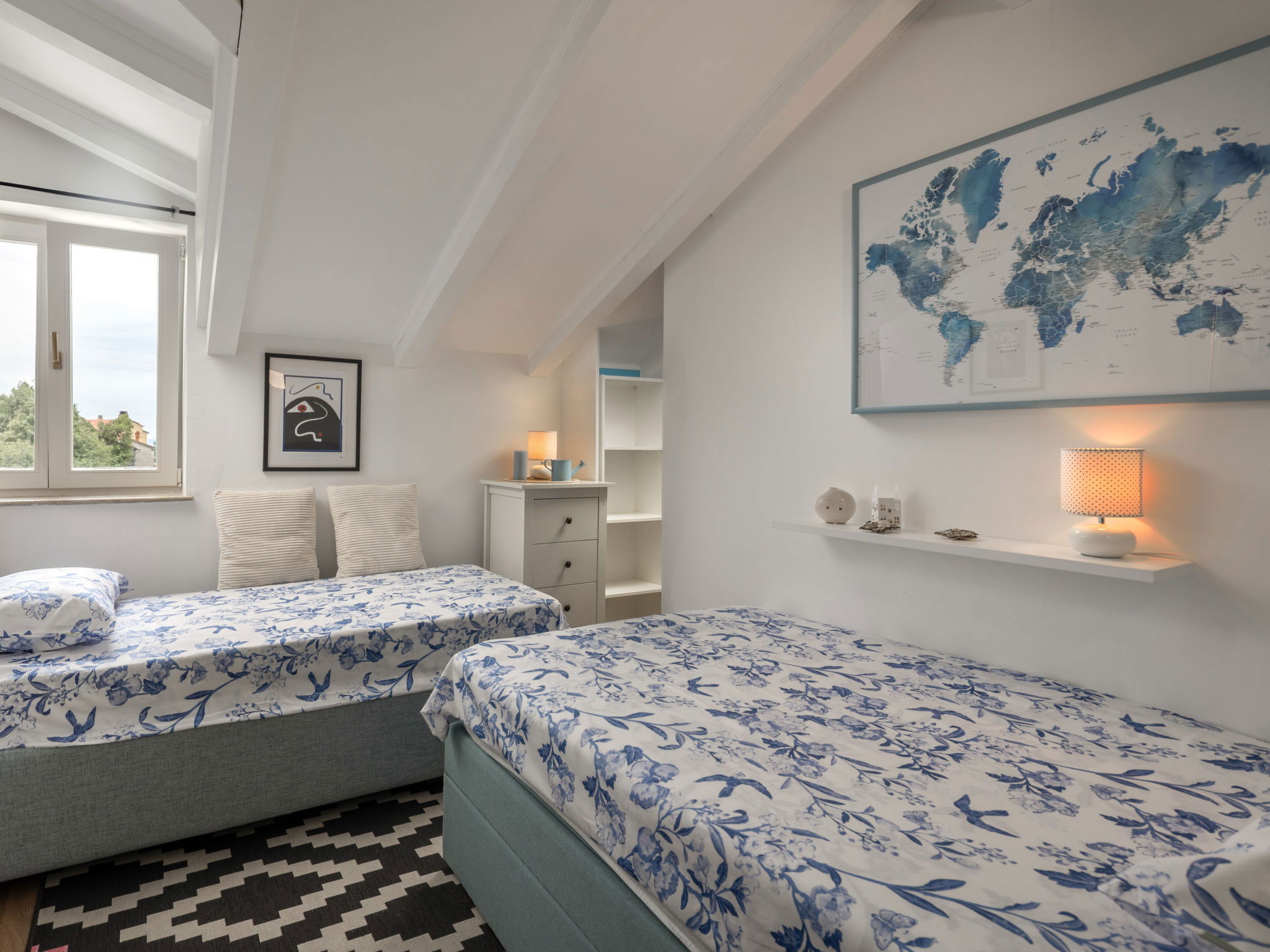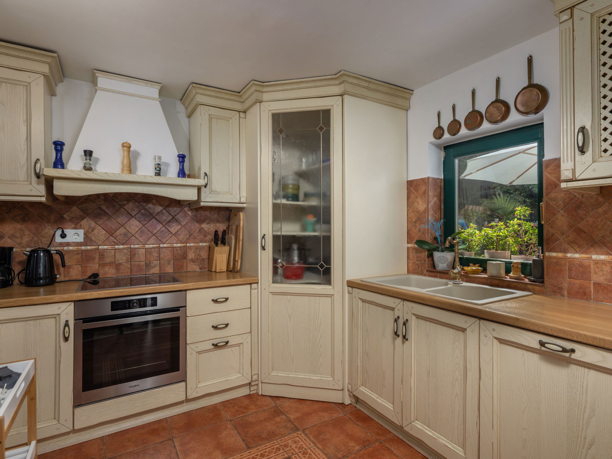 3-room semi-detached house 110 m2 on 2nd floor. Beautiful and tasteful furnishings: living/dining room with satellite TV and air conditioning. Exit to the balcony. Open kitchen (oven, dishwasher, 4 ceramic glass hob hotplates, toaster, freezer, electric coffee machine). Sep. WC. Top floor: entrance hall with sloping ceilings, ceiling height 160 - 240 cm. 1 room with sloping ceilings, ceiling height 160 - 240 cm with 2 beds (90 cm, length 200 cm), air conditioning. 1 room with sloping ceilings, ceiling height 160 - 240 cm with 1 double bed (160 cm, length 200 cm), air conditioning. Bath/WC. No heating option. Balcony 12 m2, terrace 42 m2. Terrace furniture, deck chairs. Partial view of the sea. Facilities: hair dryer. Internet (WiFi, free). Suitable for families. 1 small pet/ dog allowed. 2717/XIV