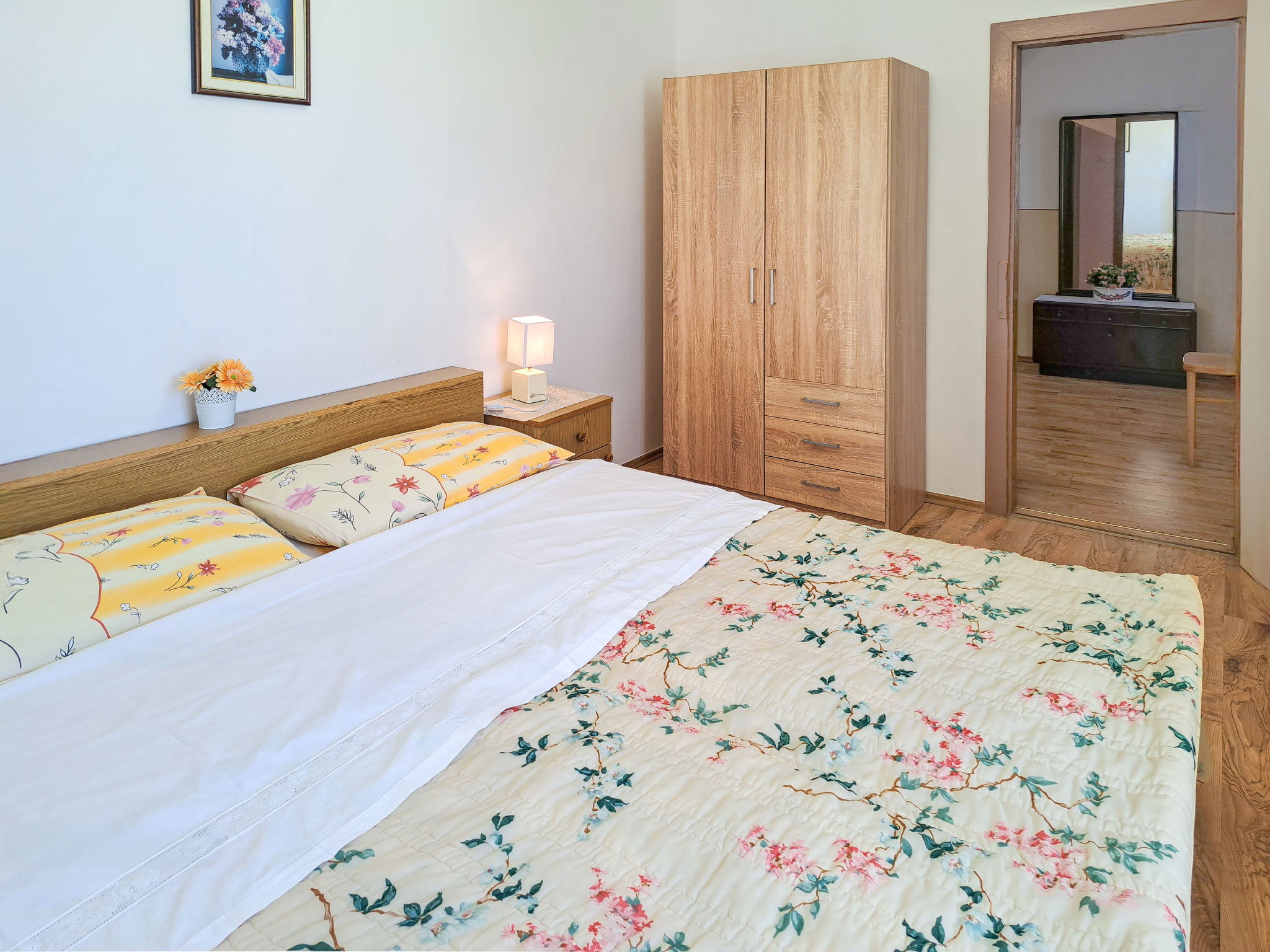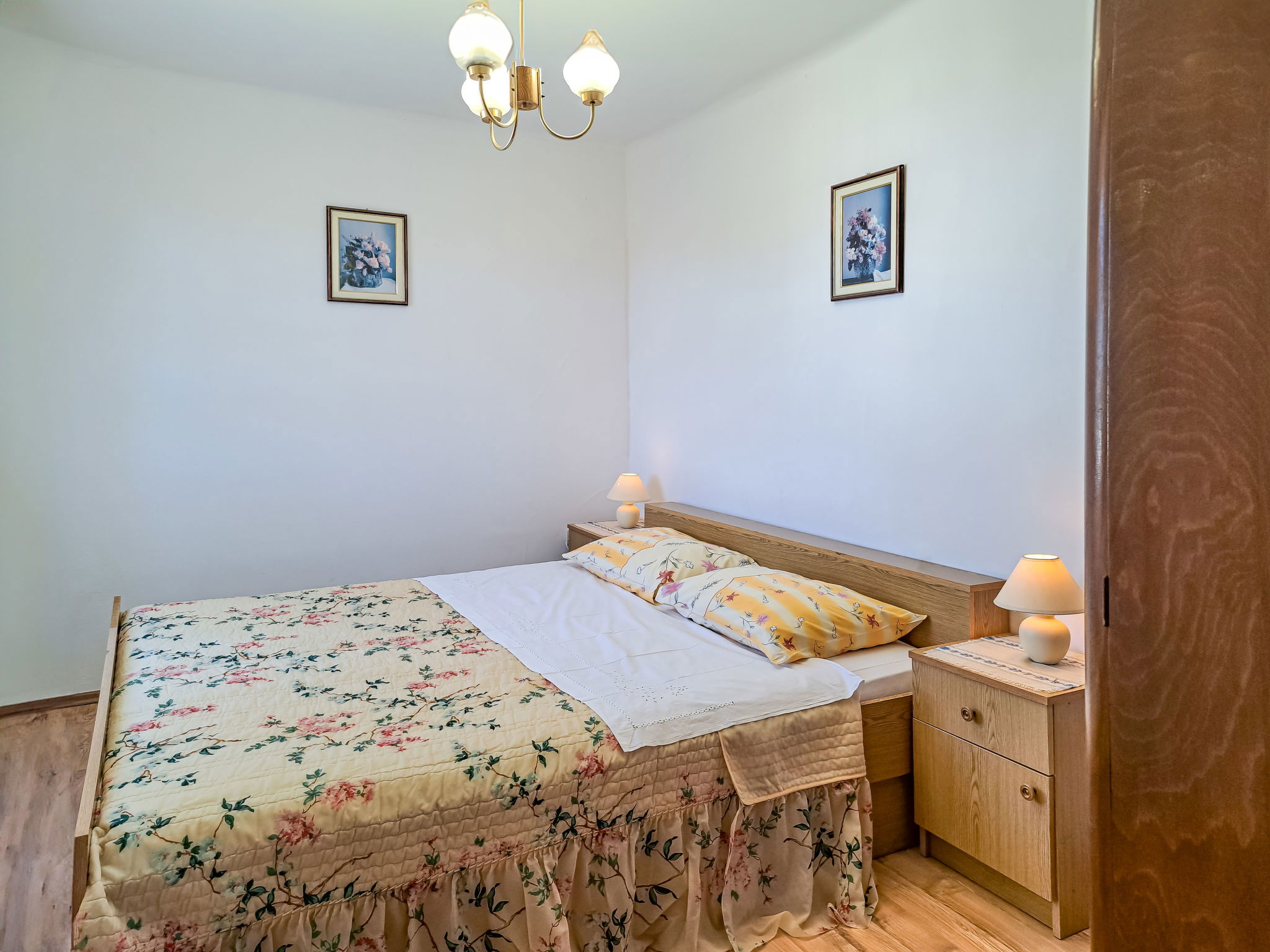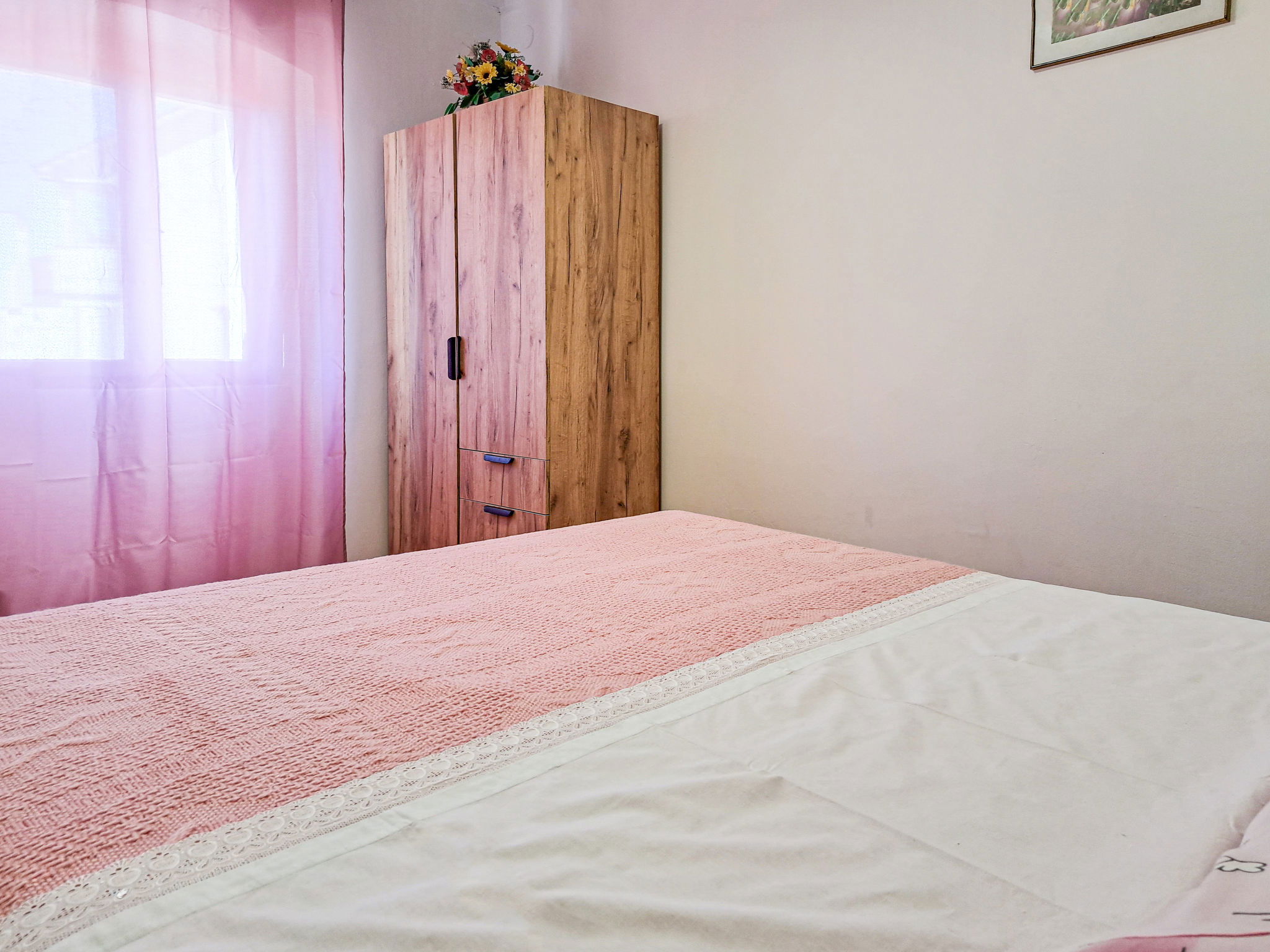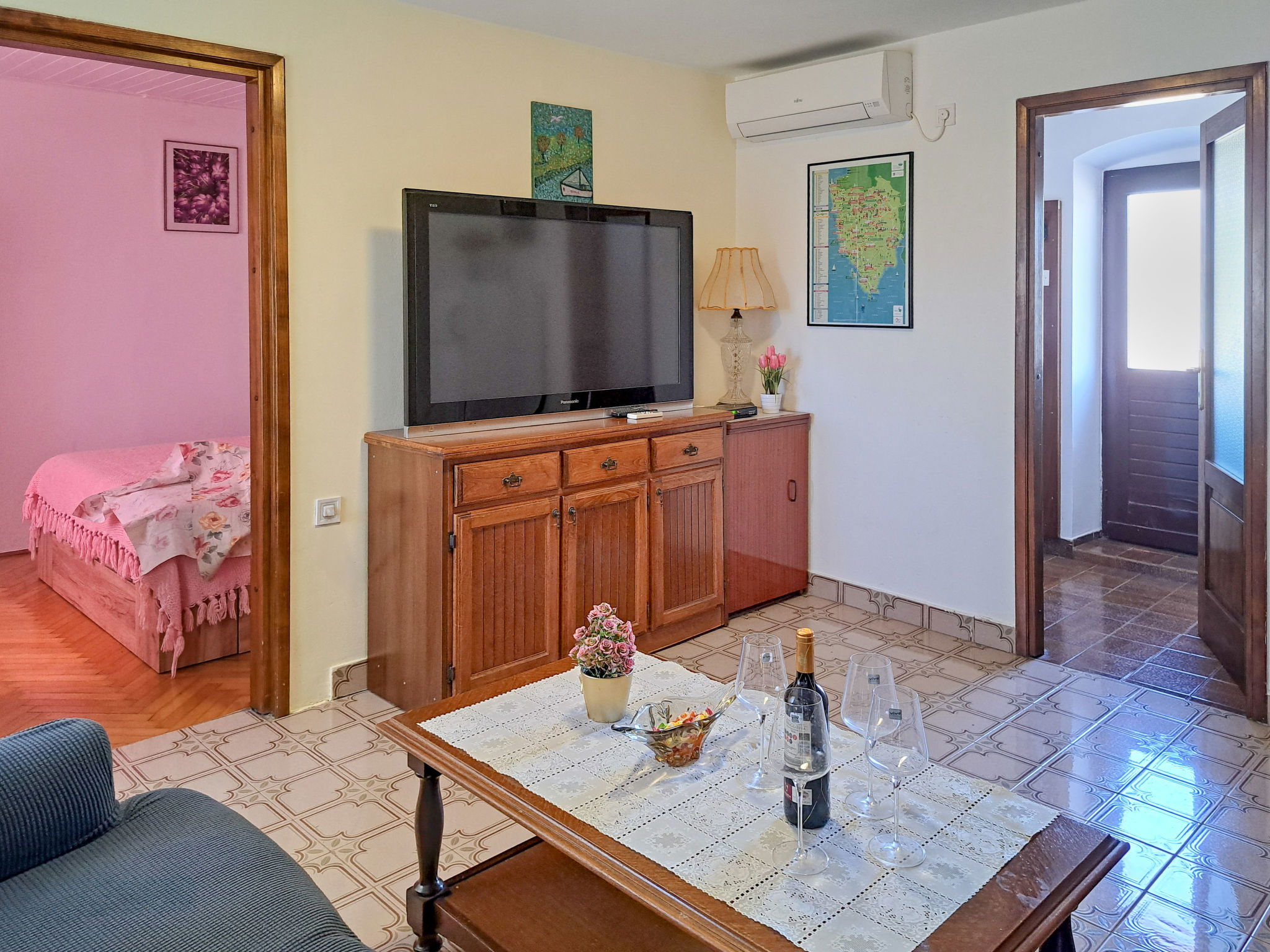 4-room terraced house 80 m2 on 2 levels. Upper floor: living room with satellite TV and air conditioning. Exit to the terrace. 1 room with 1 french bed (160 cm, length 200 cm). Dining room. Open kitchen (1 hot plate, oven, 3 gas rings, toaster, kettle, microwave, electric coffee machine). Bidet, bath/shower/WC. 2nd upper floor: 1 room with 1 french bed (160 cm, length 200 cm). 1 room with 2 beds. No heating option. Terrace. Terrace furniture, barbecue (portable). Facilities: Internet (WiFi, free). Please note: non-smoking house. Maximum 1 pet/ dog allowed. 2471/1