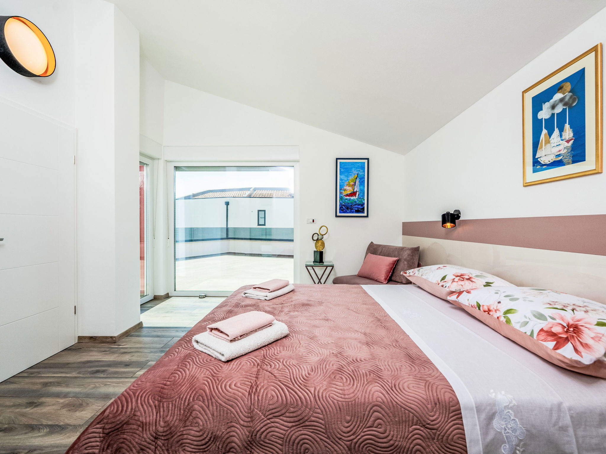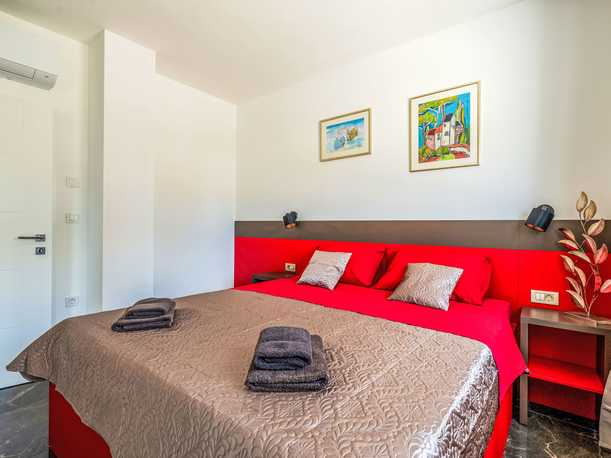 4-room villa 165 m2 on 2 levels. Living/dining room with satellite TV (flat screen), air conditioning. Exit to the swimming pool. 1 room with 1 double bed (2 x 90 cm, length 200 cm), shower/WC and satellite TV (flat screen), air conditioning. Open kitchen (oven, dishwasher, 4 ceramic glass hob hotplates, kettle, freezer, electric coffee machine). Sep. WC. Upper floor: 1 room with 1 sofabed (90 cm, length 190 cm), 1 french bed (160 cm, length 200 cm), shower/bidet/WC and satellite TV (flat screen), air conditioning. Exit to the terrace. 1 room with panoramic window with 1 french bed (160 cm, length 200 cm), shower/WC and satellite TV (flat screen), air conditioning. Exit to the terrace. Terrace 55 m2. Deck chairs. Beautiful view of the sea. Facilities: Internet (WiFi, free). Maximum 1 pet/ dog allowed.