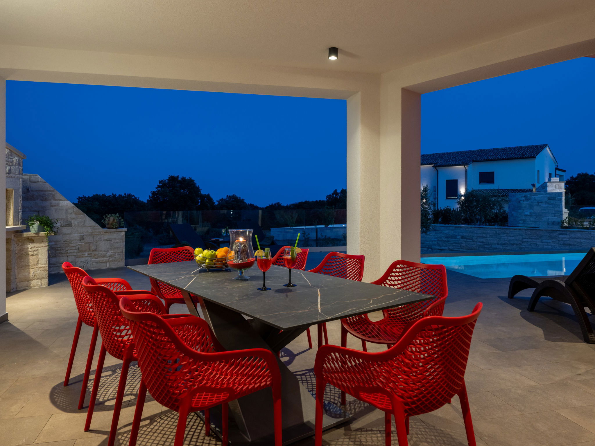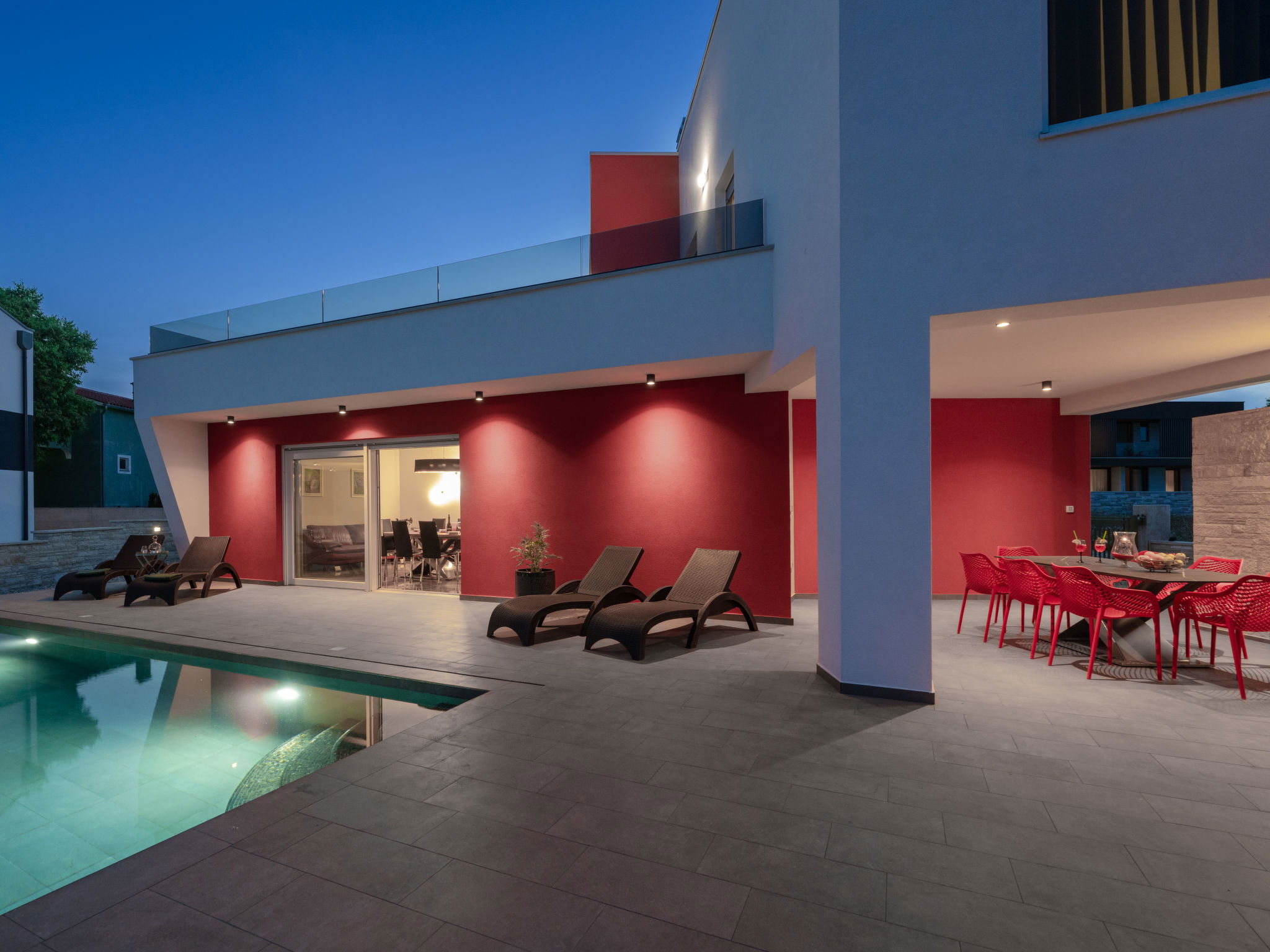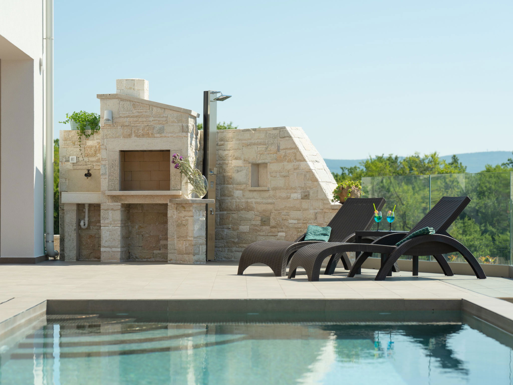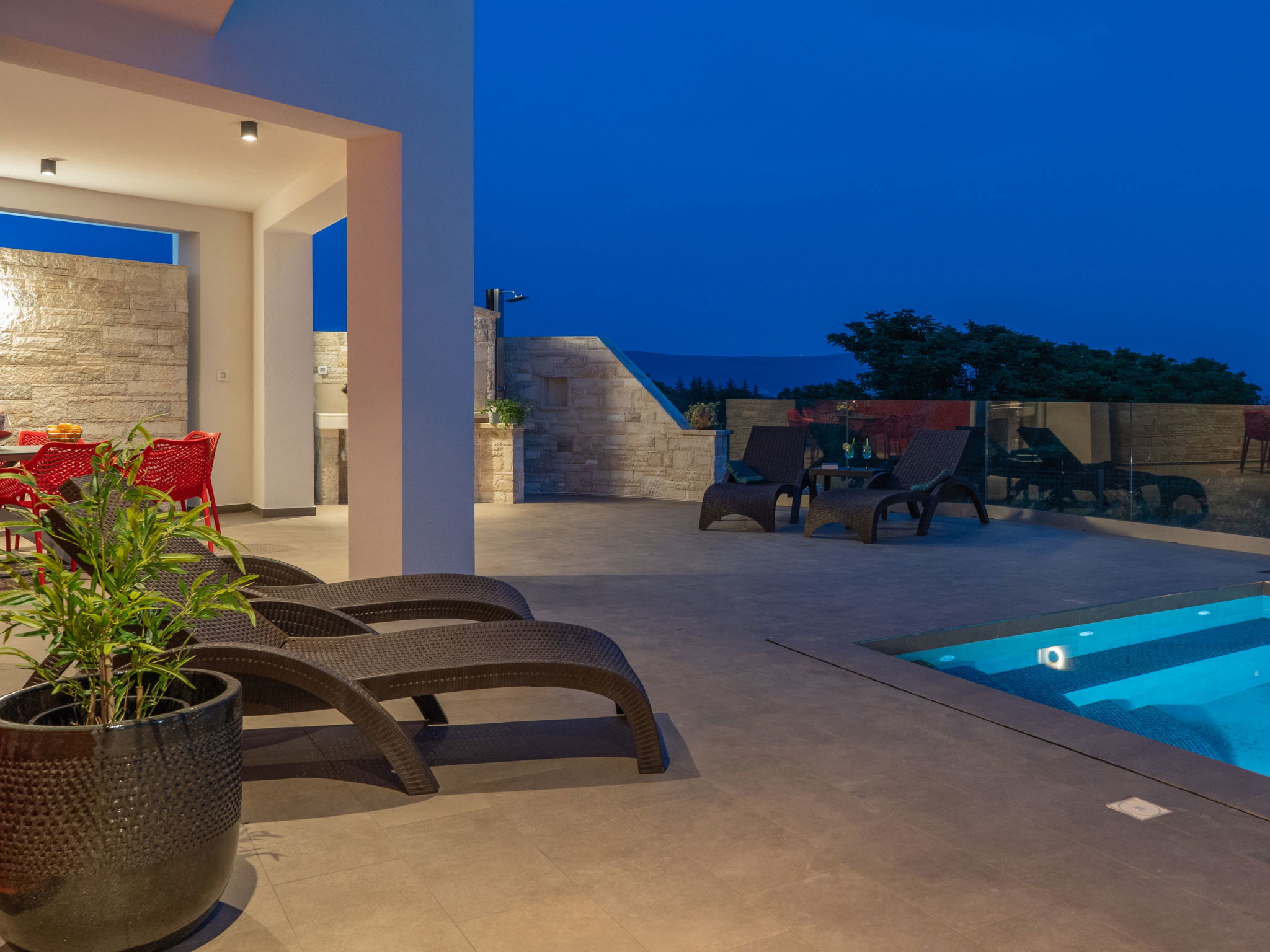 Krnica 22 km from Pula: Modern, beautiful villa "Lumi". In a quiet, sunny position, 2.5 km from the sea, 2.5 km from the beach. Private: property 650 m2 (fenced), garden with flowers and trees, swimming pool angular (8 x 3 m, 28 m2, depth 140 cm, seasonal availability: 01.Jan. - 31.Dec.) with internal staircase. Outdoor shower, terrace (20 m2), garden furniture, barbecue, pool maintenance by the owner/gardener. In the house: internet access, washing machine. Parking (for 2 cars) at the house on the premises. Shop, restaurant 200 m, bus stop 500 m, pebble beach 5 km, rocky beach 2.5 km, indoor swimming pool 5 km. Tennis 5 km, riding stable 6 km, sports centre 5 km, walking paths from the house 3 km, cycle lane 3 km.