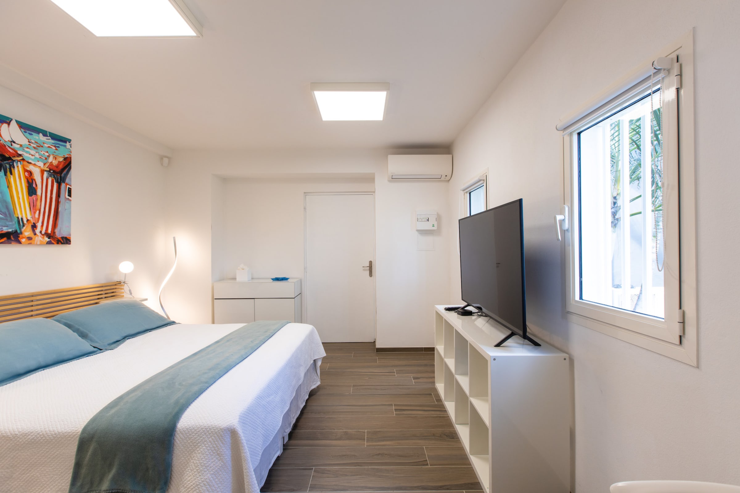 The living room is equipped with a TV, air conditioning, and fans for your comfort, while the covered terrace is also equipped with fans, providing a cool and relaxing space to enjoy the surrounding beauty.