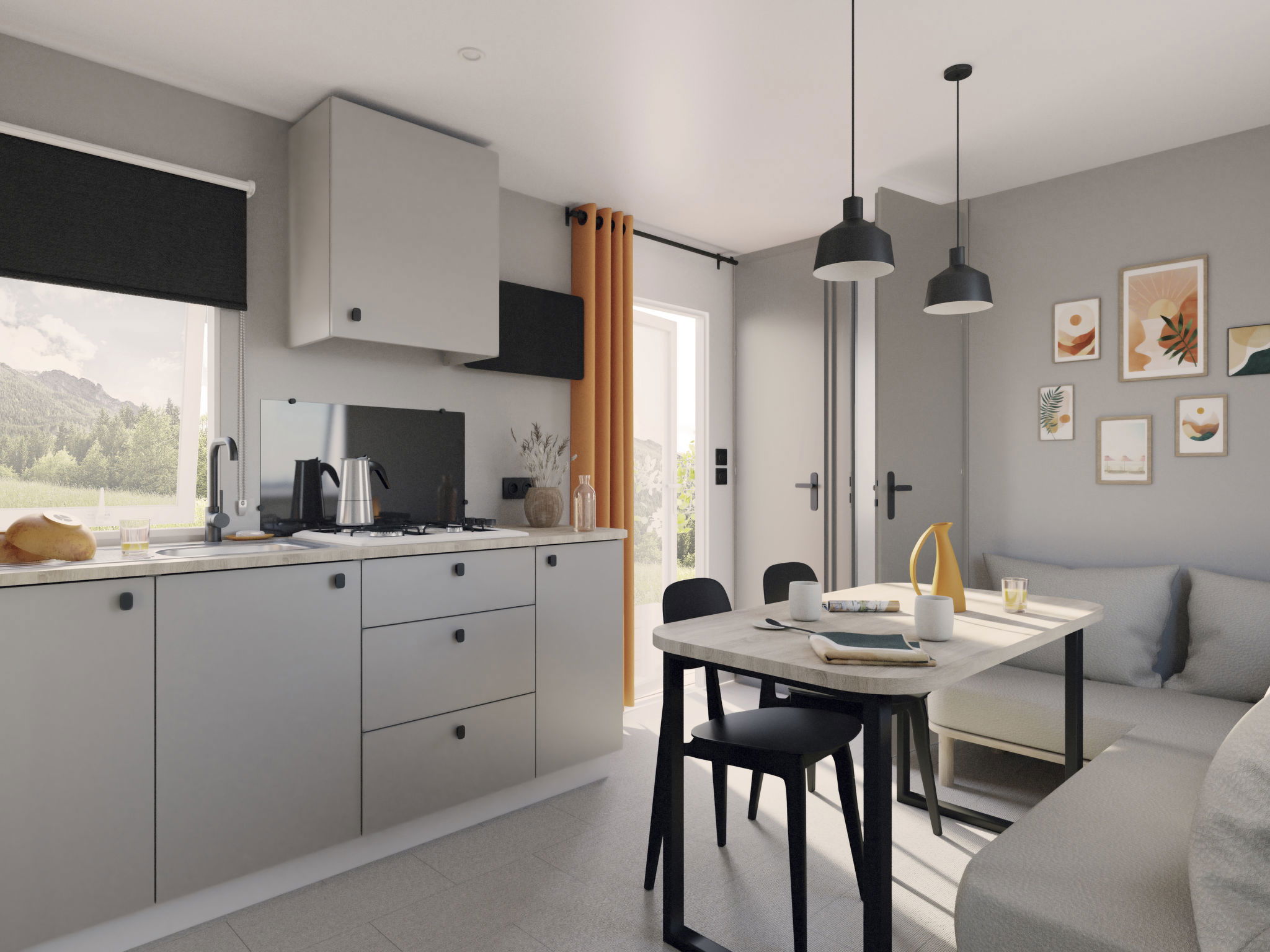 "Camping La Plage", 3-room mobile home 23 m2. Practical furnishings: living/dining room with TV (flat screen). Exit to the terrace. 1 room with 1 french bed (140 cm, length 190 cm). 1 room with 2 beds (70 cm, length 190 cm). Kitchenette (4 gas rings, microwave, freezer, electric coffee machine). Shower, sep. WC. Air-conditioning, forced-air heating. Terrace partly roofed. Terrace furniture. Facilities: children's high chair, baby cot for up to 2 year olds (extra). Internet (WiFi, extra). Please note: maximum 1 pet/ dog allowed. Smoke alarm.