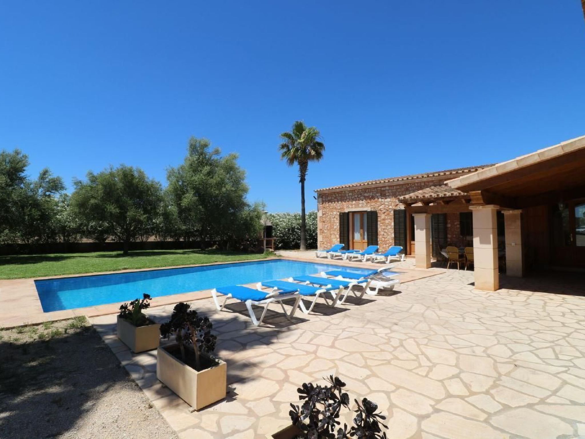In the south of Mallorca, not far from the town of Campos and close to the famous Es Trenc beach, Finca Can Filadelfo is situated on a plot of approx. 15,000 sqm in a very quiet location. The distance to Campos is approx. 4 km and the beaches in the south of Mallorca can be reached quickly by car. The newly built, rustic Mallorcan house has space for eight people and a small child. Four bedrooms and three bathrooms are available. There is also a spacious living and dining area and a kitchen. The total living space is approx. 250 square metres, internet access and AC in all rooms, and outside there is a spacious terrace adjoining the living room, which is partially covered. The furnished and covered area is ideal as an outdoor dining area and a 10 m x 5 m pool, which is also flanked by terrace areas, is located in a large garden. There is a barbecue area with a brick-built barbecue a little off to the side.charging facilities for an e-car with Schuco system on request.for groups of up to 14 people, booking in combination with the neighbouring Finca Can Acebal (8 people) is ideal.special features:- close to Es Trenc beach- child-friendly- barrier-free / friendly construction- charging facilities for e-cars- AC in all rooms- quiet location- large plot- internet- final price including additional costs - bedroom: the cot is a baby bed for children up to 2 years