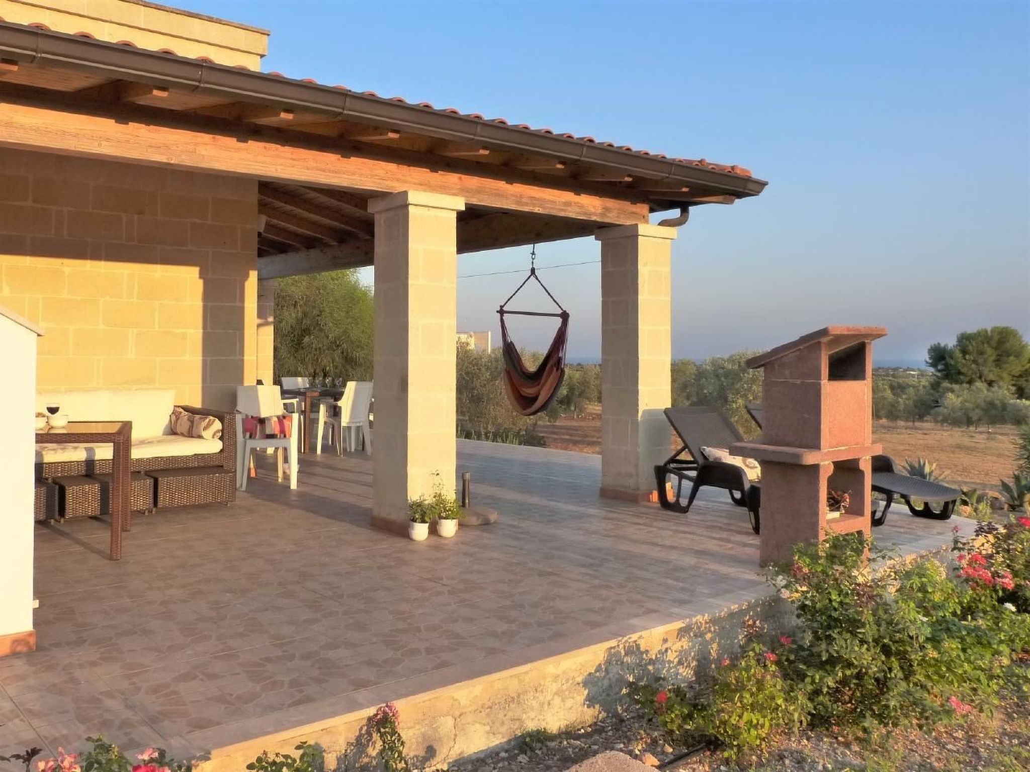 - Covered veranda with brick barbecue, table and chairs, rattan sofa
