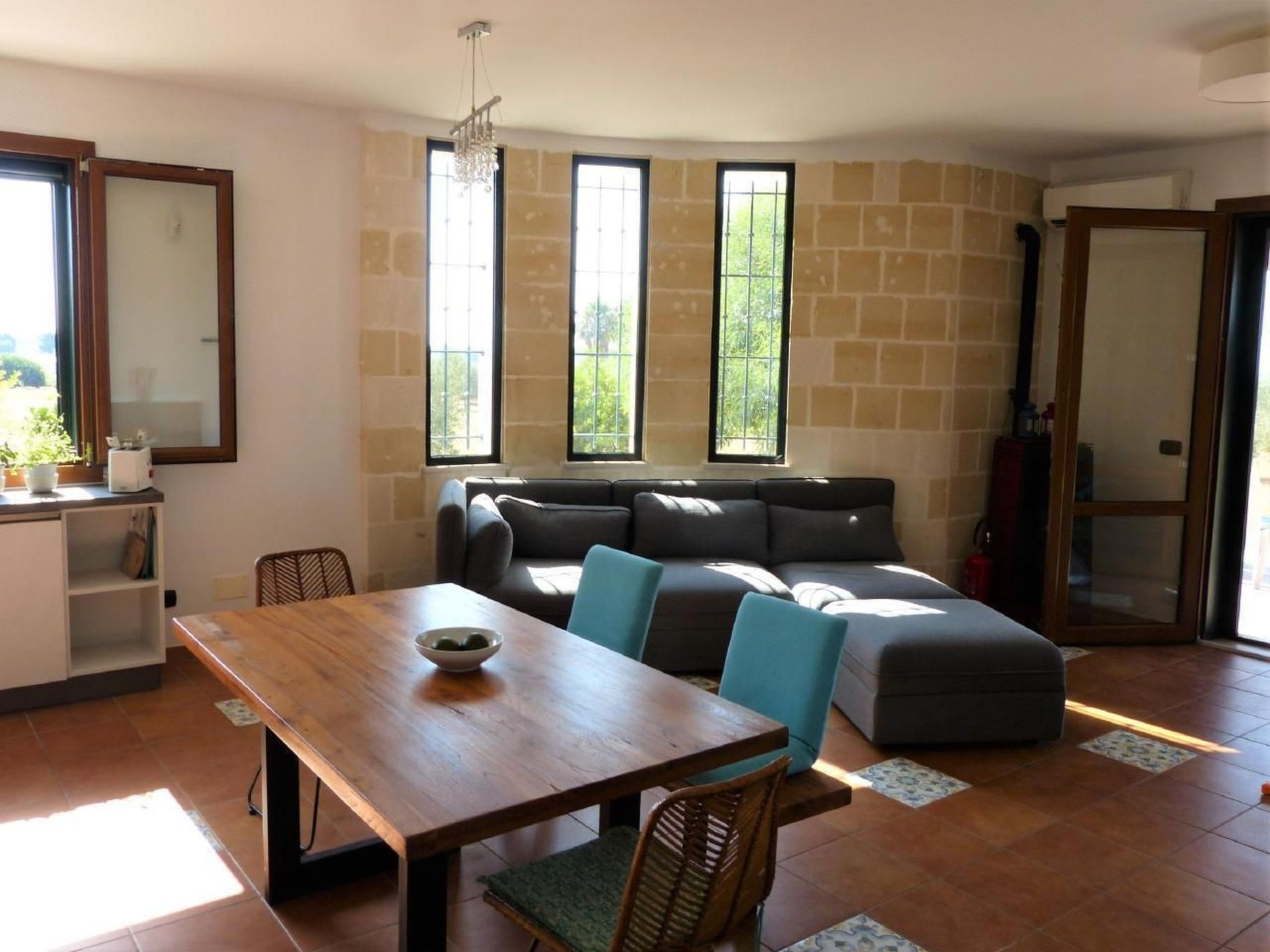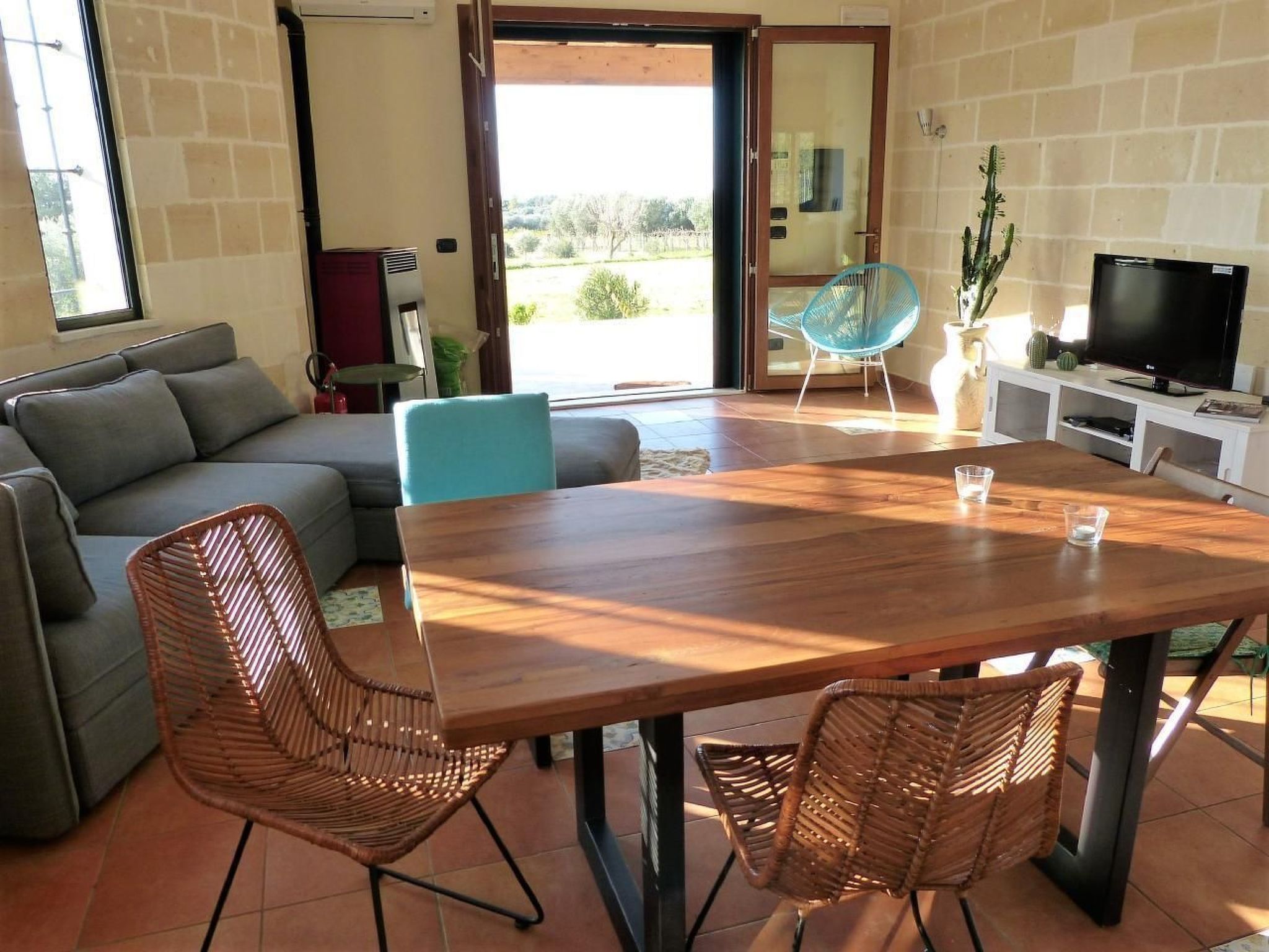 Villa Lona was built in 2011 in the traditional Salento style. The light-flooded, modern villa is well insulated and suitable for all seasons. In summer, the air conditioning cools the house down pleasantly, in winter the cosy, powerful pellet stove heats well. All rooms are at ground level. From the tiled terrace around the house, which offers plenty of shady space for eating and relaxing, a wide staircase leads up to the large roof terrace, from which you have a magnificent 180-degree view of the sea and the surrounding area.