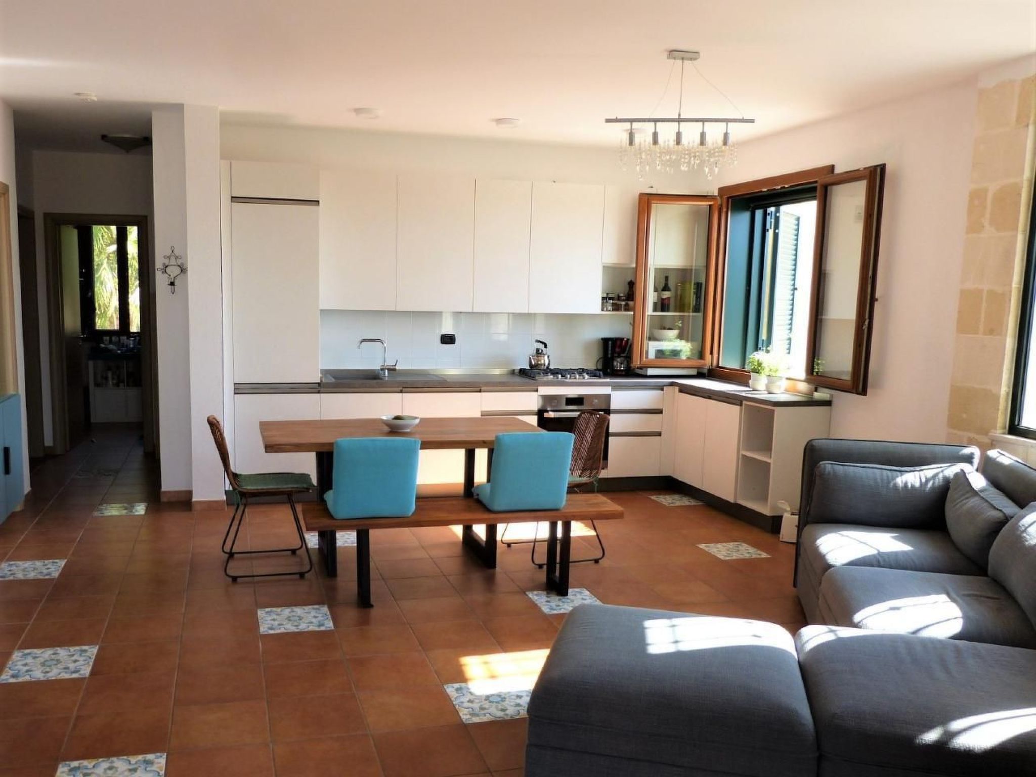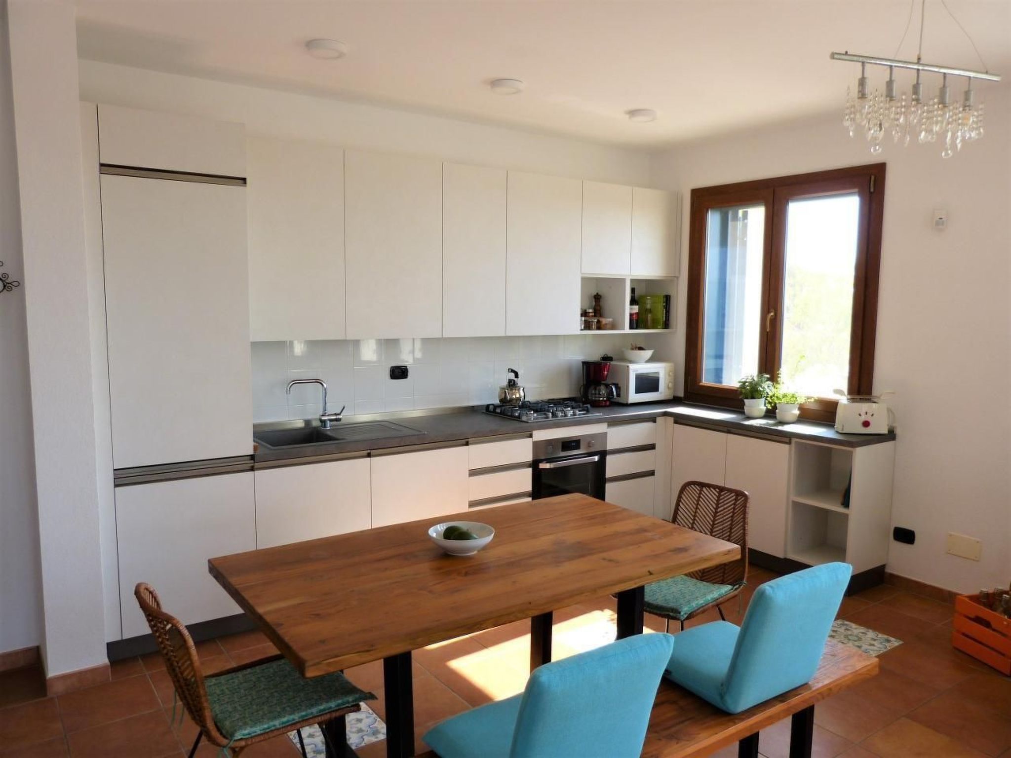 - Open, fully equipped fitted kitchen: dishwasher, gas hob, convection oven, large fridge with separate freezer compartment, microwave, coffee machine, toaster and everything you need for cooking and eating