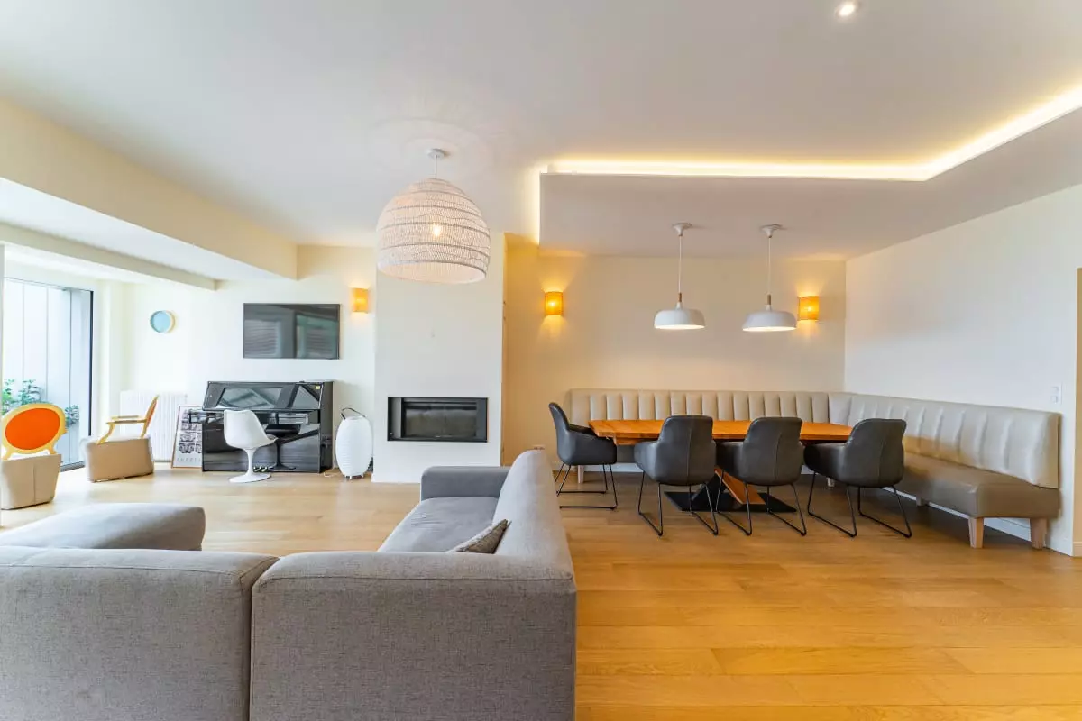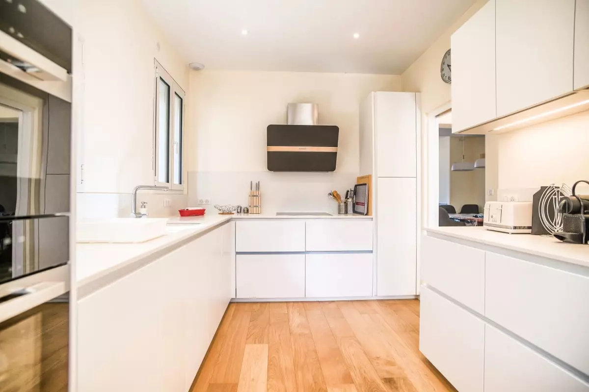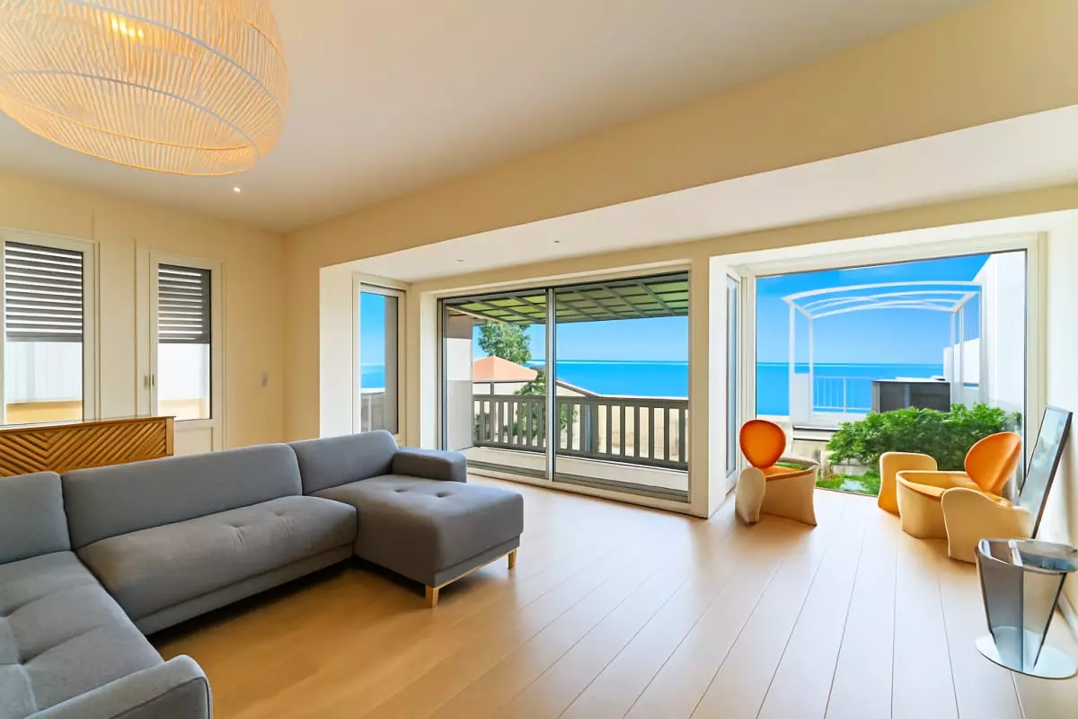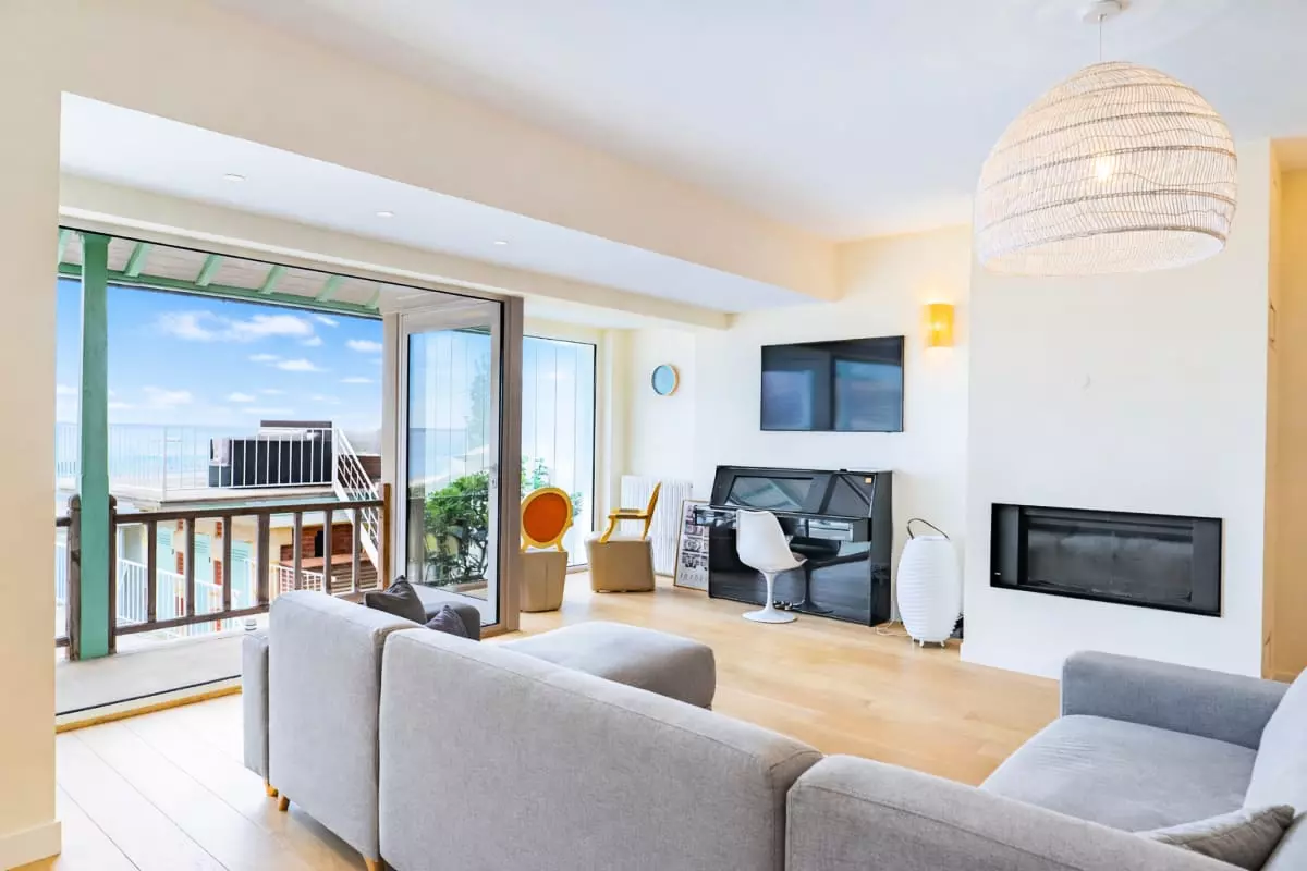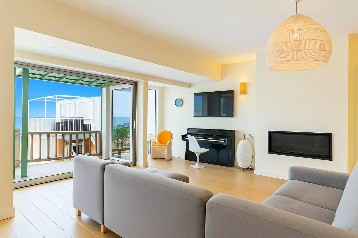 Enter the villa on the ground floor, where you'll find the entrance hall, laundry room, and separate toilet. You'll then arrive in the fully renovated and fully equipped kitchen, offering everything you need to cook to your heart's content. Next comes the spacious and bright 55m² living room, fully facing the beach and the private terrace, which also boasts a sea view.