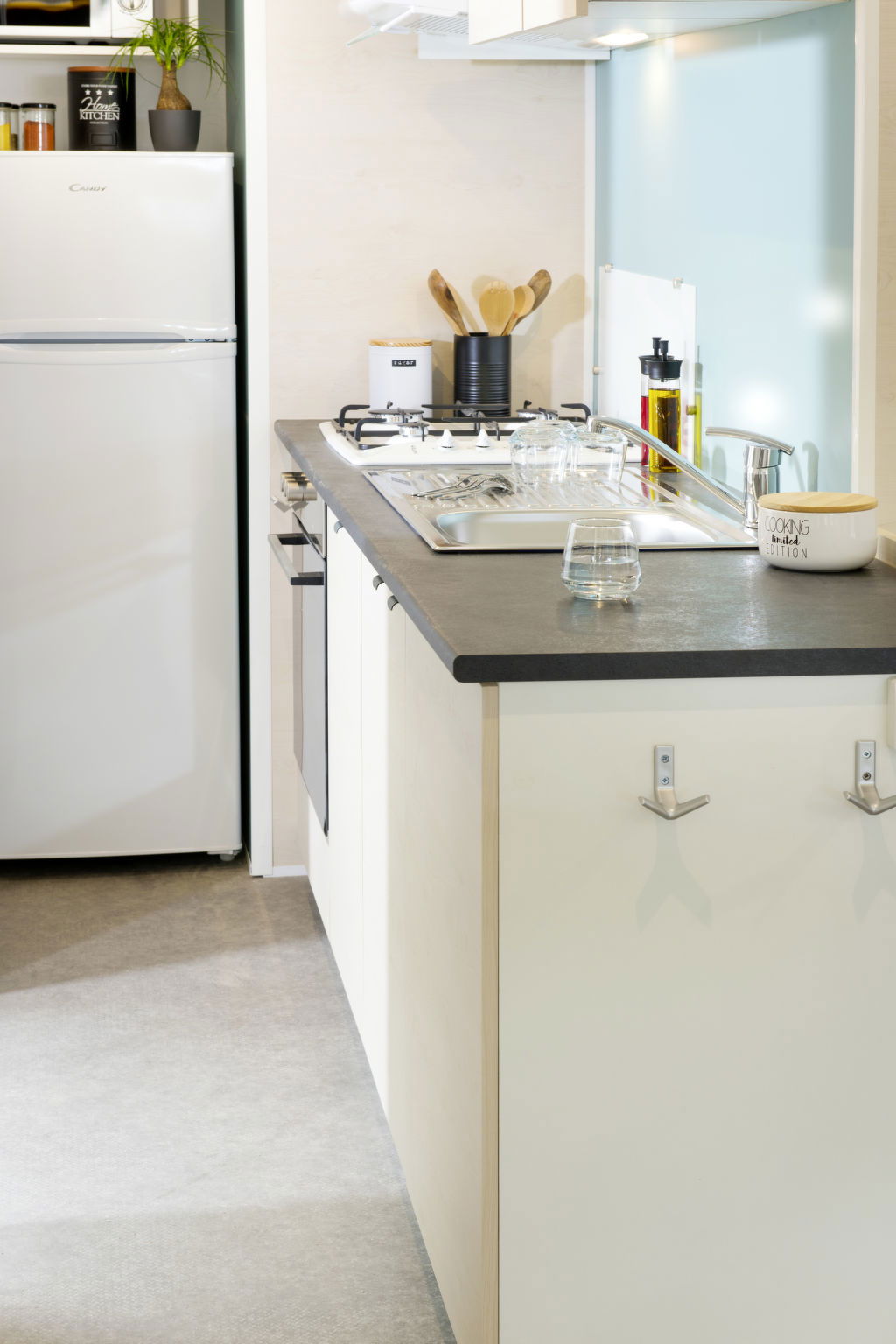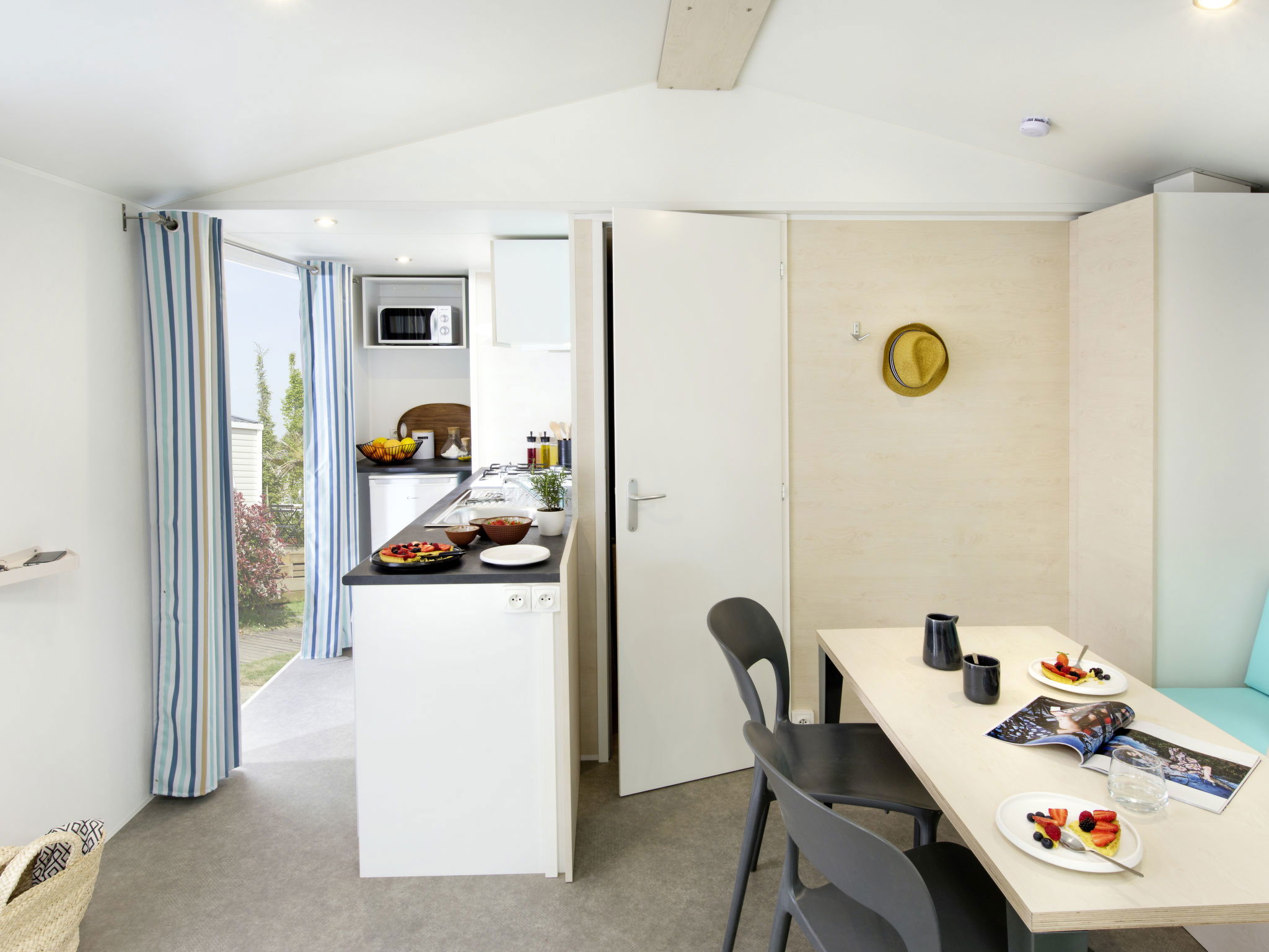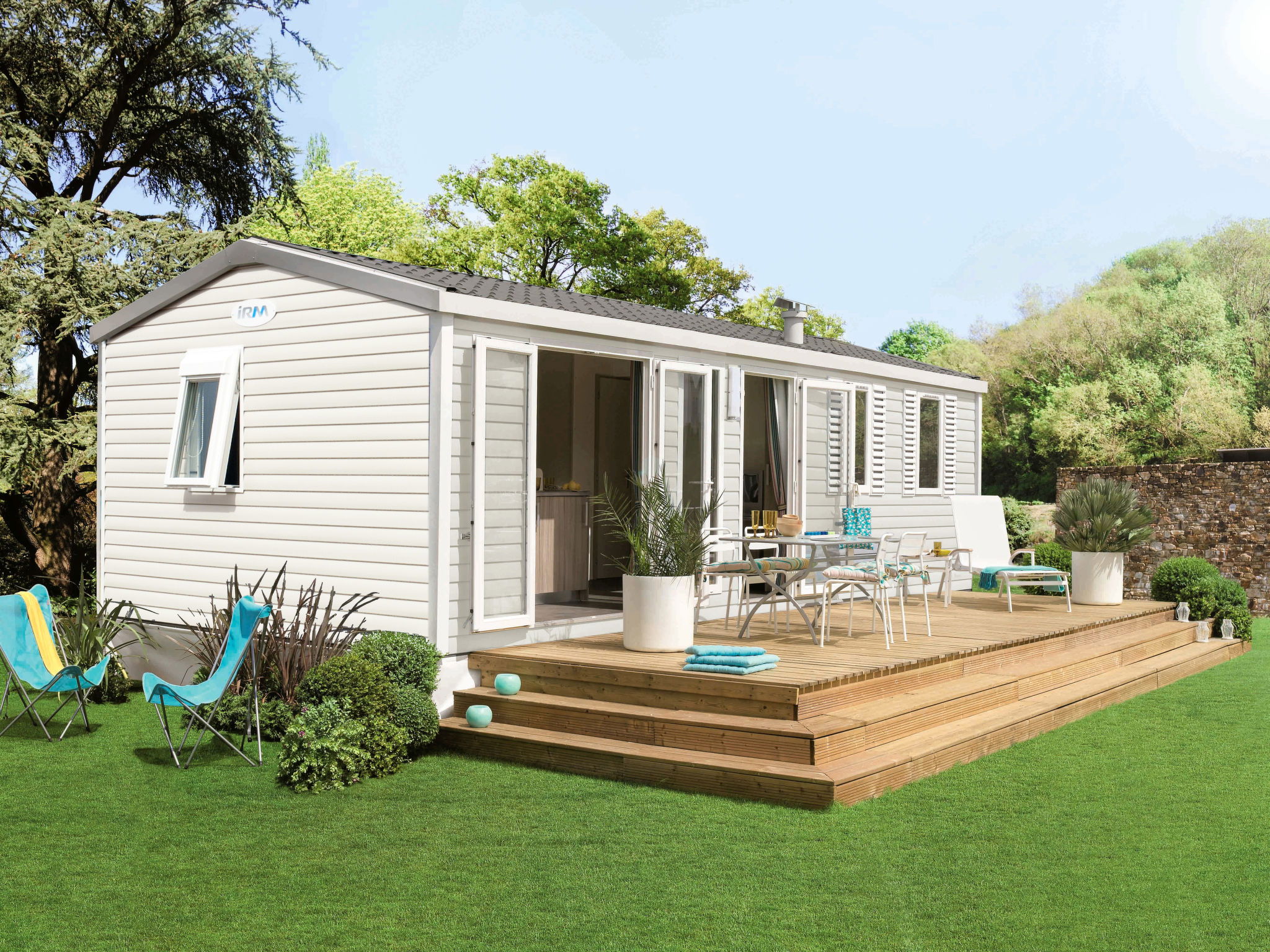 "Camping La Plage", 4-room mobile home 32 m2. Practical furnishings: living/dining room with dining table and TV (flat screen). Exit to the terrace. 1 room with 1 french bed (140 cm, length 190 cm). 2 rooms, each room with 2 beds (70 cm, length 190 cm). Kitchenette (4 gas rings, microwave, freezer, electric coffee machine). Shower, sep. WC. Air-conditioning, forced-air heating. Terrace partly roofed. Terrace furniture. Facilities: children's high chair, baby cot for up to 2 year olds (extra). Internet (WiFi, extra). Please note: maximum 1 pet/ dog allowed. Smoke alarm.