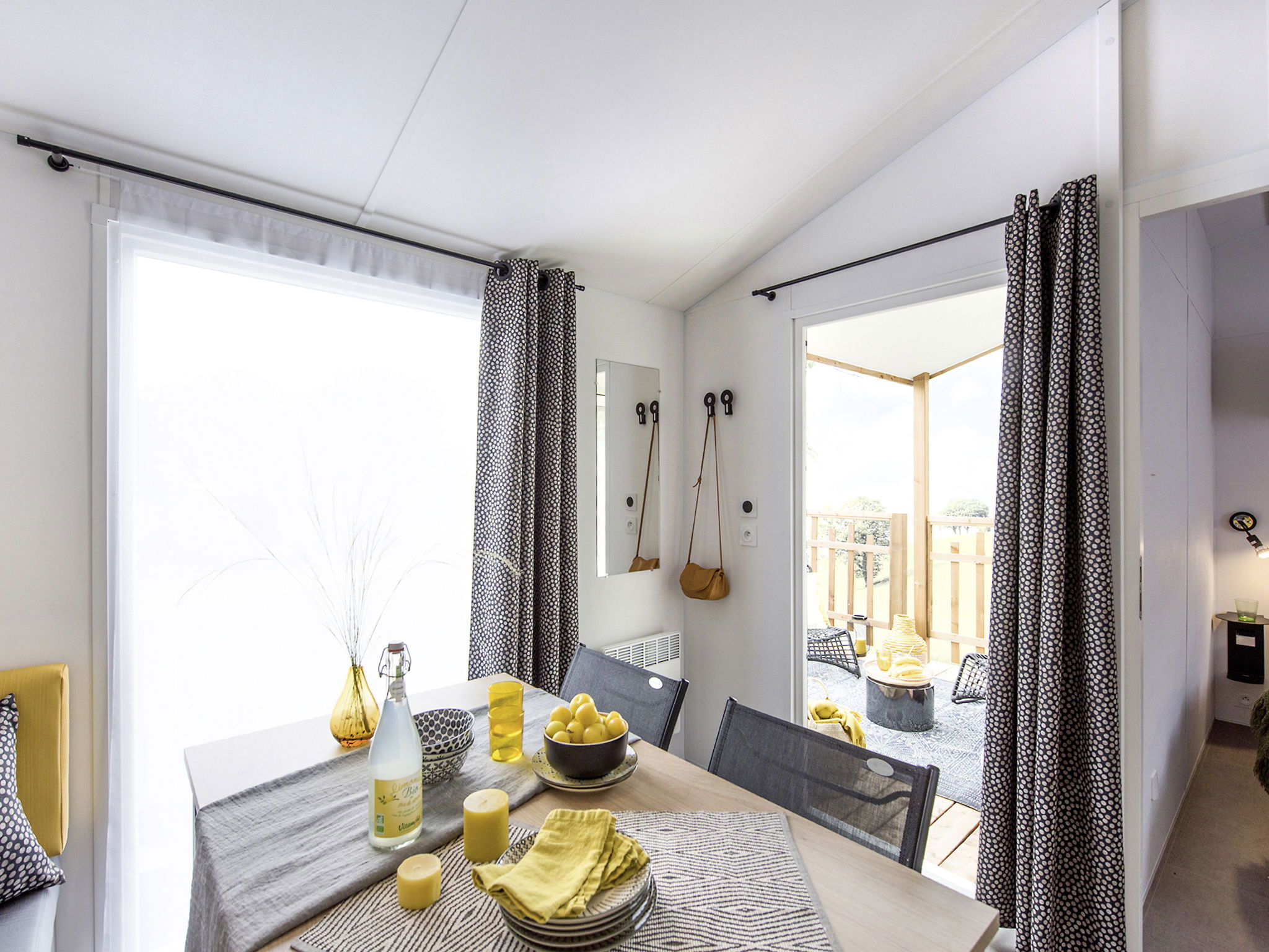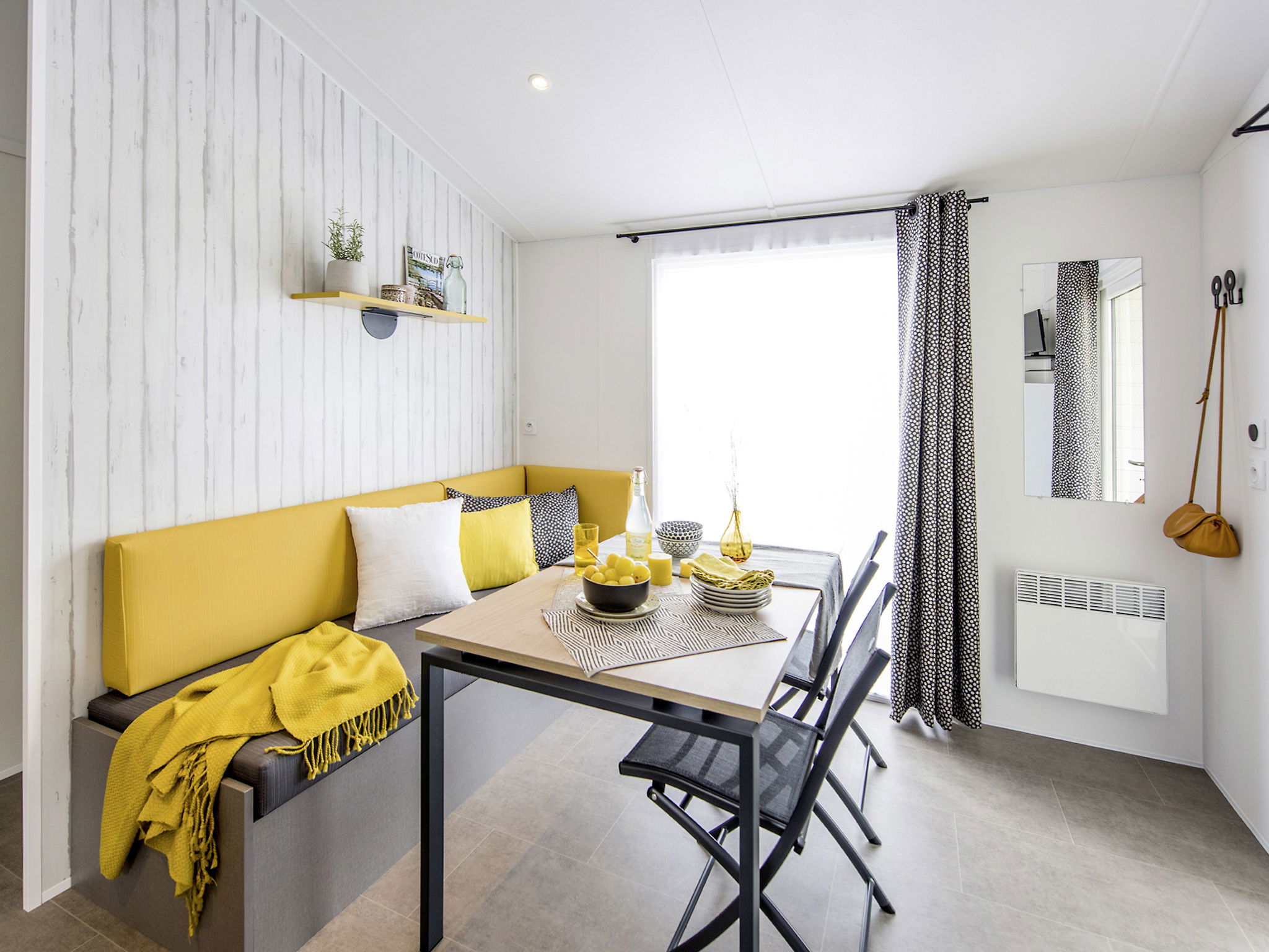 "Camping La Plage", 3-room mobile home 28 m2. Practical furnishings: living/dining room with dining table and TV (flat screen). Exit to the terrace. 1 room with 1 french bed (140 cm, length 190 cm). 1 room with 2 beds (70 cm, length 190 cm). Kitchenette (4 gas rings, microwave, freezer, electric coffee machine). Shower, sep. WC. Electric heating, air-conditioning. Terrace partly roofed. Terrace furniture. Facilities: children's high chair, baby cot for up to 2 year olds (extra). Internet (WiFi, extra). Please note: maximum 1 pet/ dog allowed. Smoke alarm.