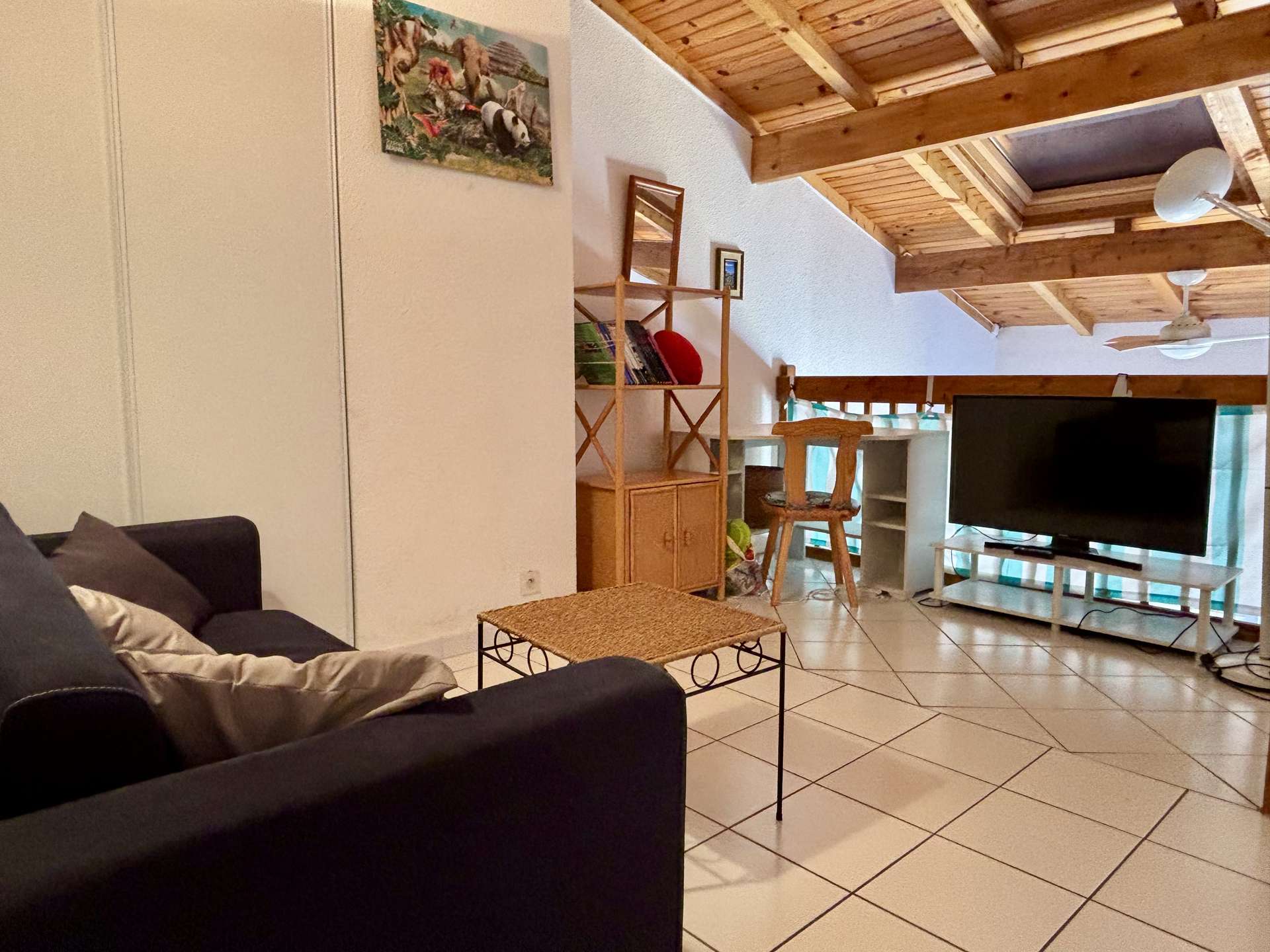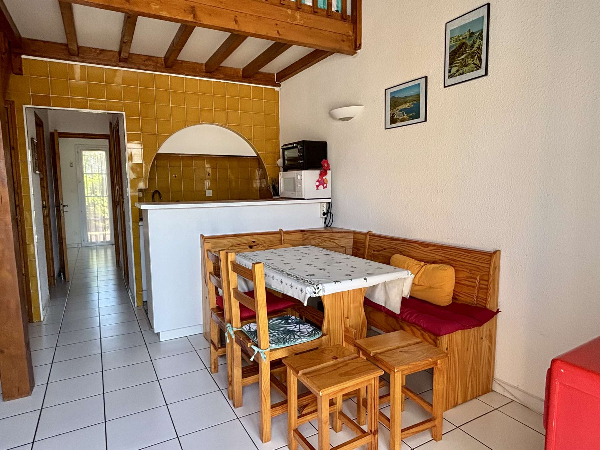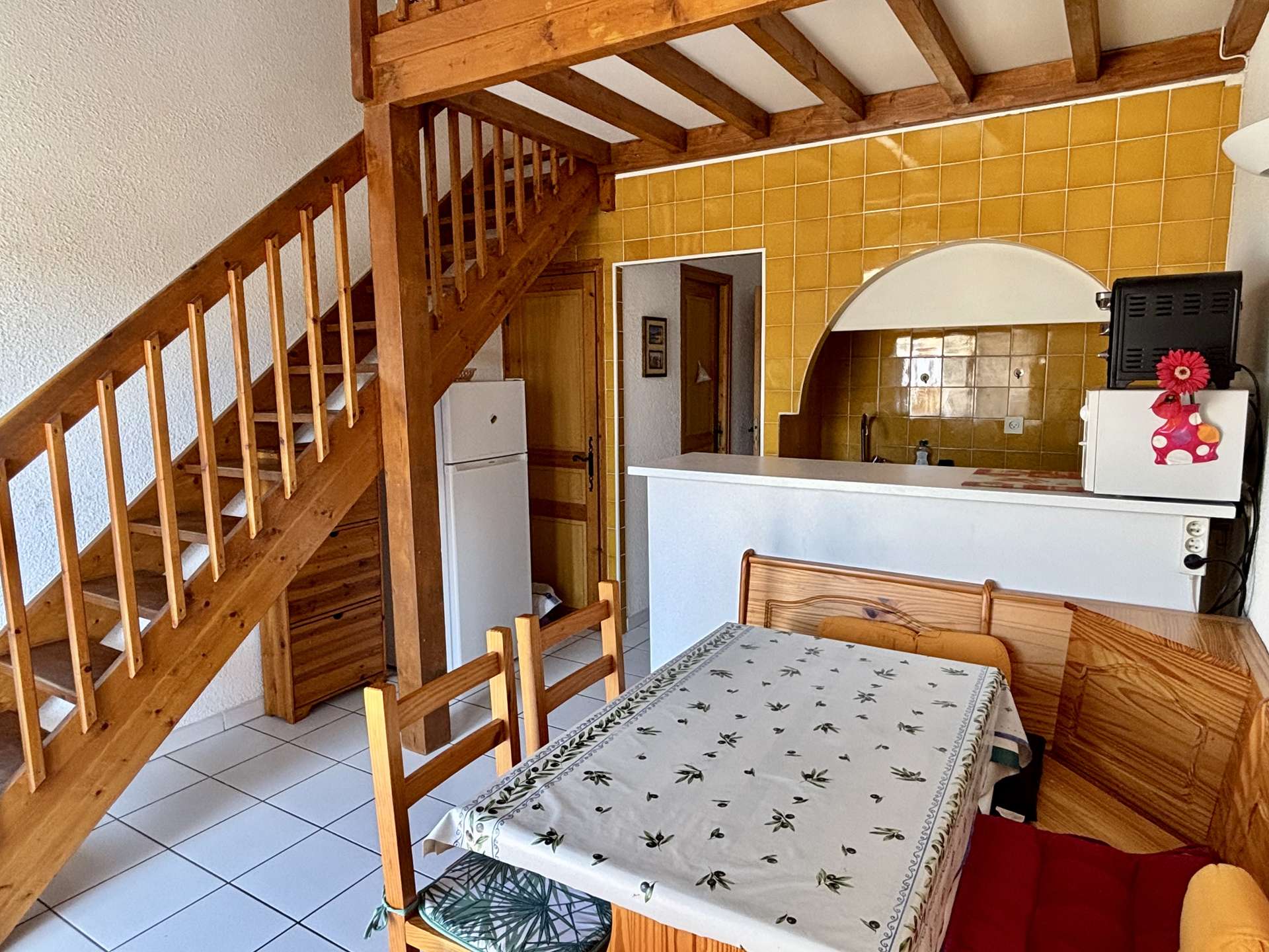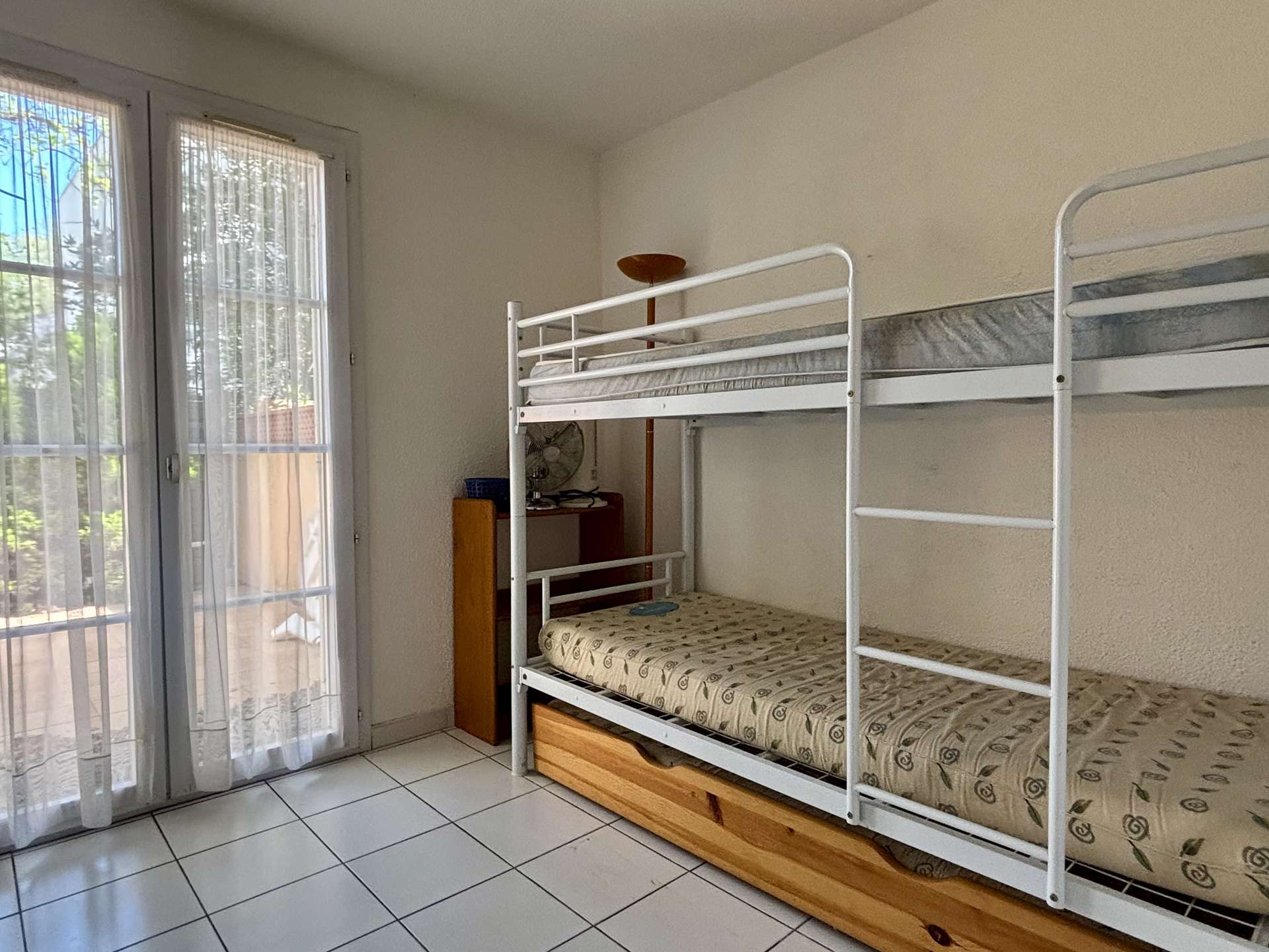 Located near the beach and shops, this family holiday home is composed on the ground floor of a living room with equipped kitchen area, a bedroom with two single bunk beds and a single trundle bed, a bathroom, separate toilets and upstairs, a bedroom with a double bed and a mezzanine.