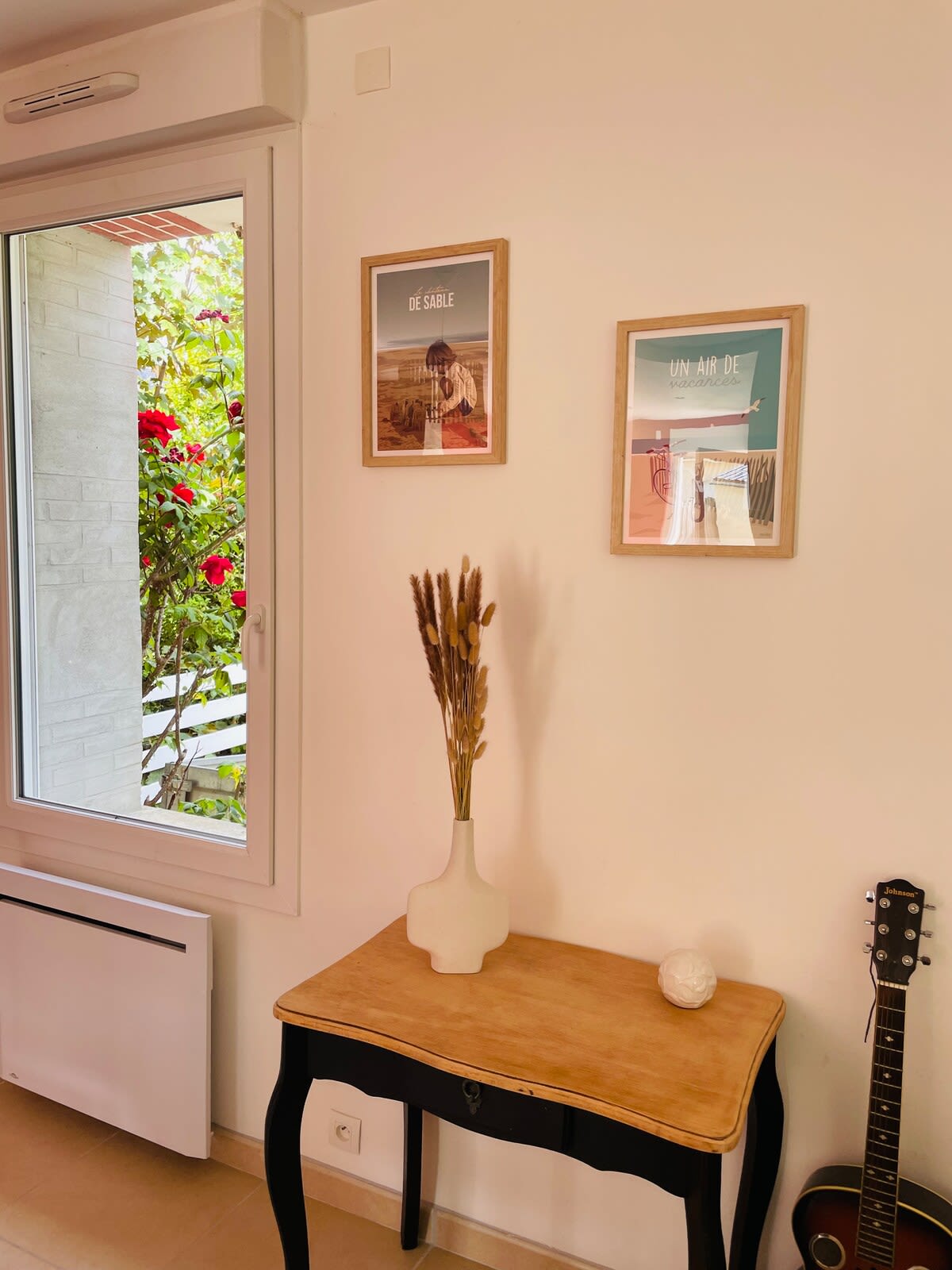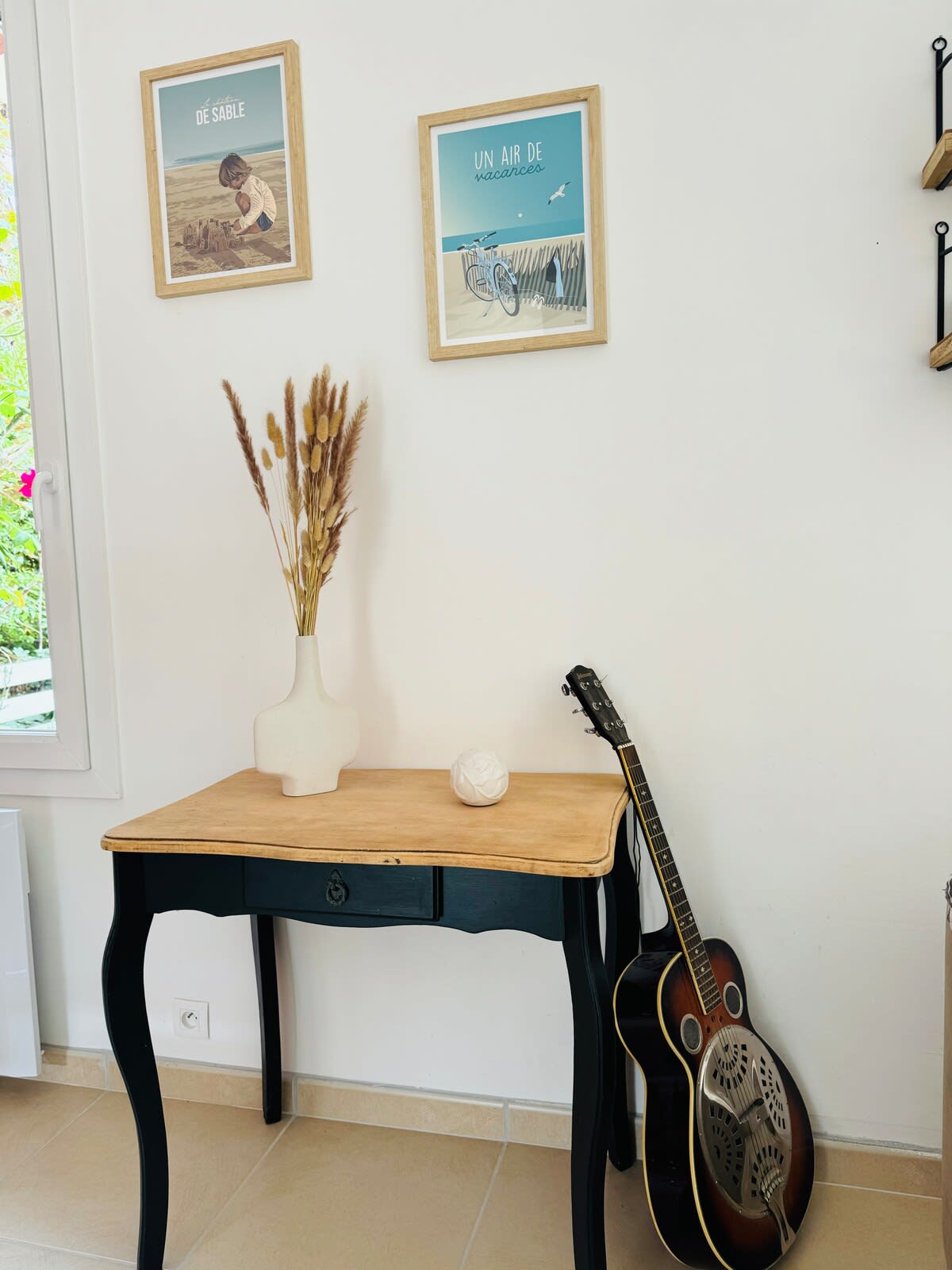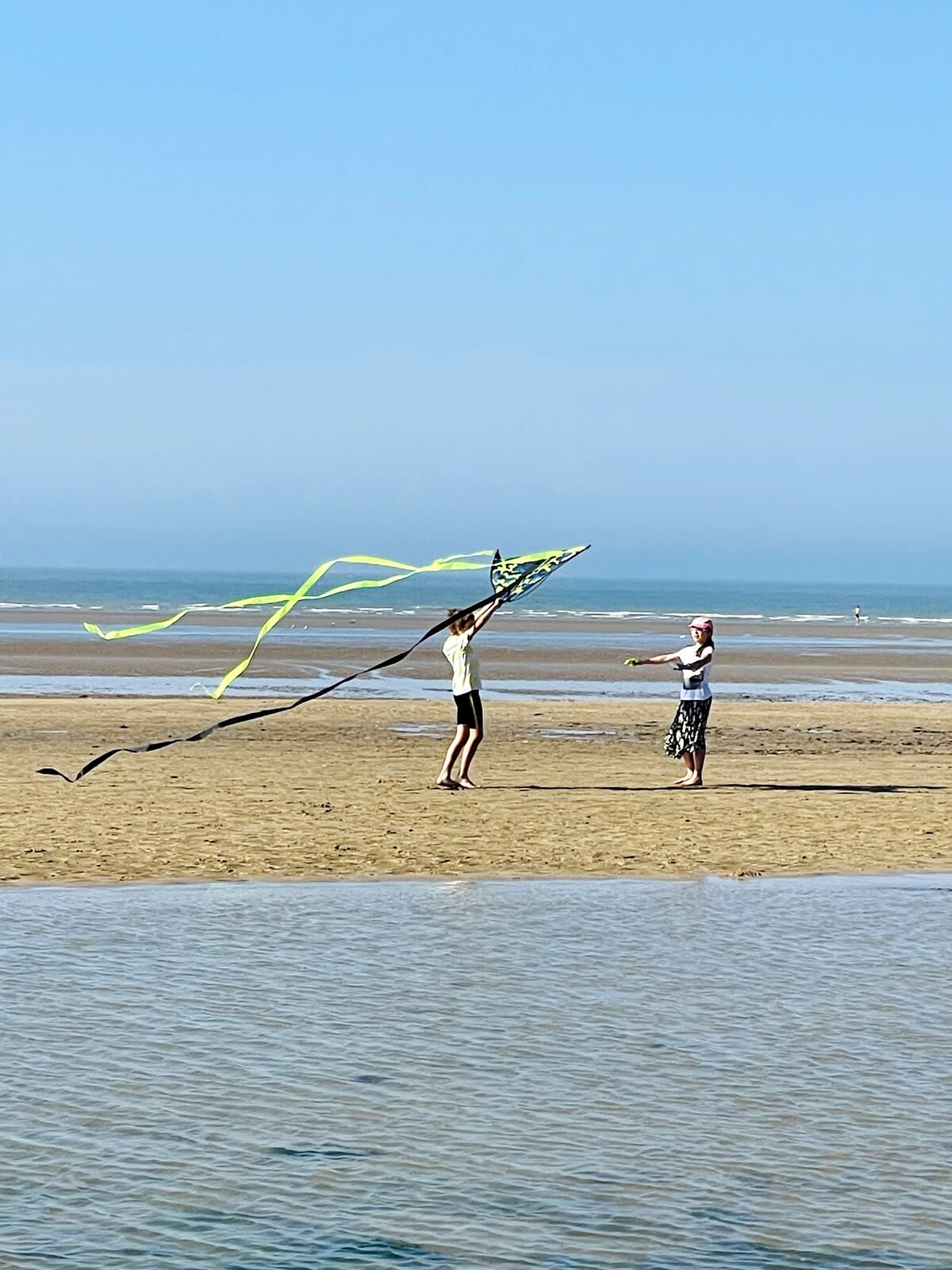 Outdoor table, 2 lounge chairs, charcoal grill (not provided), beach games.