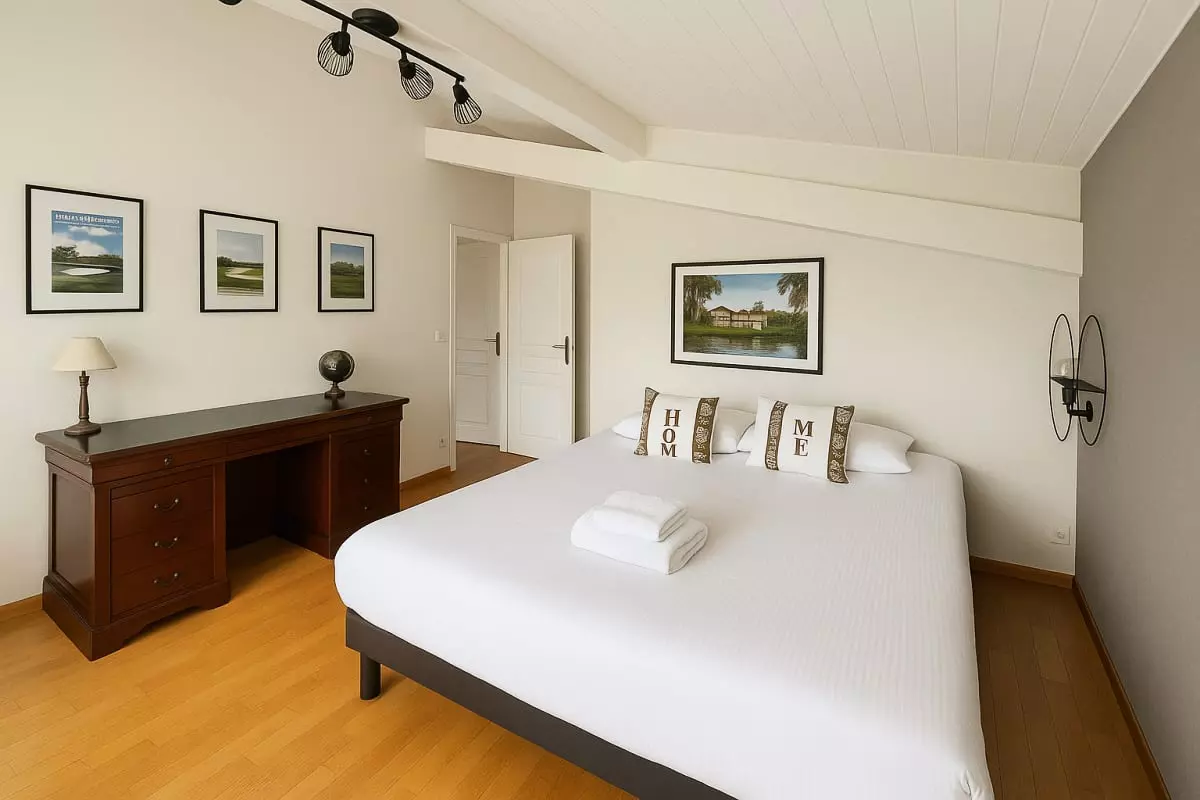 Nestled in the heart of the Bassussary golf course, this elegant 214 m² villa offers quality amenities for a family vacation just 10 minutes from Biarritz. The five spacious bedrooms guarantee optimal comfort. Services include linens, housekeeping, and free Wi-Fi. A security deposit is required.