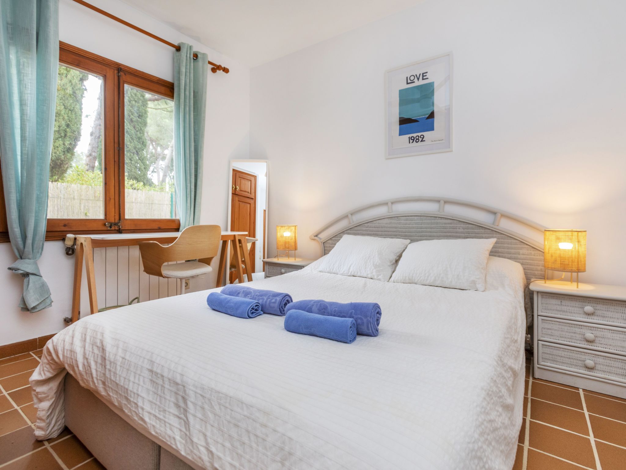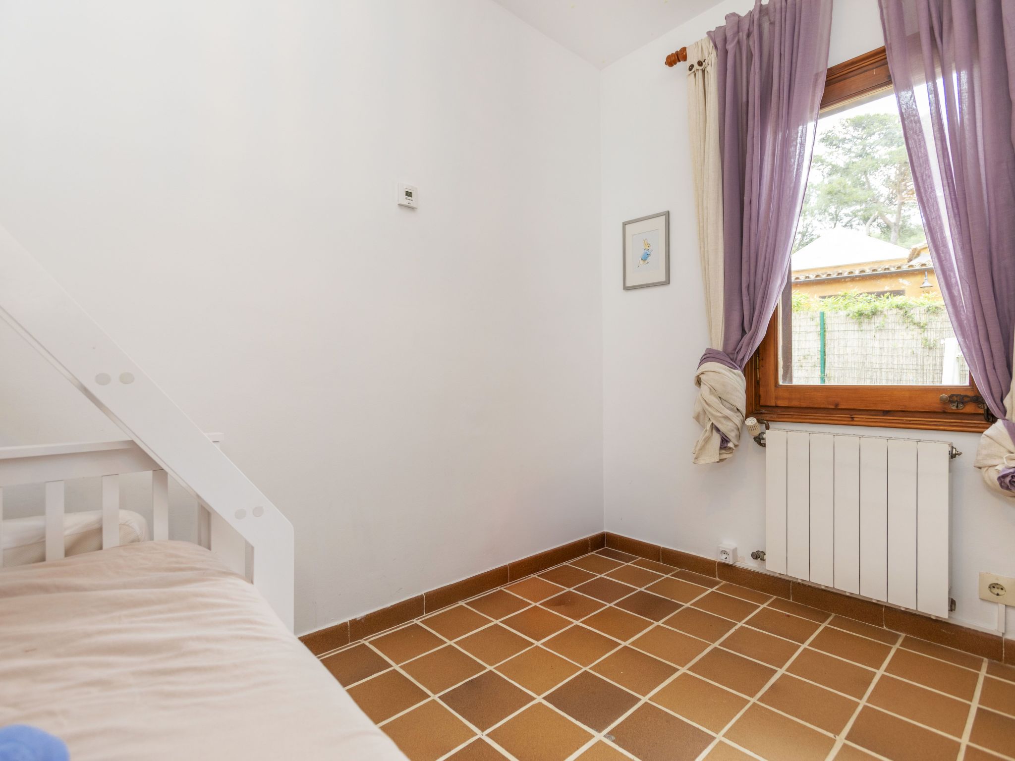 4-room house 103 m2 on 2 levels. Spacious and bright, comfortable and cosy furnishings: living/dining room with dining table, satellite TV, gas heating, air conditioning and forced-air heating. Exit to the patio, to the swimming pool. 1 room with 1 x 1 bunk beds (90 cm, length 190 cm), 1 french bed (140 cm, length 190 cm), fan. 1 room with 1 french bed (140 cm, length 190 cm), fan. Kitchen (4 hot plates, oven, dishwasher, toaster, kettle, microwave, freezer, electric coffee machine). Shower/bidet/WC. Boiler (150 litres). Upper floor: 1 large room with 1 french bed (180 cm, length 200 cm), bath/bidet/WC and fan. Exit to the terrace. Large terrace. Terrace furniture, deck chairs, covered balcony. Beautiful view of the swimming pool and the garden. Facilities: washing machine, iron, children's high chair, baby cot for up to 2 year olds, hair dryer. Internet (WiFi, free, Bandwidth: 600 Mbit/s). Parking at the house. Please note: non-smoking house. Maximum 1 small pet/ dog allowed. TV only ES. No lift. HUTG-059068
