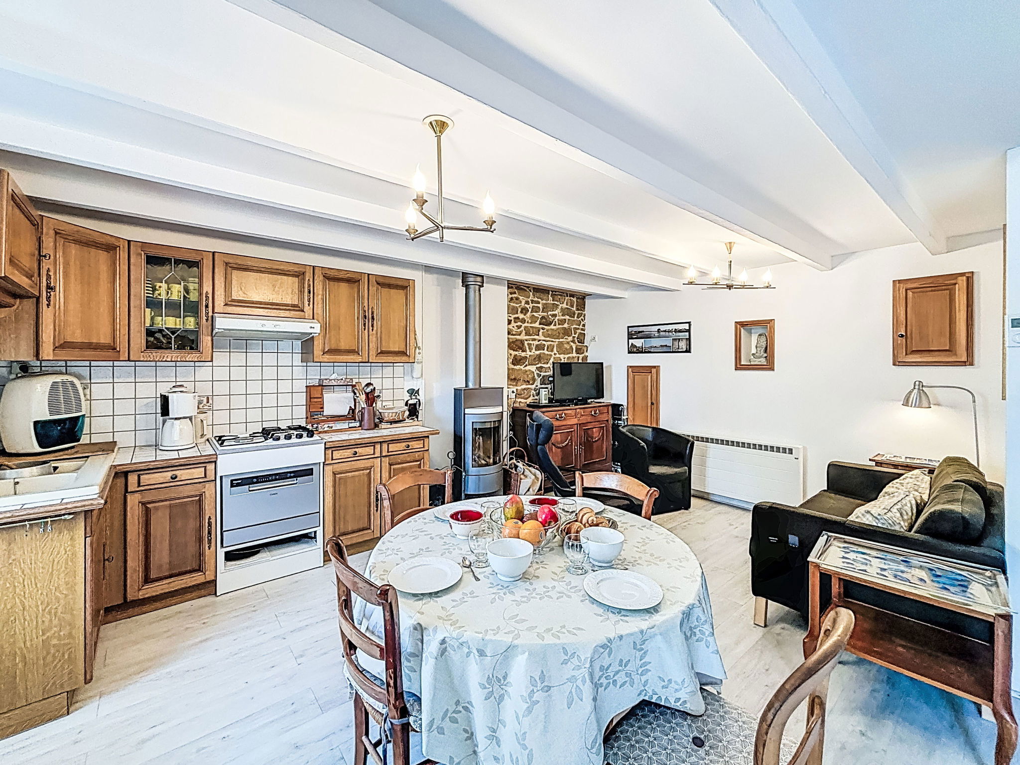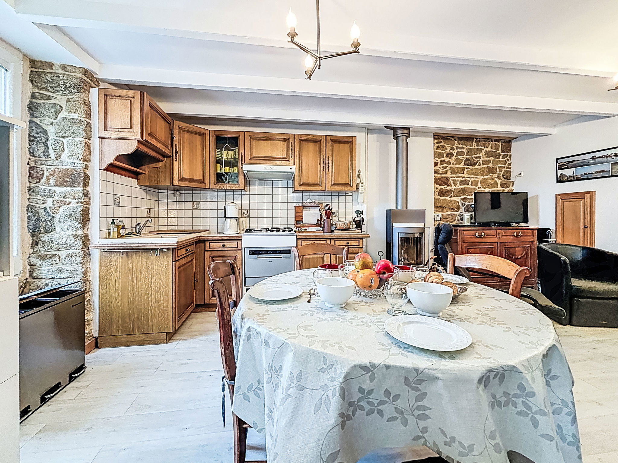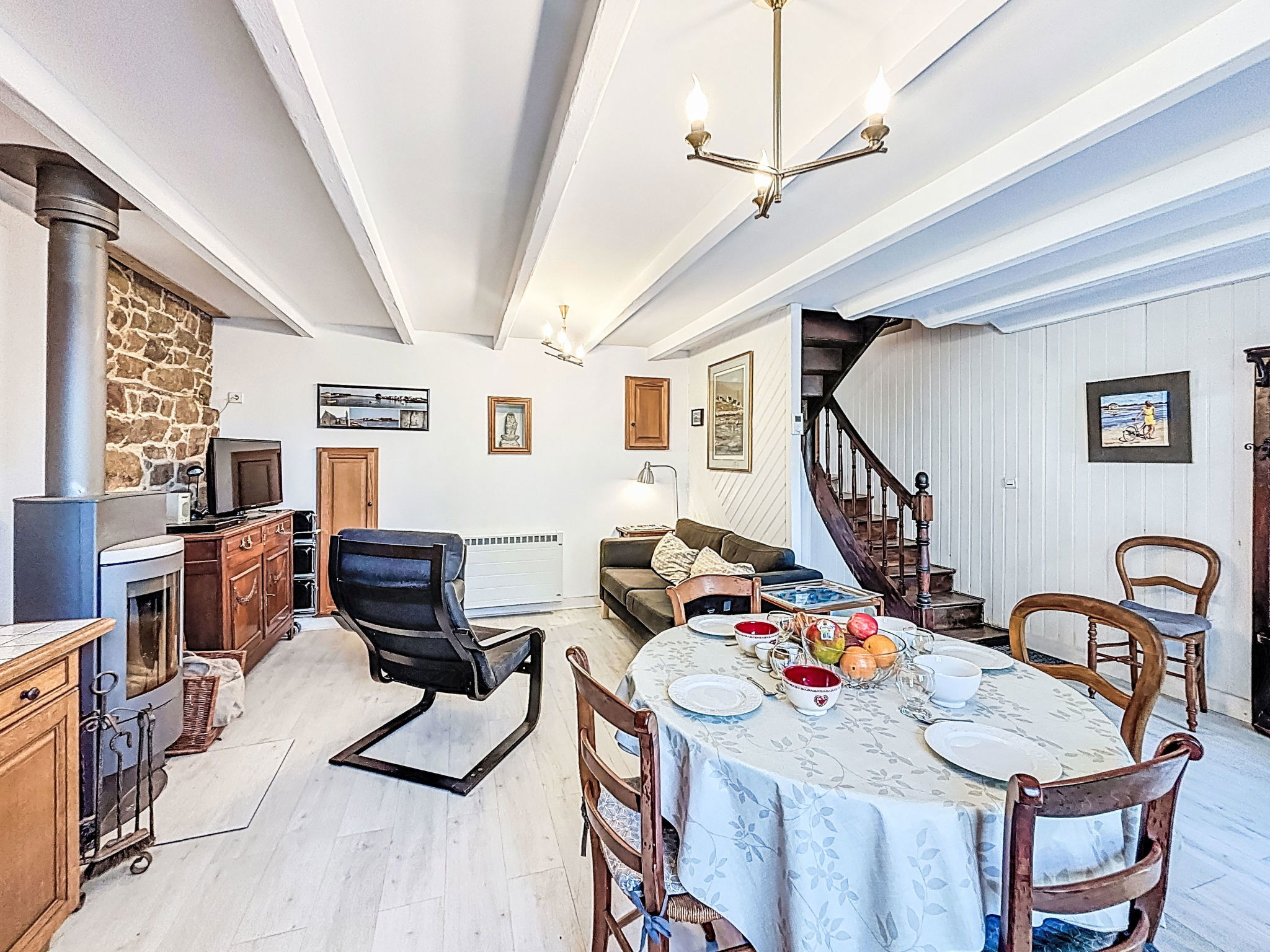 "Maison de Saint-Cado", 3-room house 50 m2. Comfortable furnishings: living/dining room with TV (flat screen). Open kitchen (dishwasher, 4 gas rings, toaster, kettle, microwave, freezer, electric coffee machine). Upper floor: 1 room with 1 french bed (1 x 140 cm, length 190 cm). 1 room with 1 french bed (1 x 140 cm, length 190 cm). Shower, sep. WC. Electric heating. Small terrace. Terrace furniture. Facilities: washing machine. Internet (WiFi, free). Please note: non-smokers only. 1 pet/ dog allowed. Smoke alarm. Offer by a private individual according to Art. 155, IV of CGI. 560130001873E