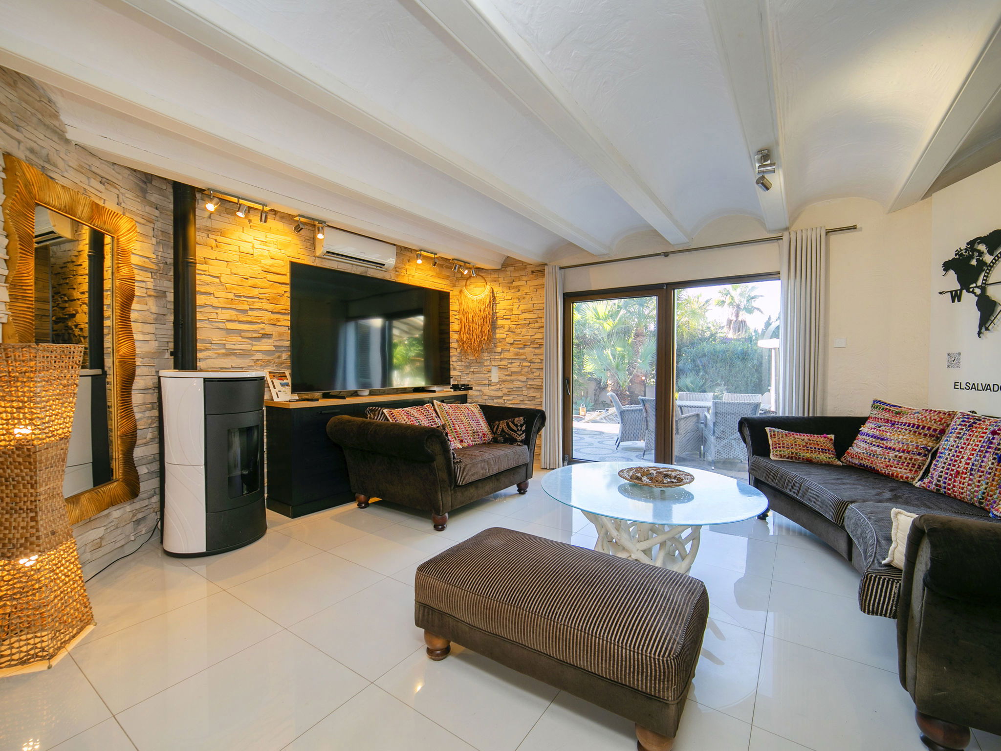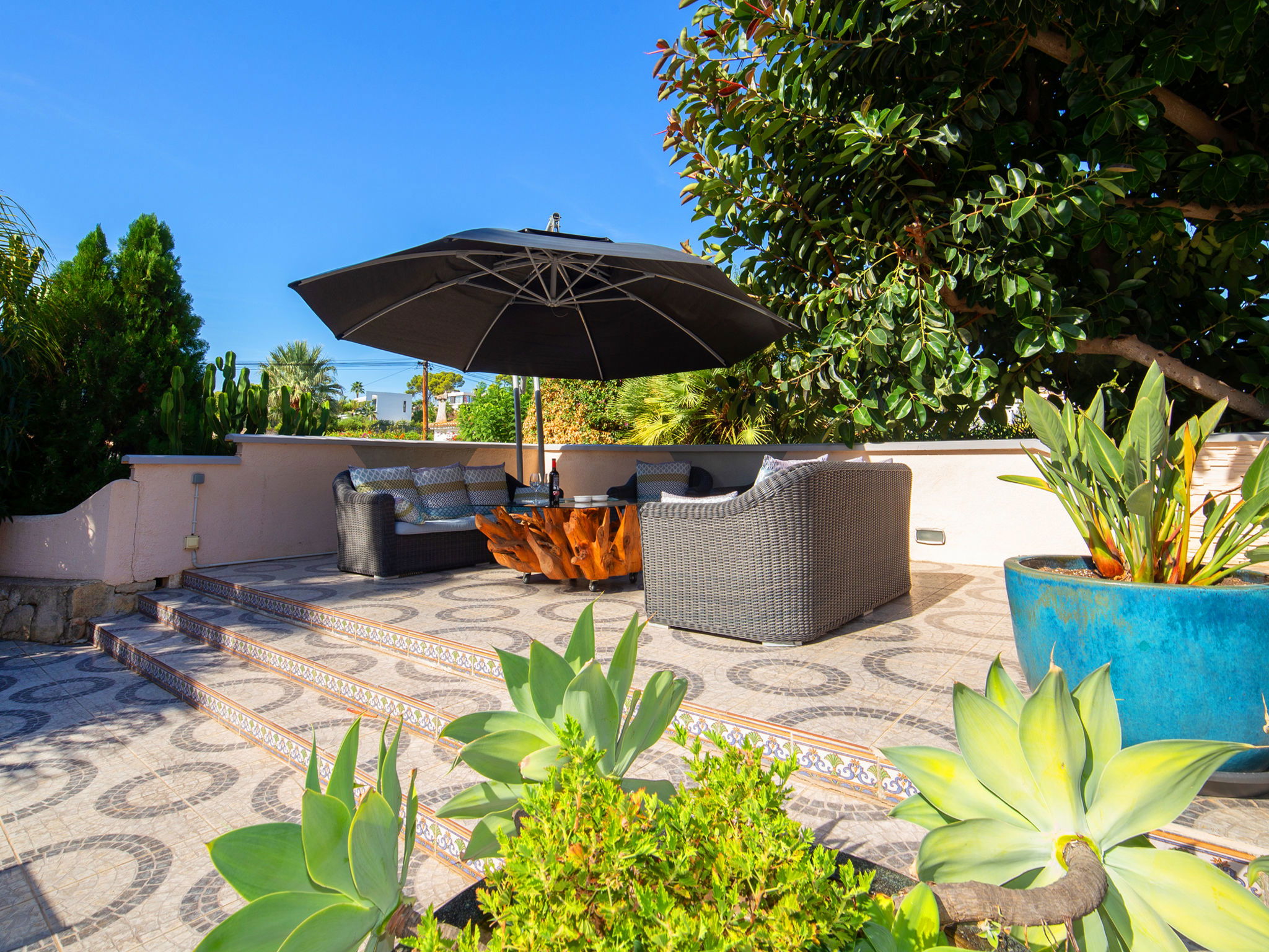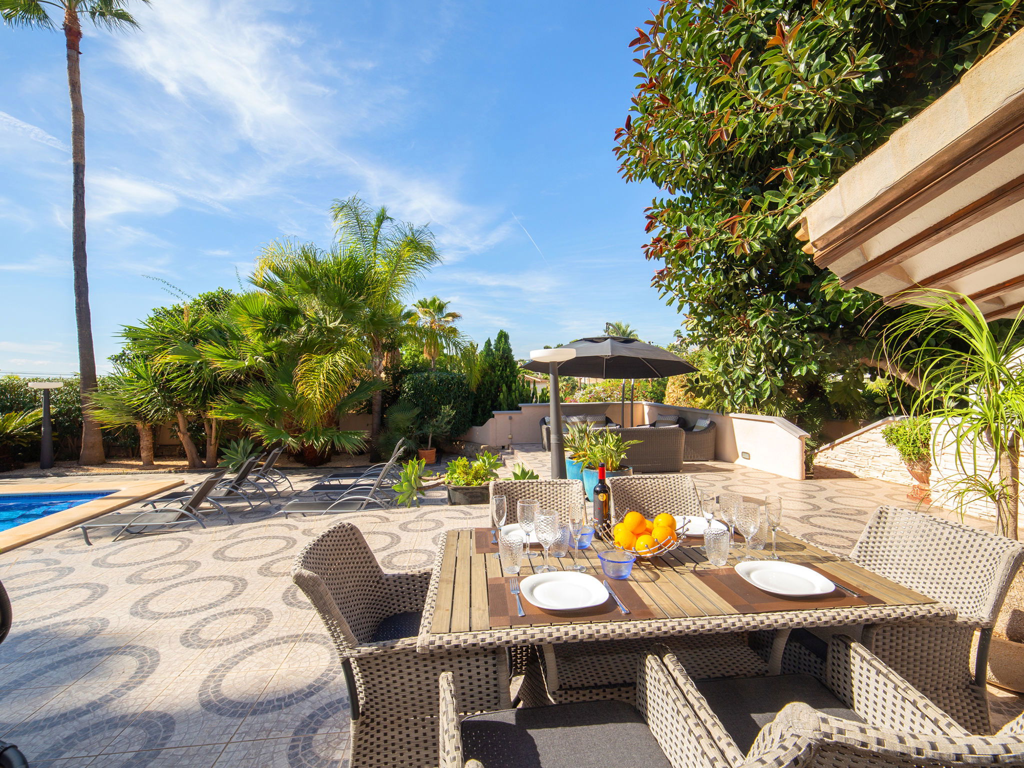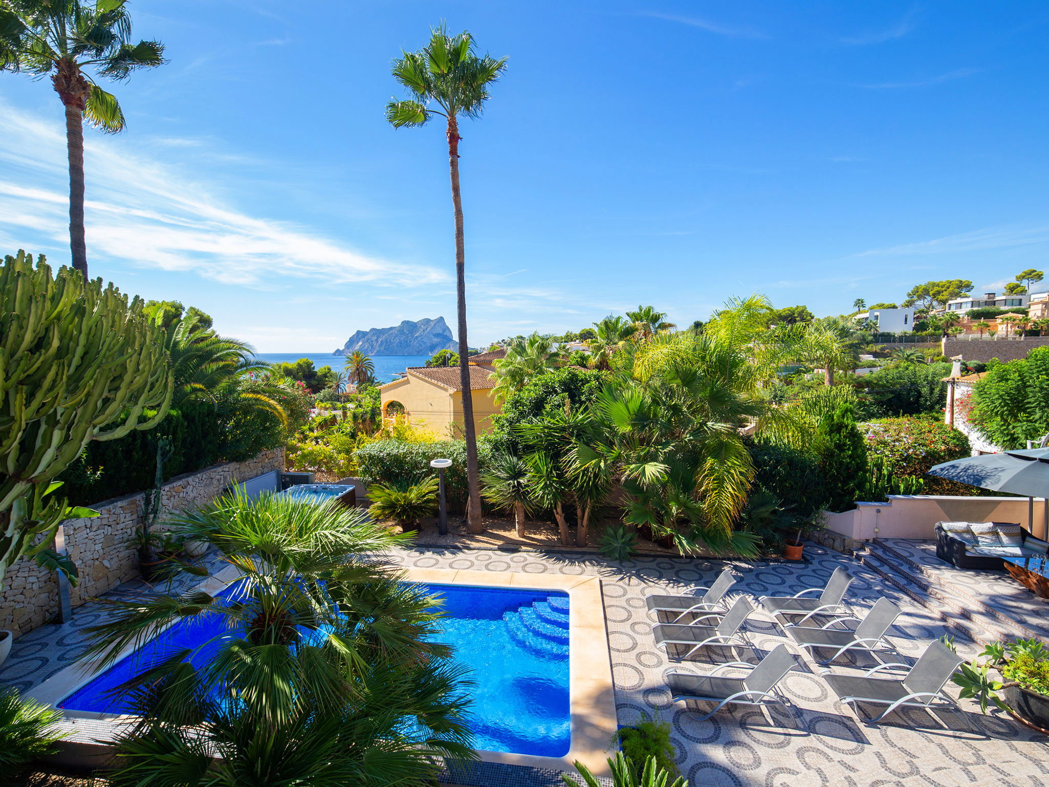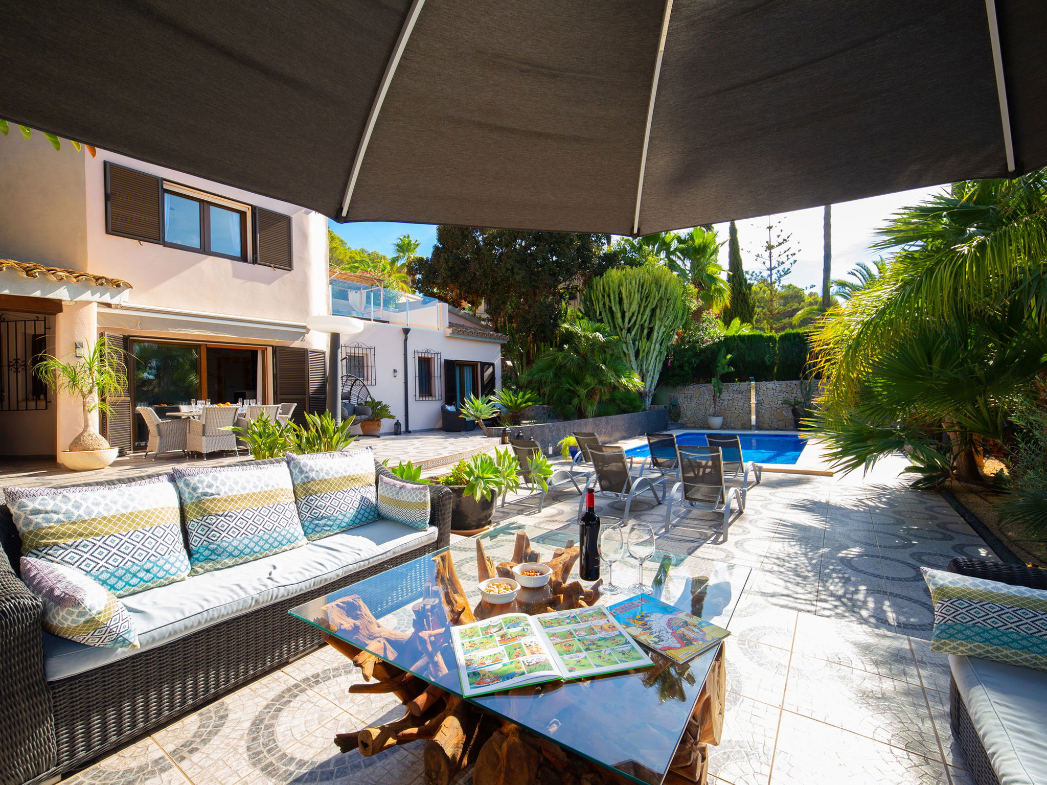 Beautiful, comfortable villa "El Salvador", 2 storeys. 7 km from the centre of Moraira, 7 km from the centre of Calpe, in a secluded, quiet position residential area (villas), traffic calmed area, 250 m from the sea, 250 m from the beach. Private: property (fenced), beautiful, well-kept garden, swimming pool (8 x 4 m, seasonal availability: 01.Jan. - 31.Dec.). Outdoor shower, hot tub, pool house with fridge and cooking stove, terrace, barbecue. Grocery, supermarket 750 m, restaurant, bar, café 650 m, bus stop 600 m, sandy beach "Playa la Fustera" 650 m. Sports harbour 2 km, golf course (9 hole) 6 km. Nearby attractions: Aqualandia, Mundomar, Terra Mítica, Terra Natura, Benidorm Palace (Benidorm), Les Fonts de l'Algar, Castillo de Guadalest. The owner does not accept any youth groups.