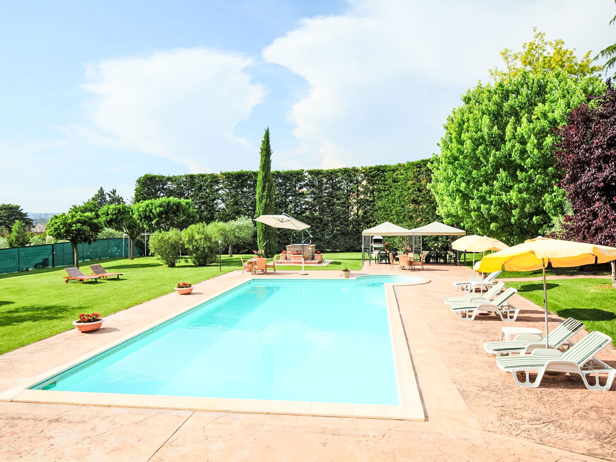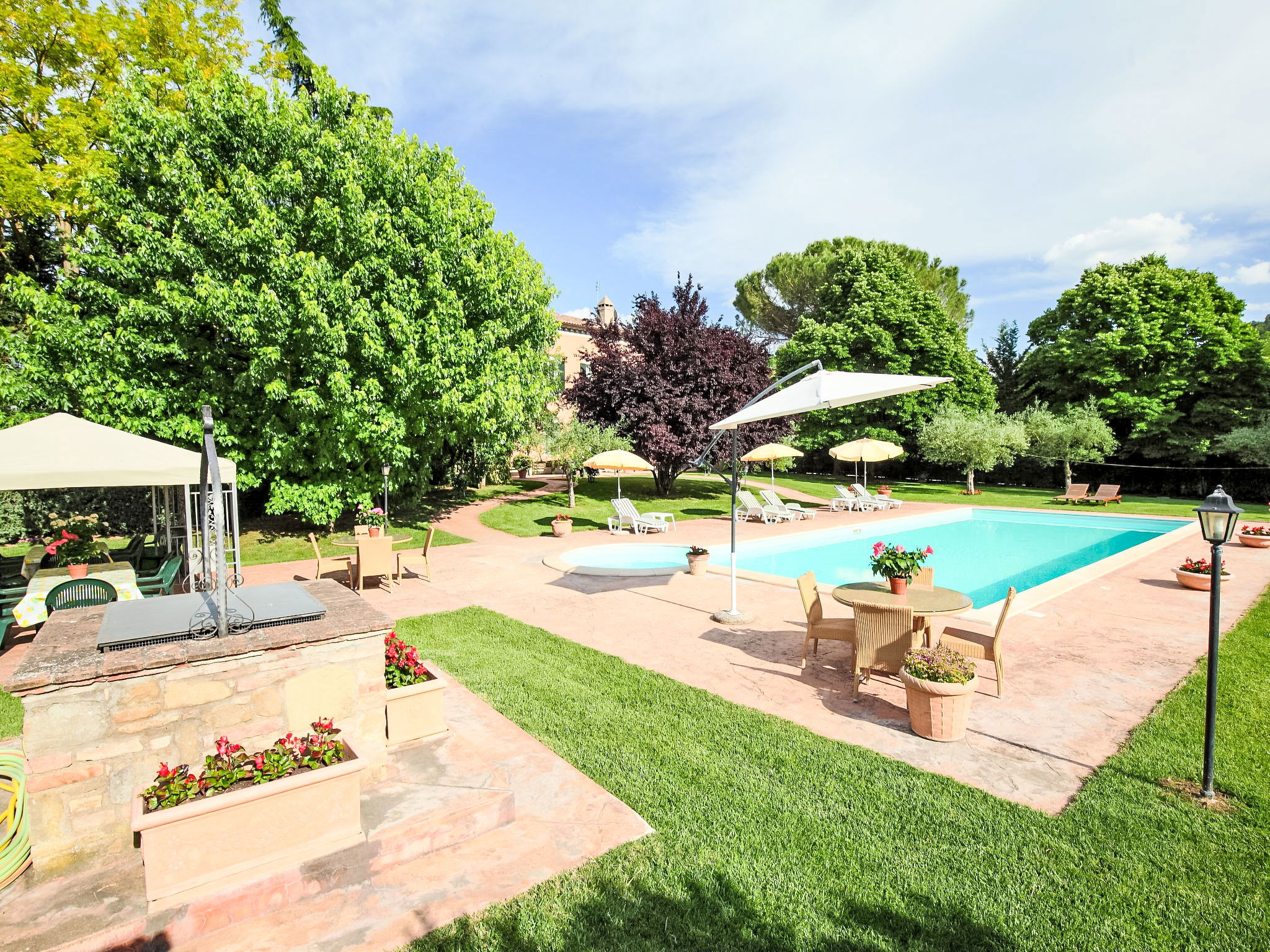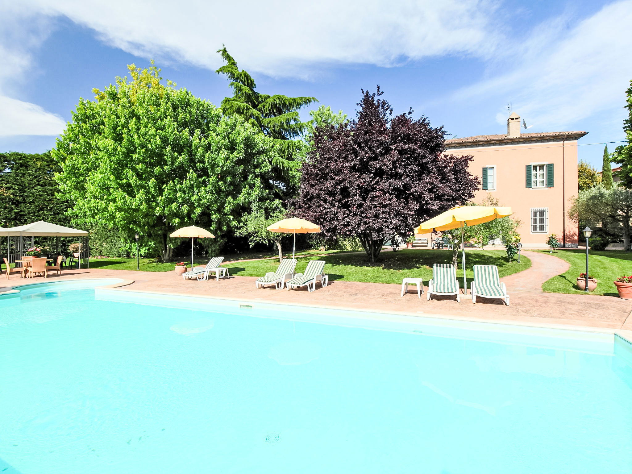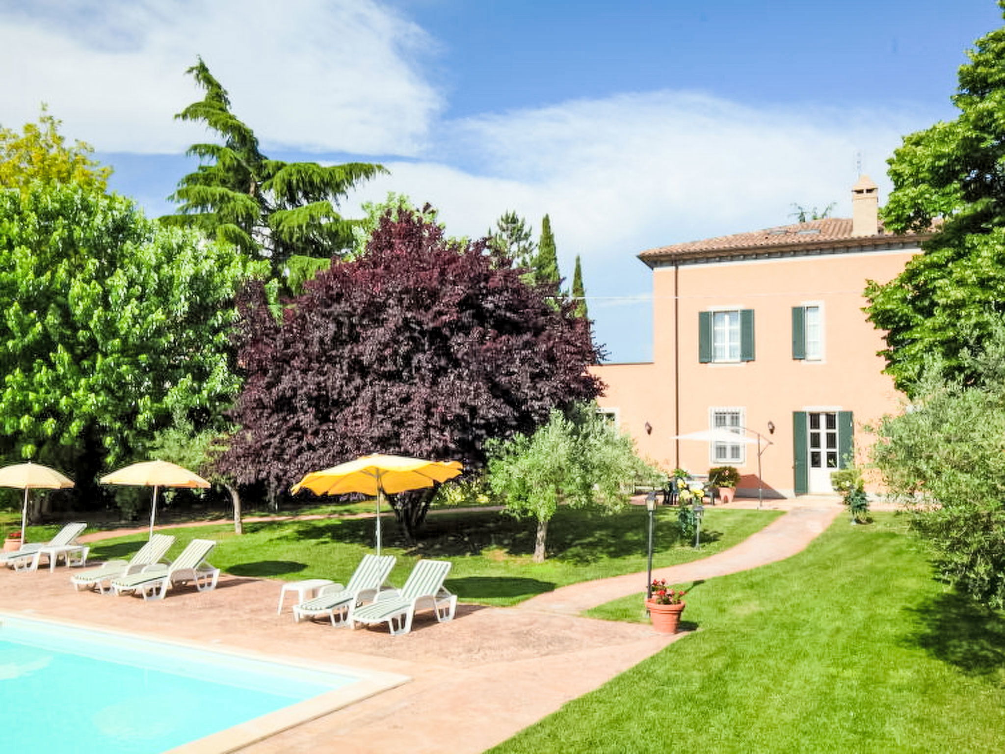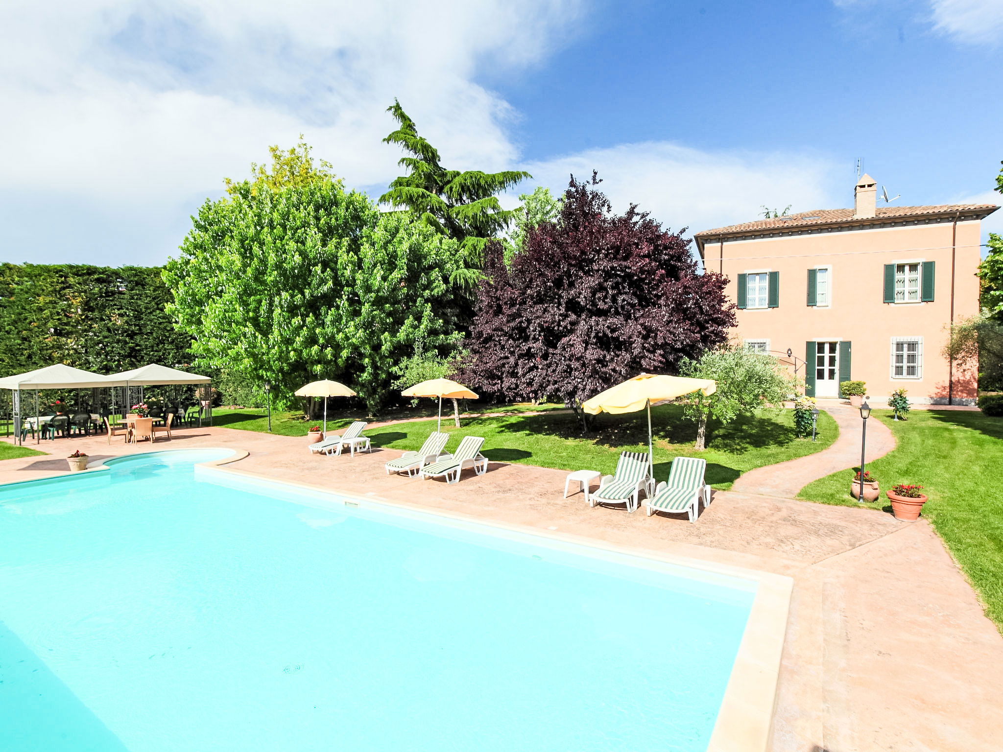 This villa was built around 1850 by a baron of the Perugia aristocracy, relative of the Pope Pio IX. The villa has been recently renovated with absolute care for the original frescos and period furniture. The property is closeby the main road of the village. Florence and Rome 150 km, Todi 30 Km. Spoleto 40 km. Perugia airport 15 km. Villa "Paolotti", built in 1870. In a hamlet 3 km from the centre of Bettona, 18 km from the centre of Perugia, in a sunny position, on a main road. Private: garden (fenced), swimming pool (14 x 6 m, depth 145 cm, seasonal availability: 25.May. - 30.Sep.). Pergola, garden furniture, barbecue. In the house: washing machine. Available: bicycles (4) (extra). Parking on the premises. Grocery 100 m, supermarket 1 km, restaurant 1 km. Riding stable 3 km. Nearby attractions: Assisi 15 km. The owner does not accept any youth groups.