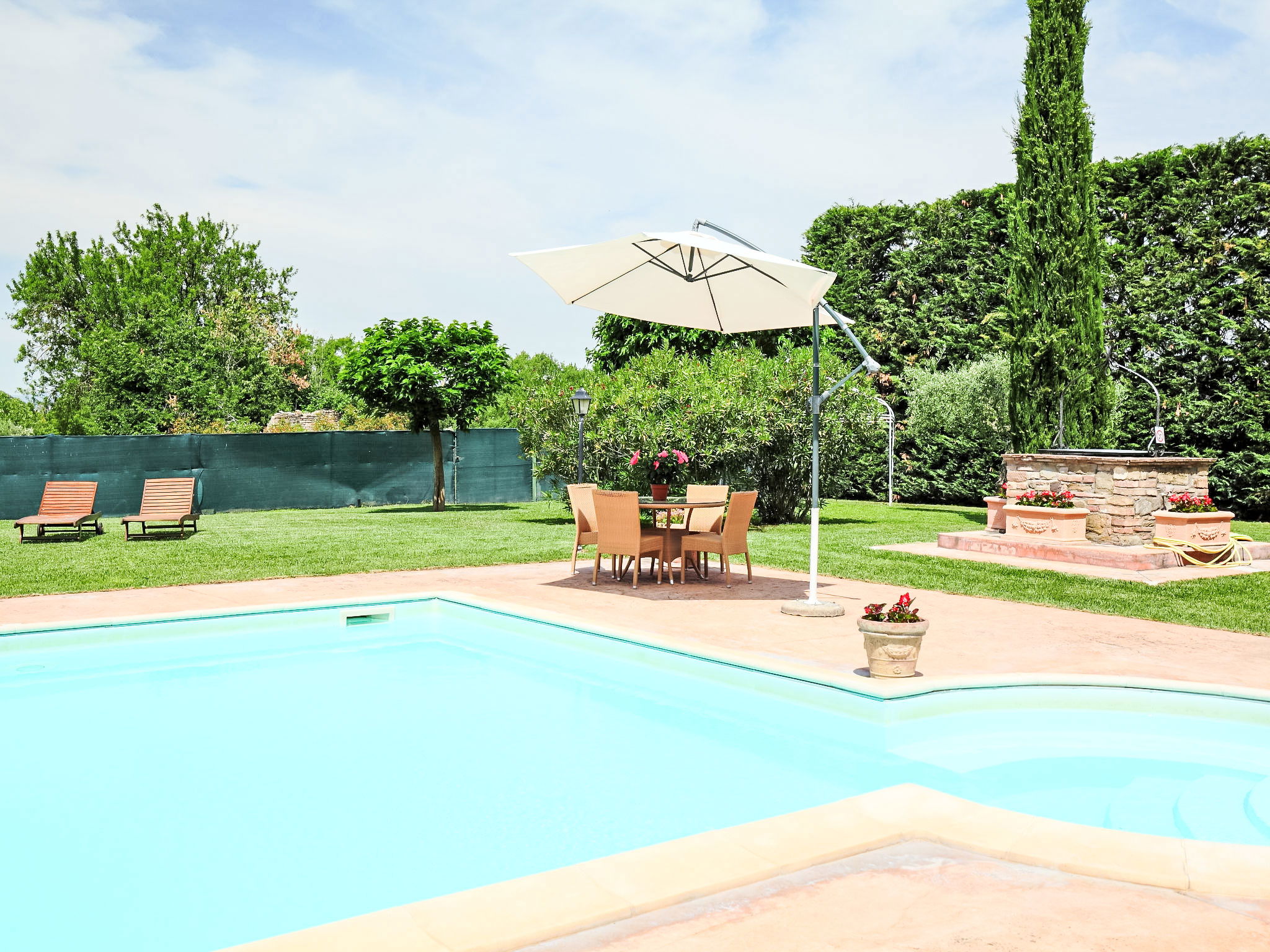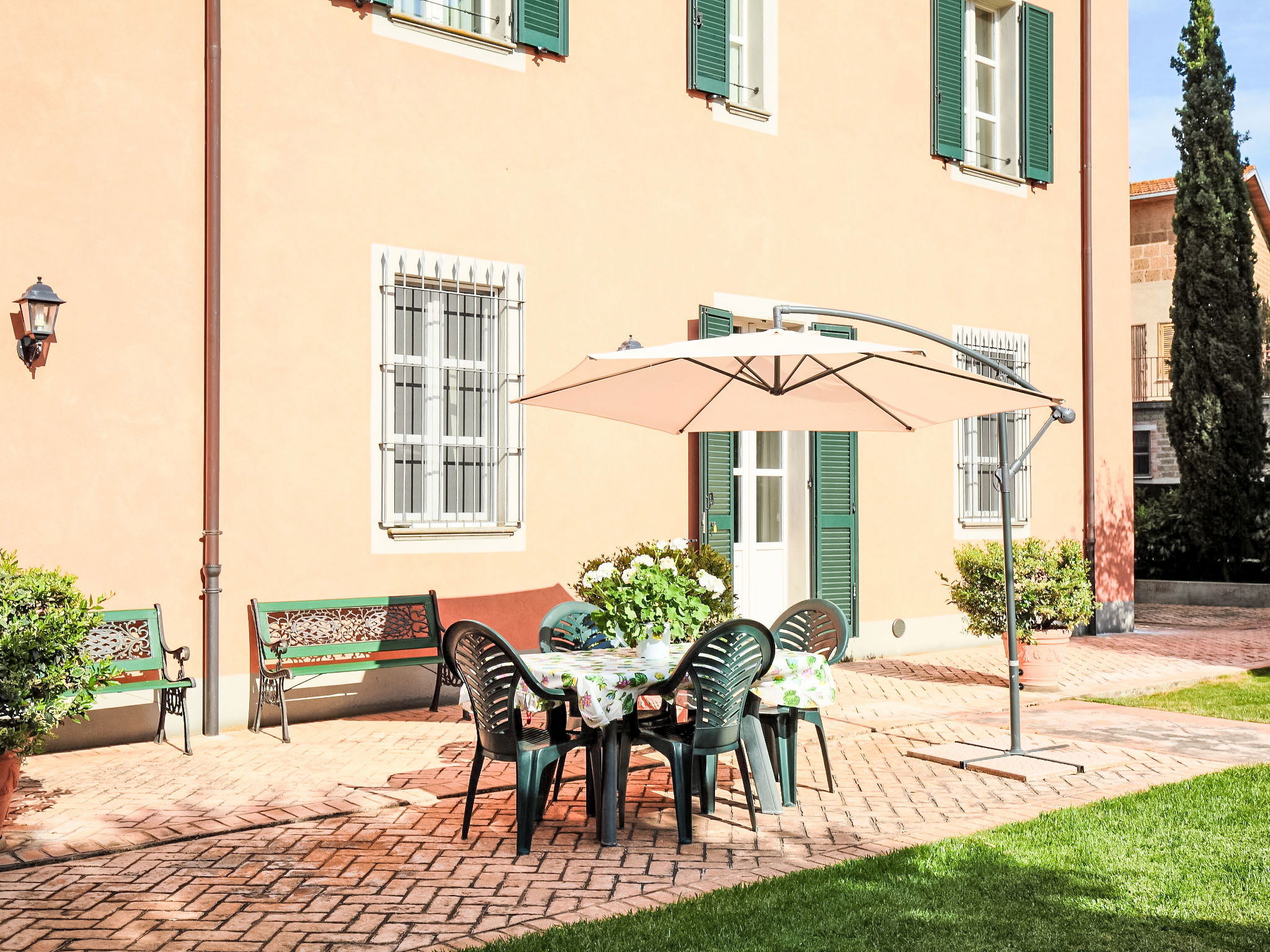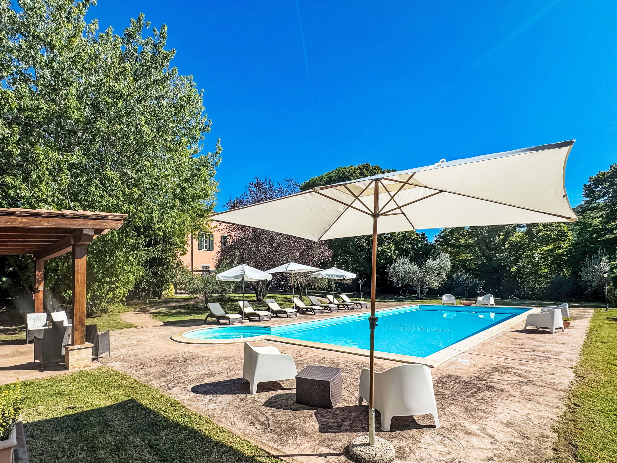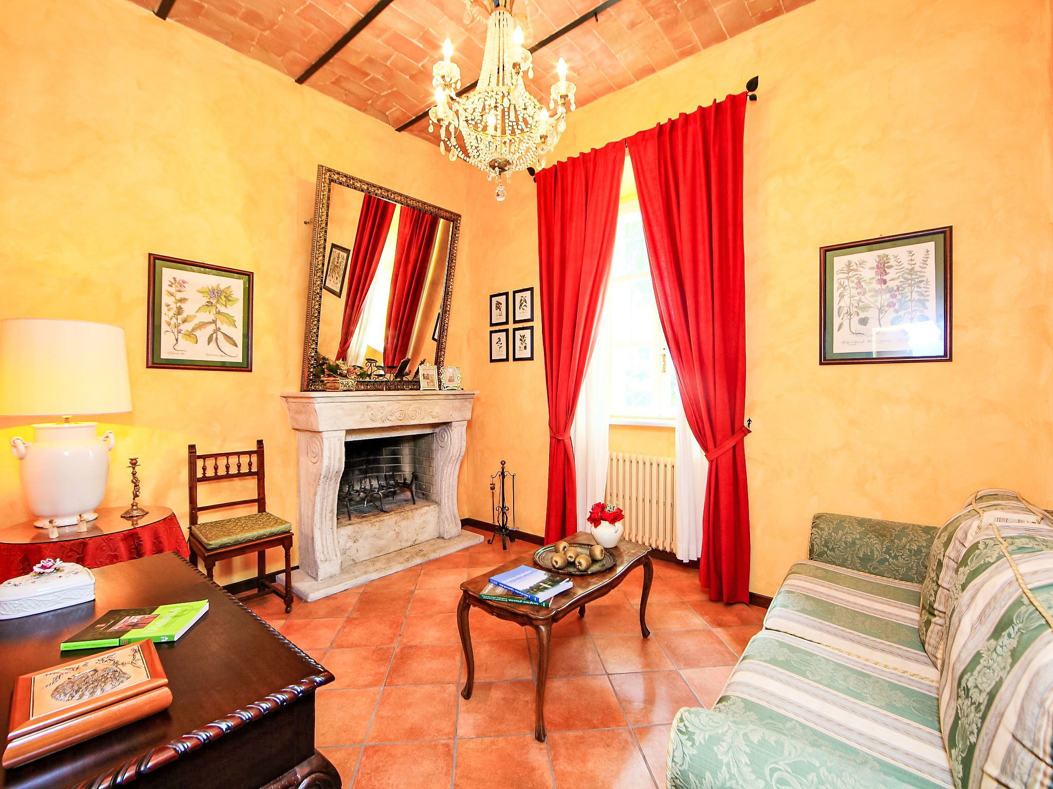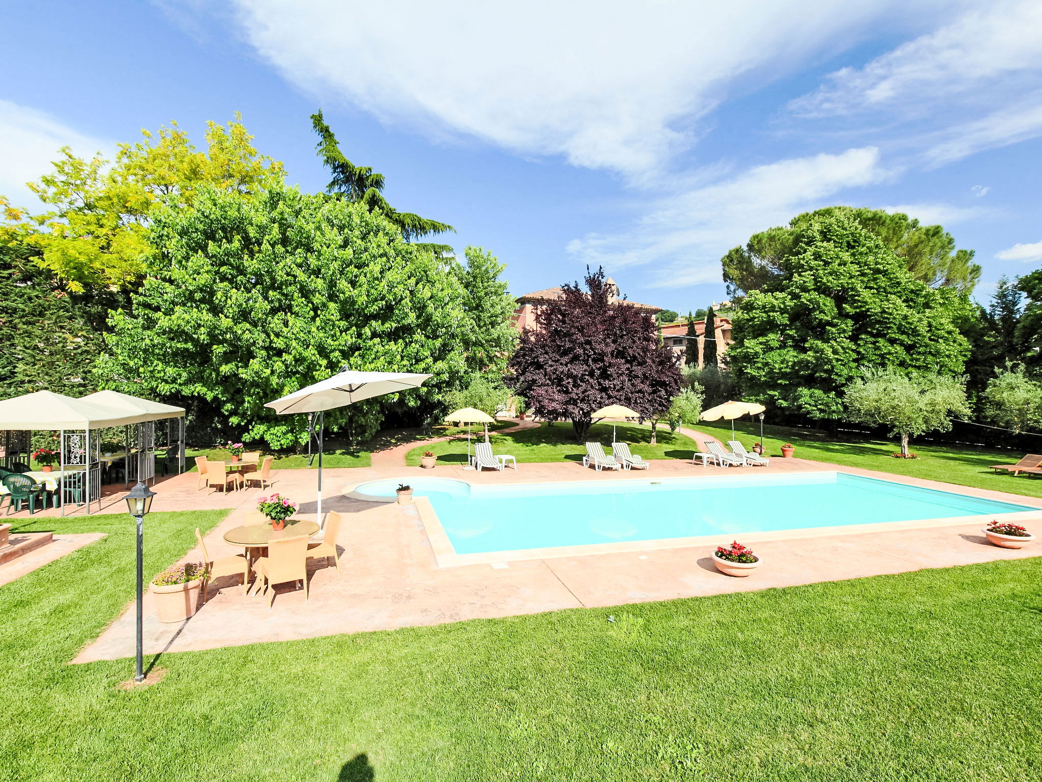 This villa was built around 1850 by a baron of the Perugia aristocracy, relative of the Pope Pio IX. The villa has been recently renovated with absolute care for the original frescos and period furniture. The property is closeby the main road of the village. Florence and Rome 150 km, Todi 30 Km. Spoleto 40 km. Perugia airport 15 km. Villa "Paolotti", built in 1870. In a hamlet 3 km from the centre of Bettona, 18 km from the centre of Perugia, in a sunny position, on a main road. Private: garden (fenced), swimming pool (14 x 6 m, depth 145 cm, seasonal availability: 25.May. - 30.Sep.). Pergola, garden furniture, barbecue. In the house: washing machine. Available: bicycles (4) (extra). Parking on the premises. Grocery 100 m, supermarket 1 km, restaurant 1 km. Riding stable 3 km. Nearby attractions: Assisi 15 km. The owner does not accept any youth groups.