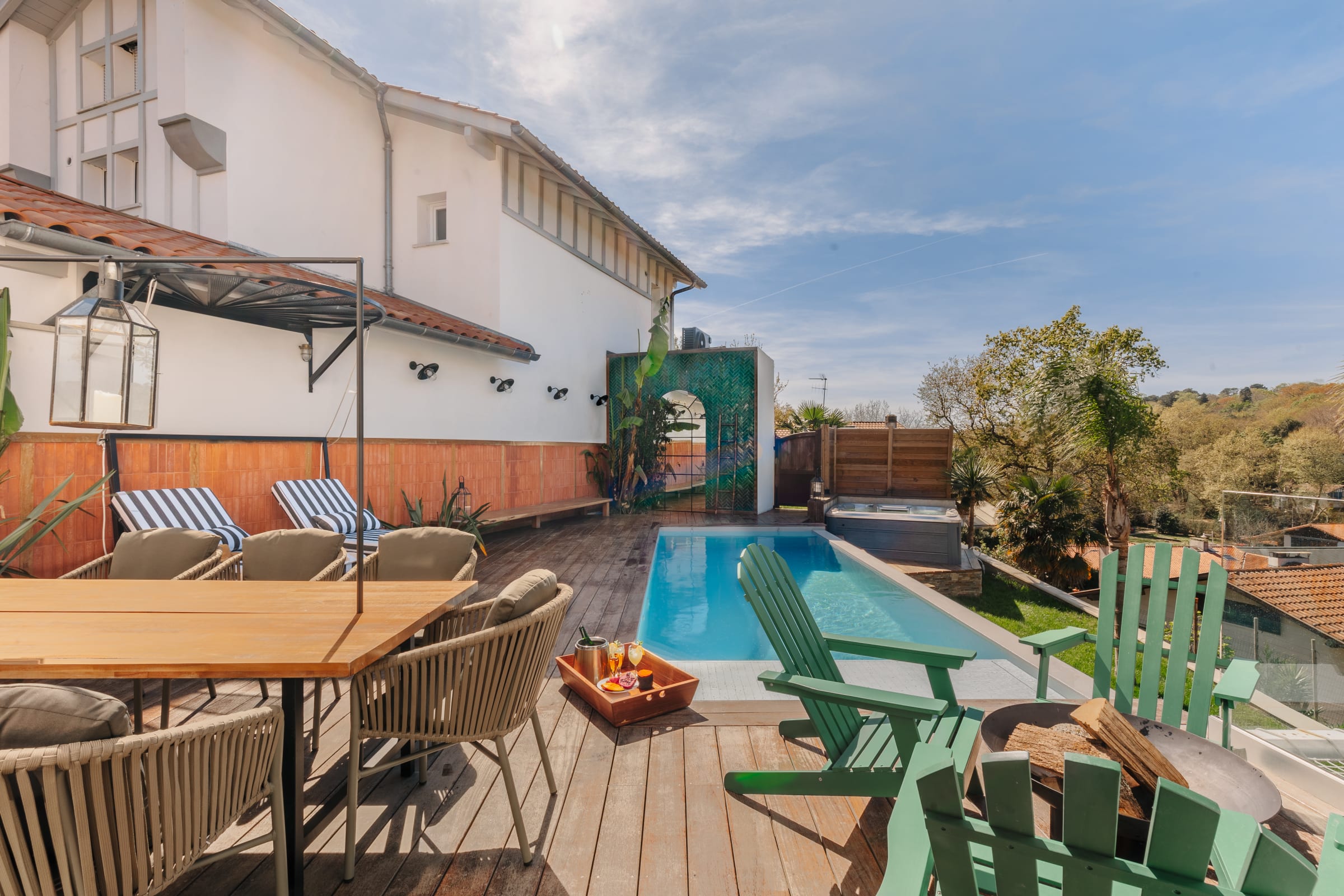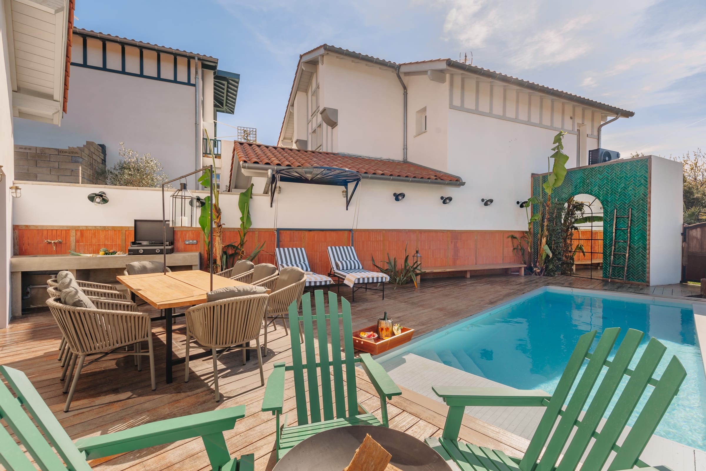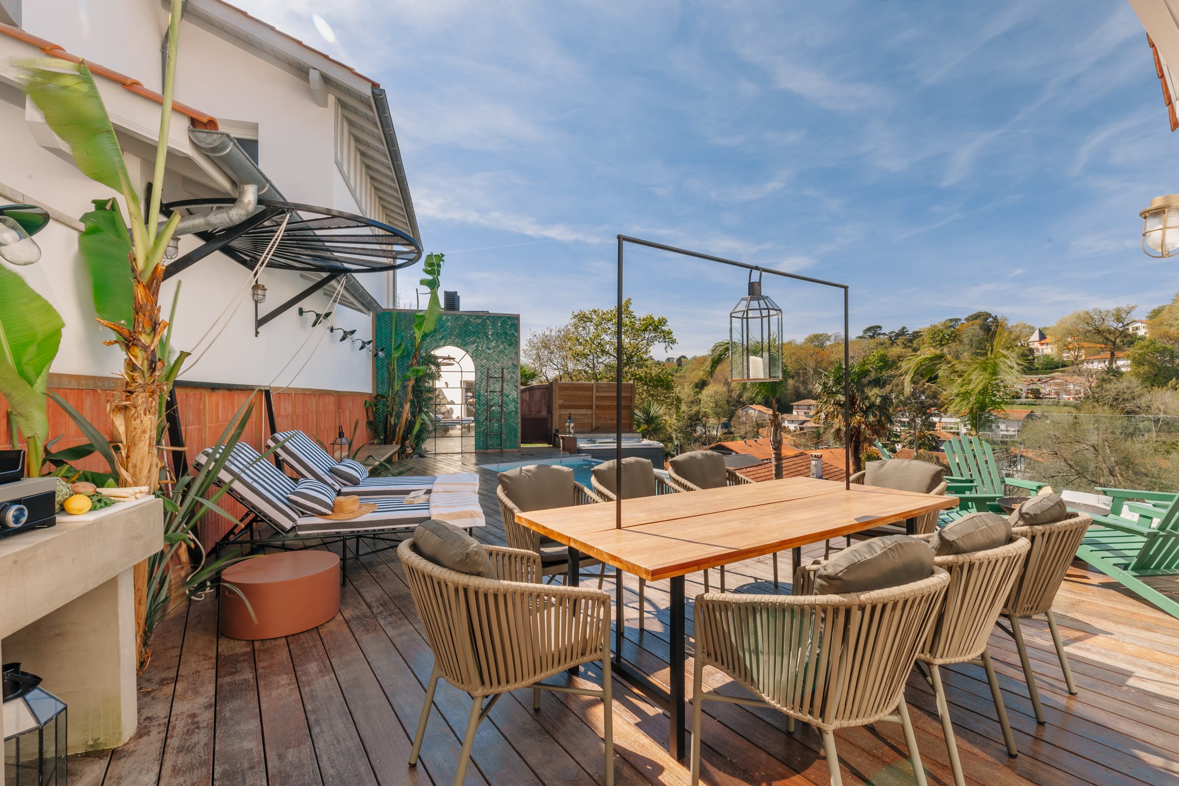 Outside, you will find a large heated swimming pool (open from mid-April to the end of October, weather permitting), a Jacuzzi for relaxing, a hanging net for lounging (maximum 2 people on it), and an outdoor dining area for enjoying grilled food prepared on the plancha.