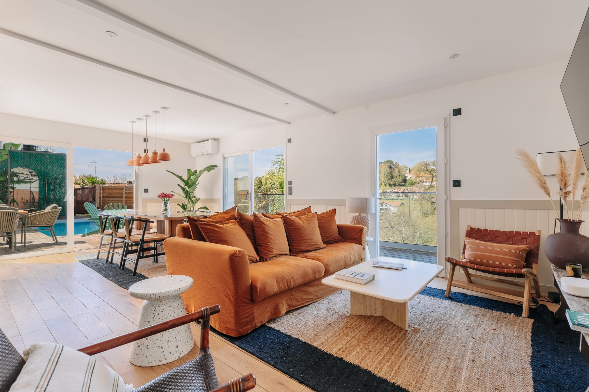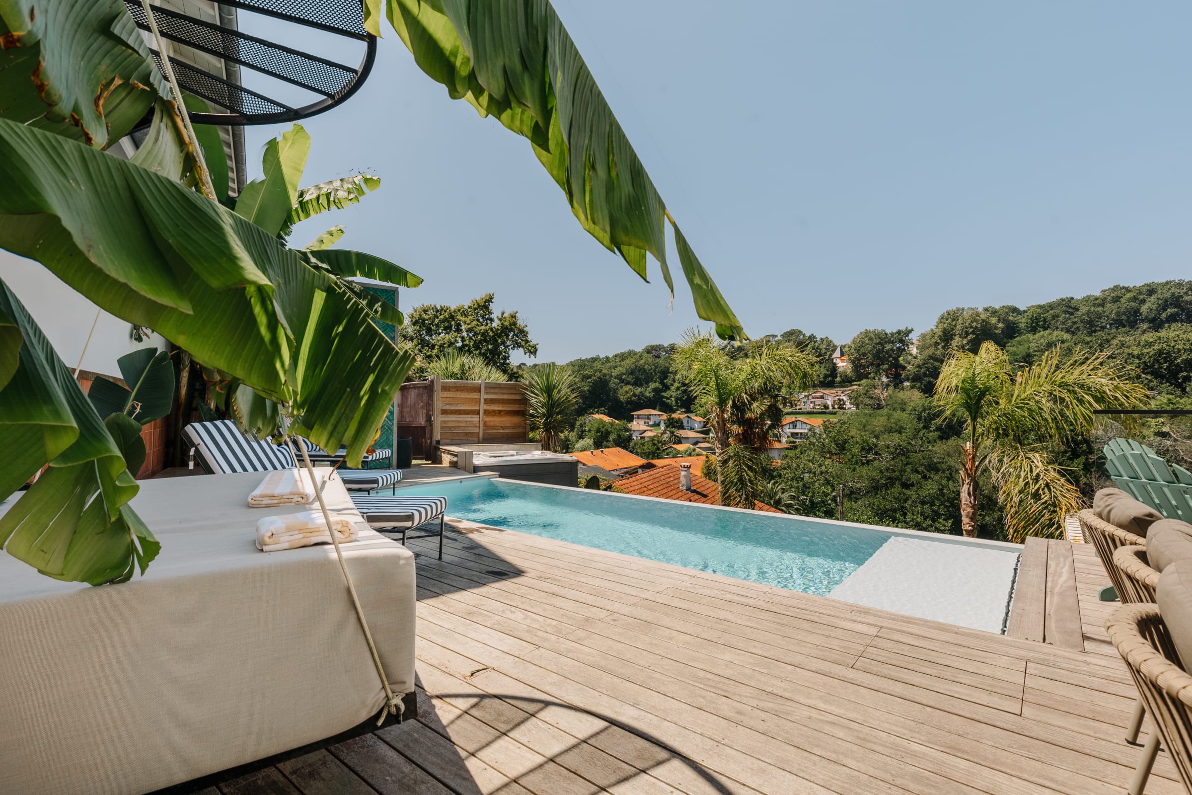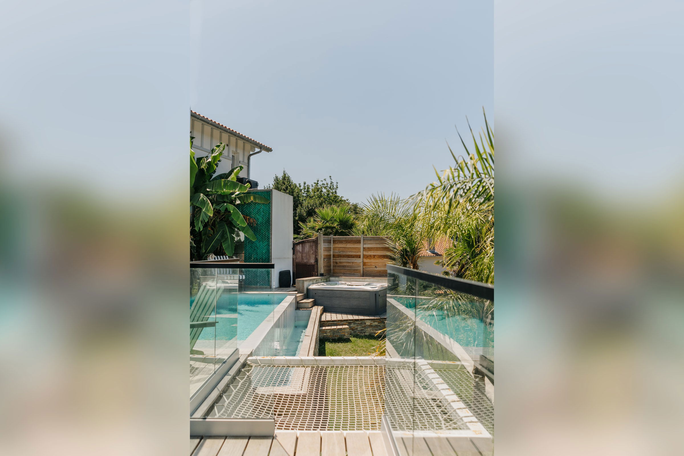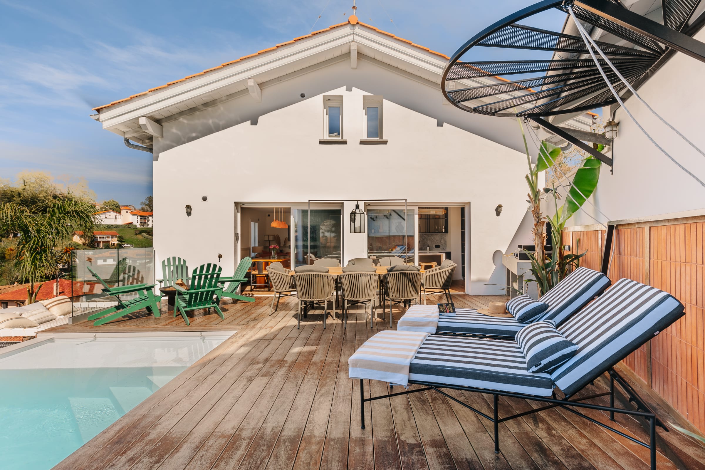 Outside, you will find a large heated swimming pool (open from mid-April to the end of October, weather permitting), a Jacuzzi for relaxing, a hanging net for lounging (maximum 2 people on it), and an outdoor dining area for enjoying grilled food prepared on the plancha.