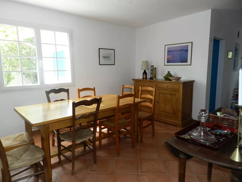 500m from the beach and shops, pleasant single-story villa of 120m² for 10 people, 100m² surface area on a 700m² fenced and wooded plot with terrace and garden furniture. Possibility of parking on the plot.