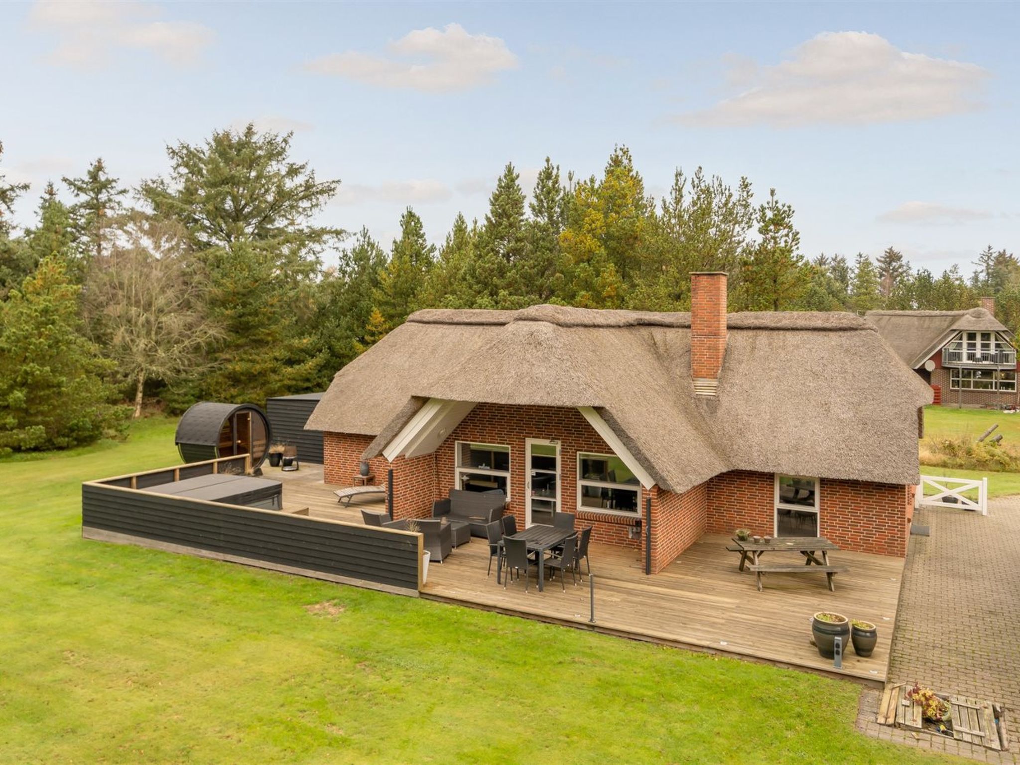 Single-family house, built in 1990. 2.4 km from the sea. Private: natural state property 2'537 m2. Barbecue, children's playground (swing). In the house: washing machine, tumble dryer. Parking at the house. Carport. Grocery 1.8 km. Golf course 5 km. The owner does not accept any youth groups.