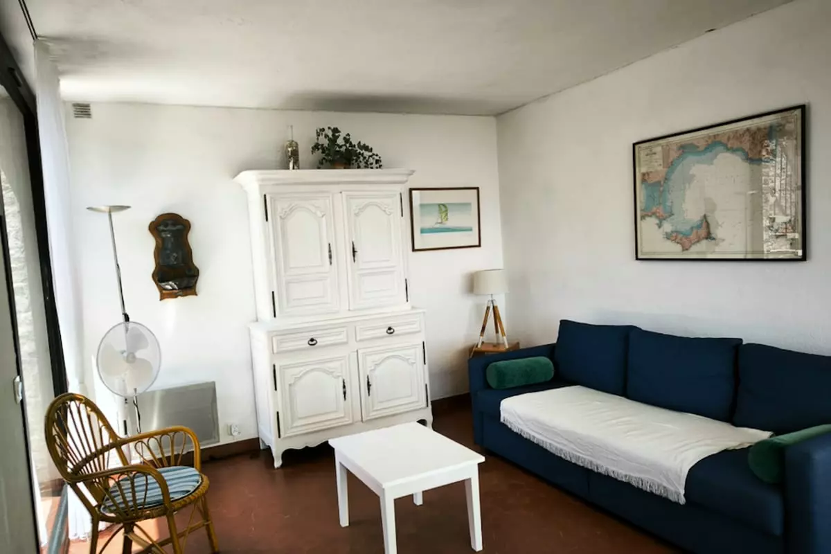 - and a living room area with a convertible sofa.
