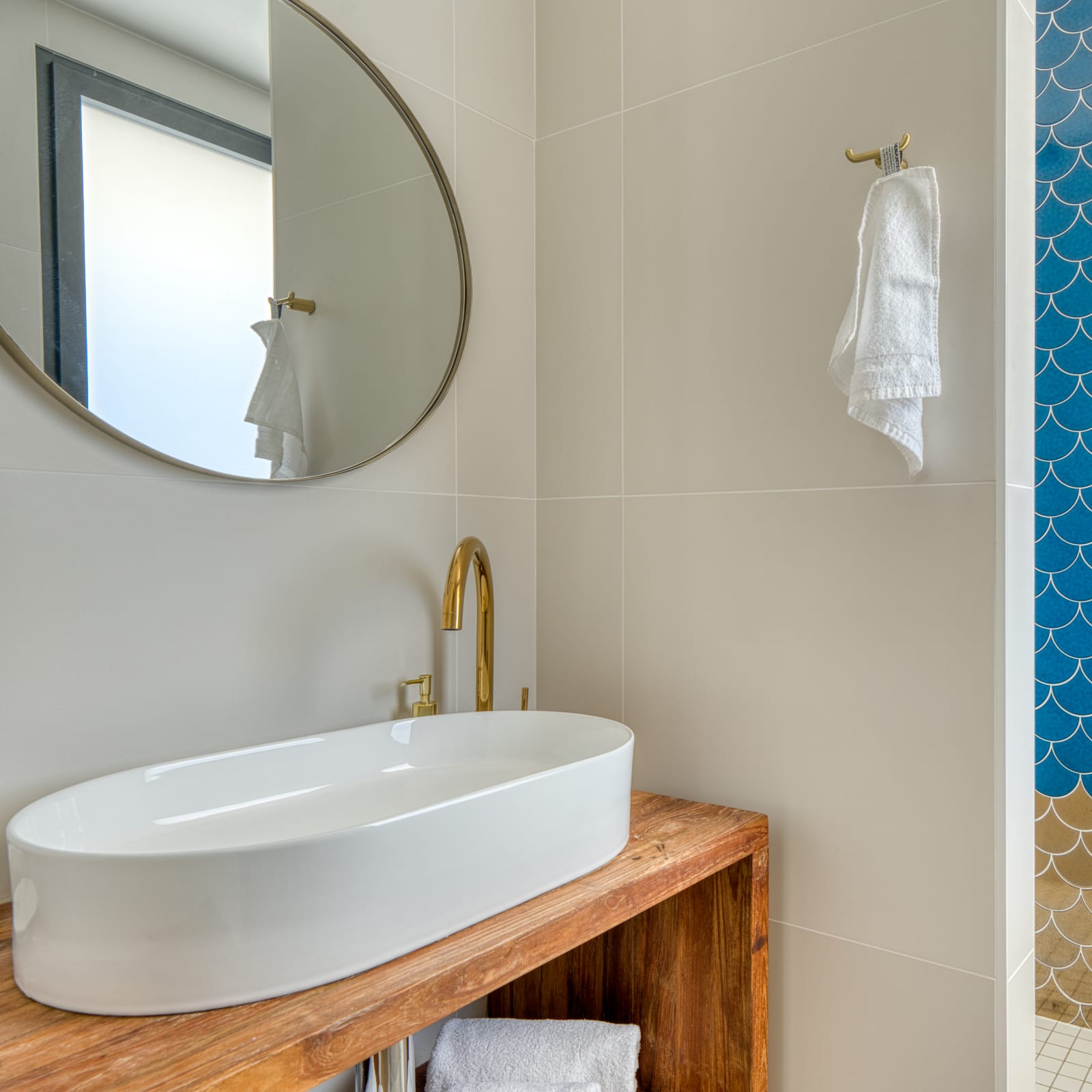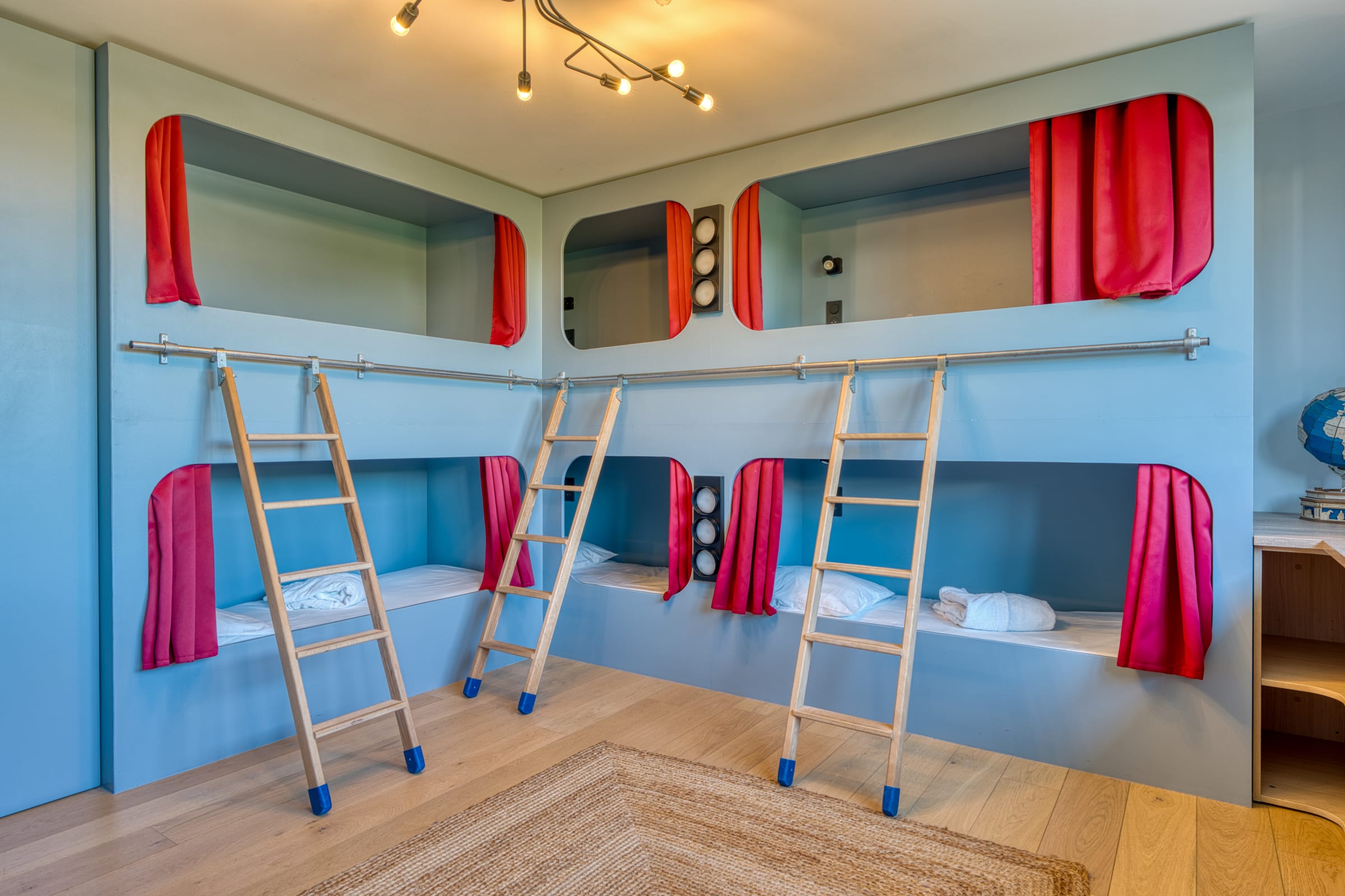The Ocean Villa can accommodate 15 people. It includes 5 bedrooms and a dormitory for children, 5 double beds and 6 single beds, as well as 5 bathrooms and 3 toilets.
