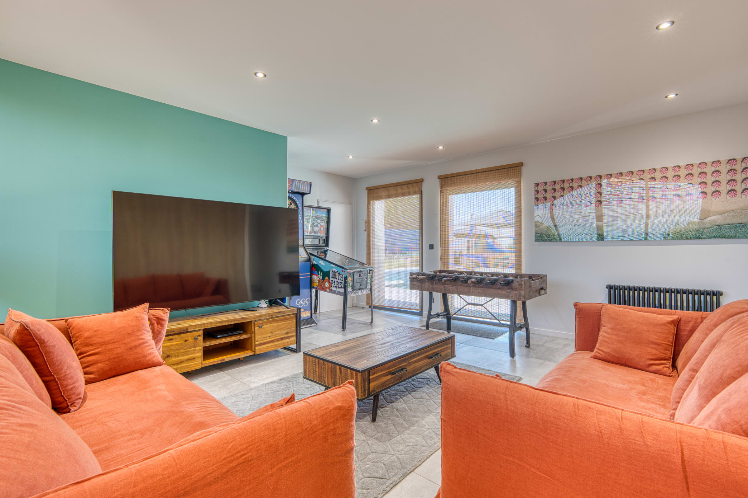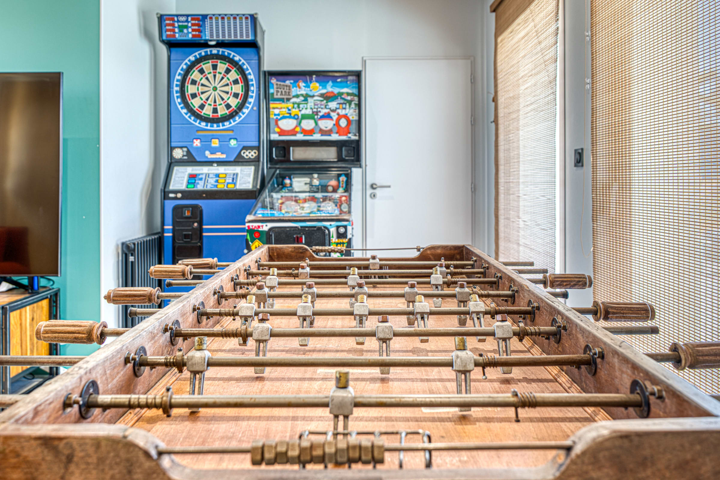 A relaxation area with darts, pinball, Nintendo Switch and board games.