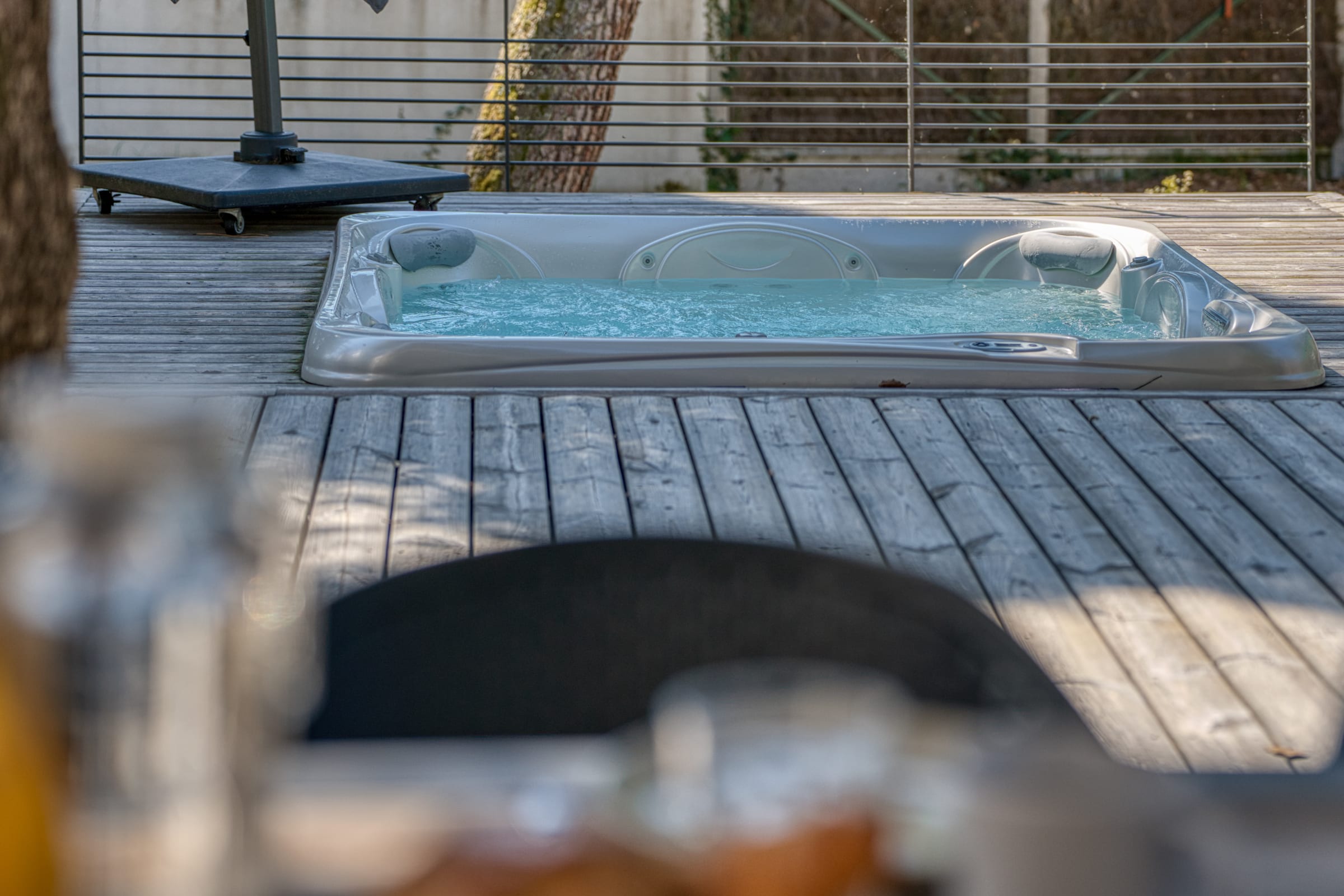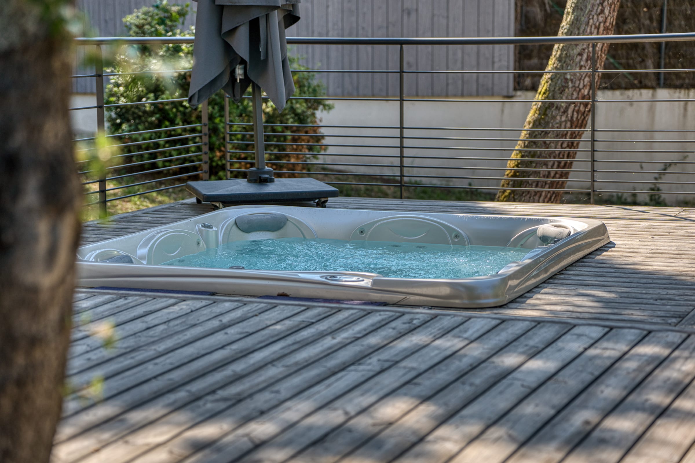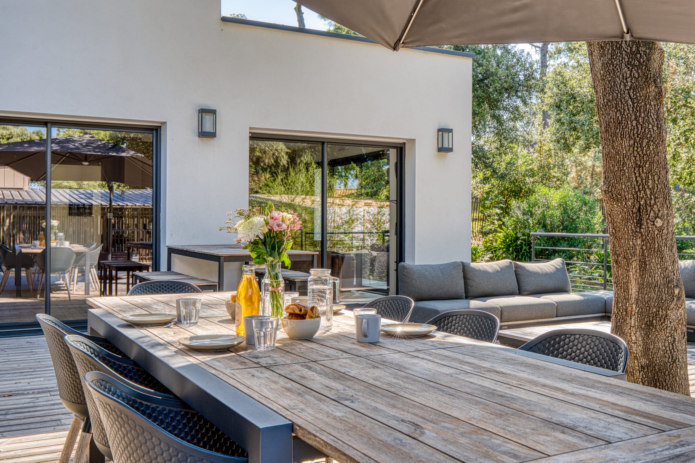The exterior of the villa has been designed as a true cocoon of privacy, cut off from the world. The large terrace invites you to live outdoors: you will find a convivial dining area, an electric plancha for your summer barbecues, as well as a complete garden lounge with sun loungers. For absolute relaxation, a luxurious private outdoor spa (hot tub) awaits you for long moments of relaxation under the pines.