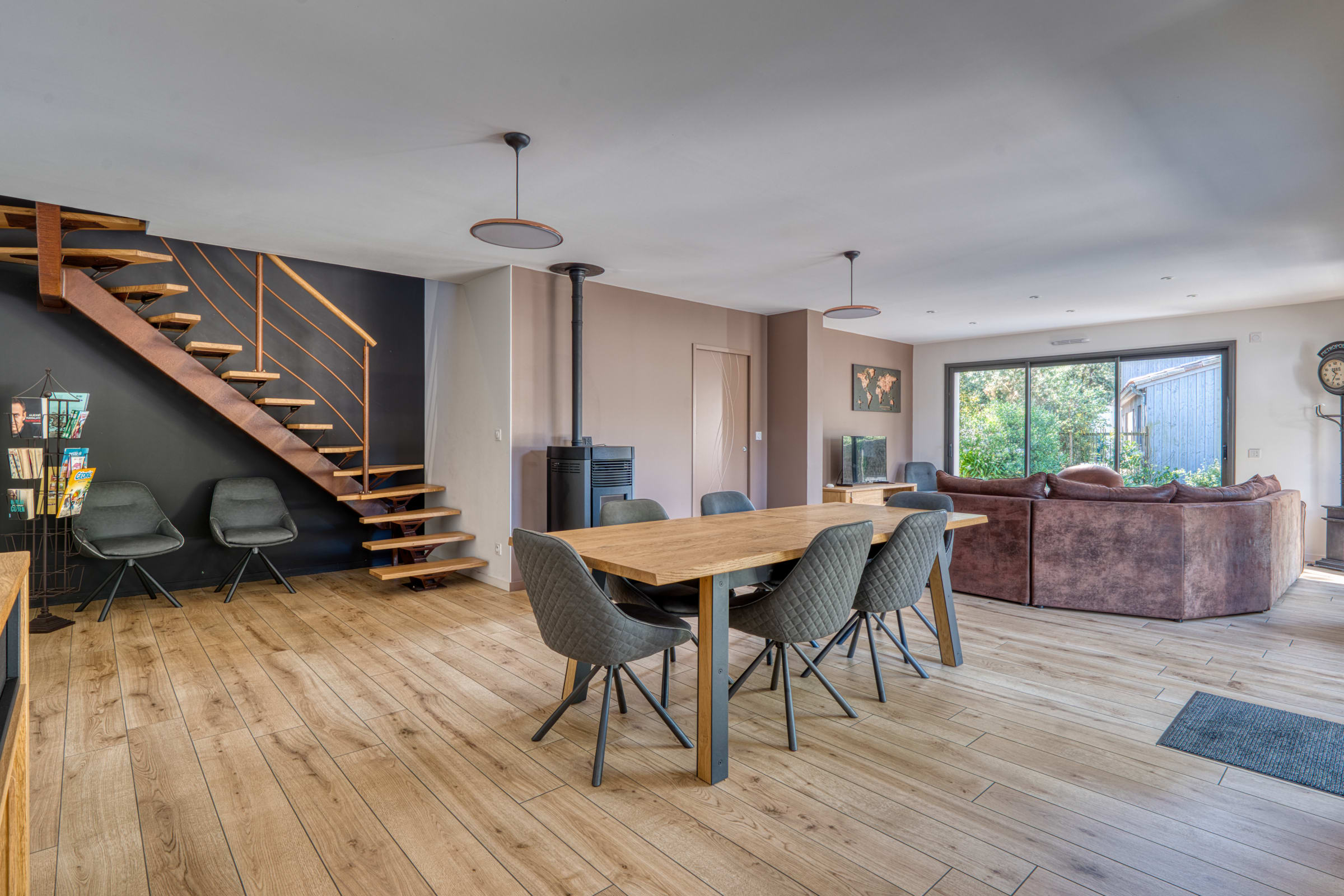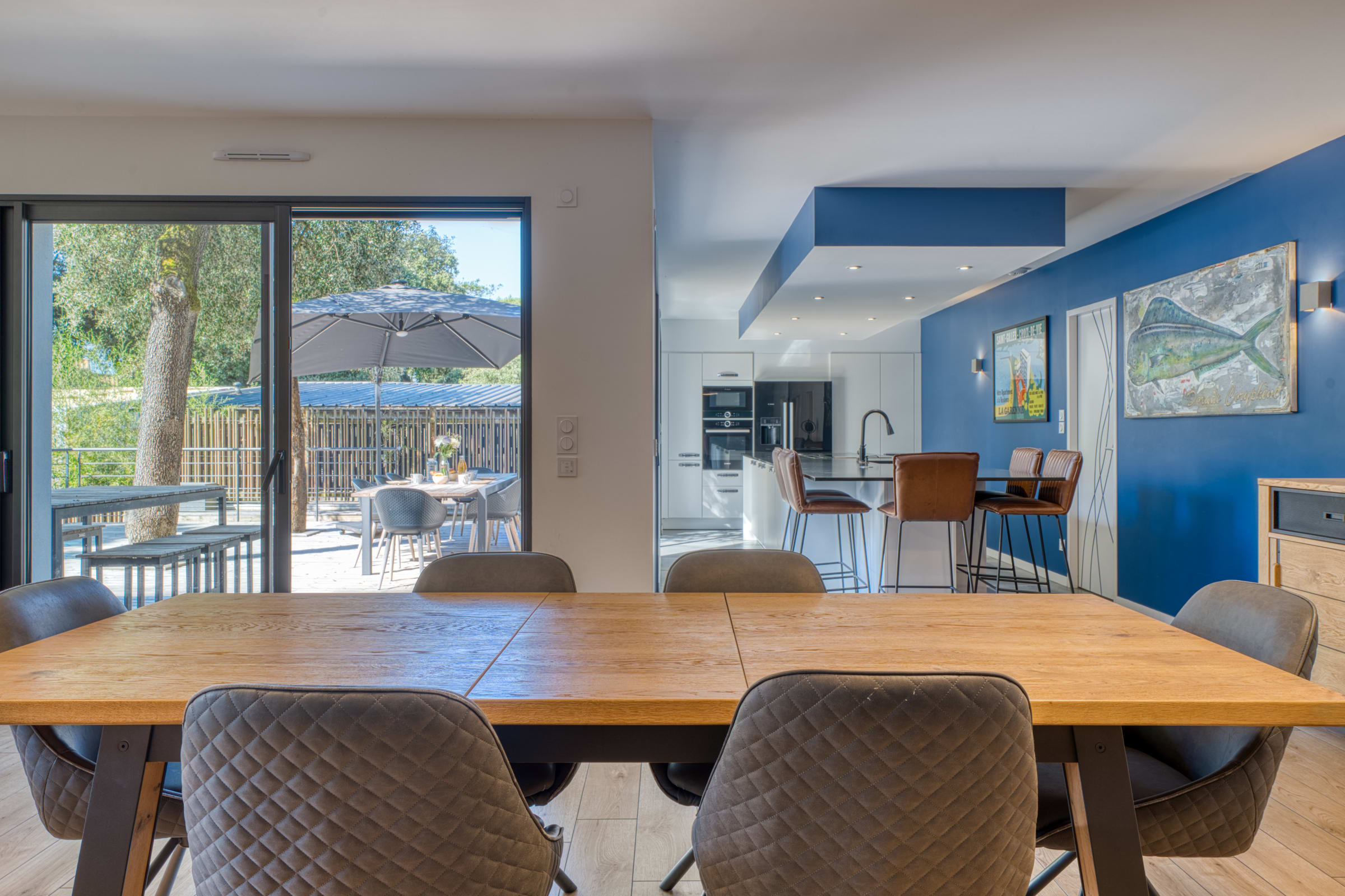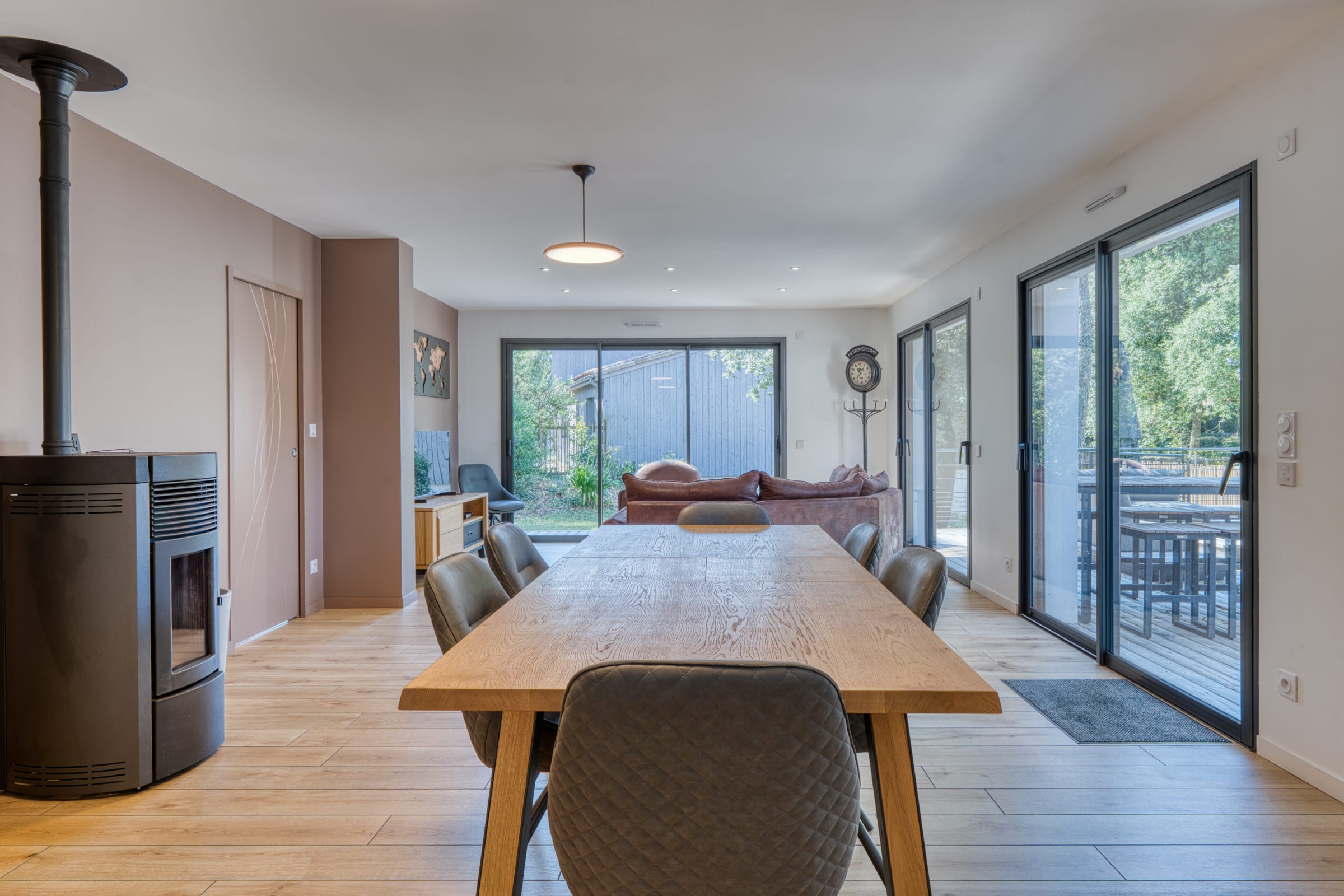The heart of the villa opens onto a particularly bright and comfortable living area, designed for conviviality. It features a cozy lounge equipped with a TV area and a pellet stove, promising sweet evenings during your off-season stays. Beyond this, you will discover a beautiful American-style kitchen, fully equipped (American fridge, freezer, induction hob, oven, microwave, dishwasher, Nespresso and filter coffee machines, etc.), allowing you to easily prepare your meals while enjoying the company of your loved ones.