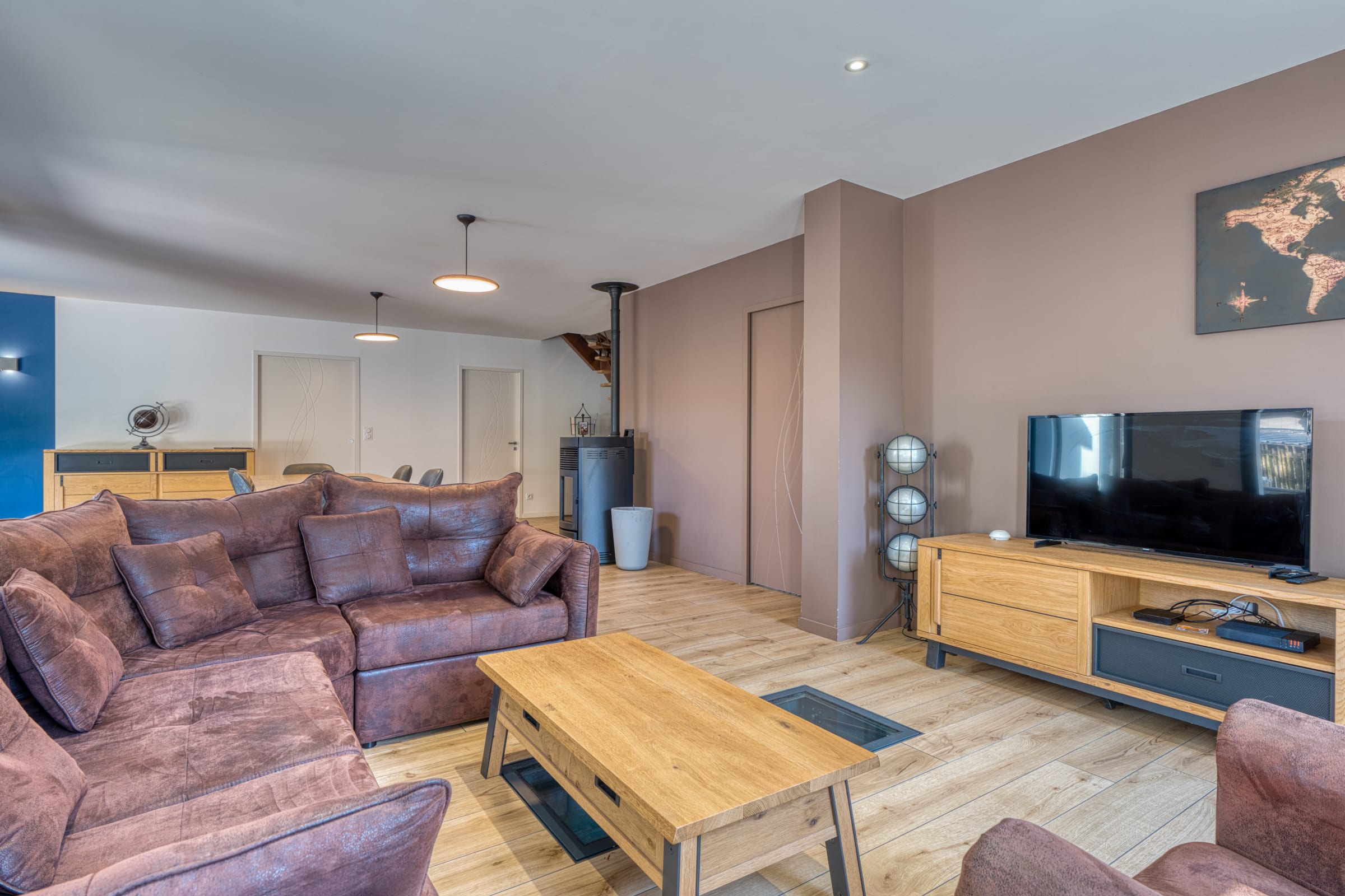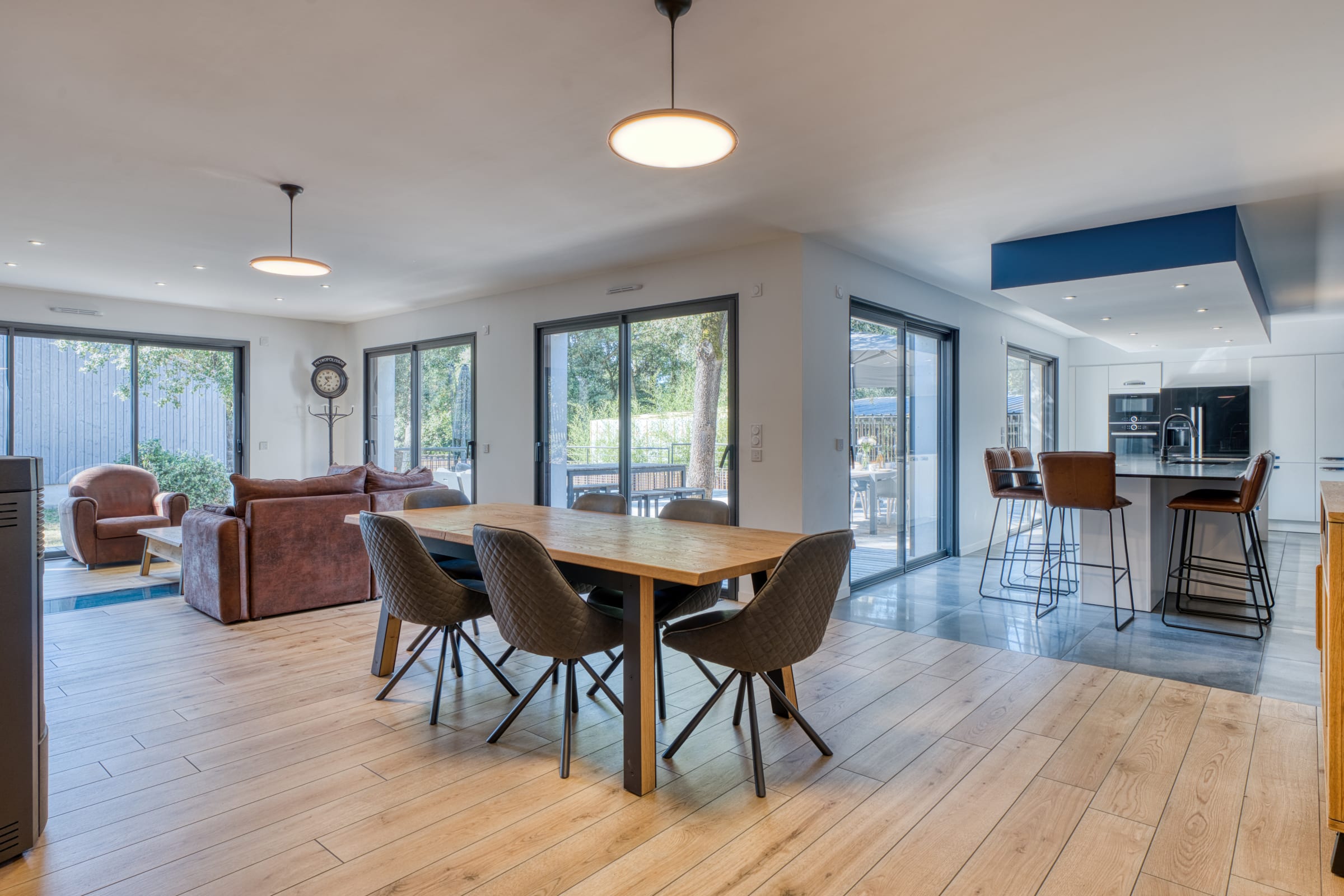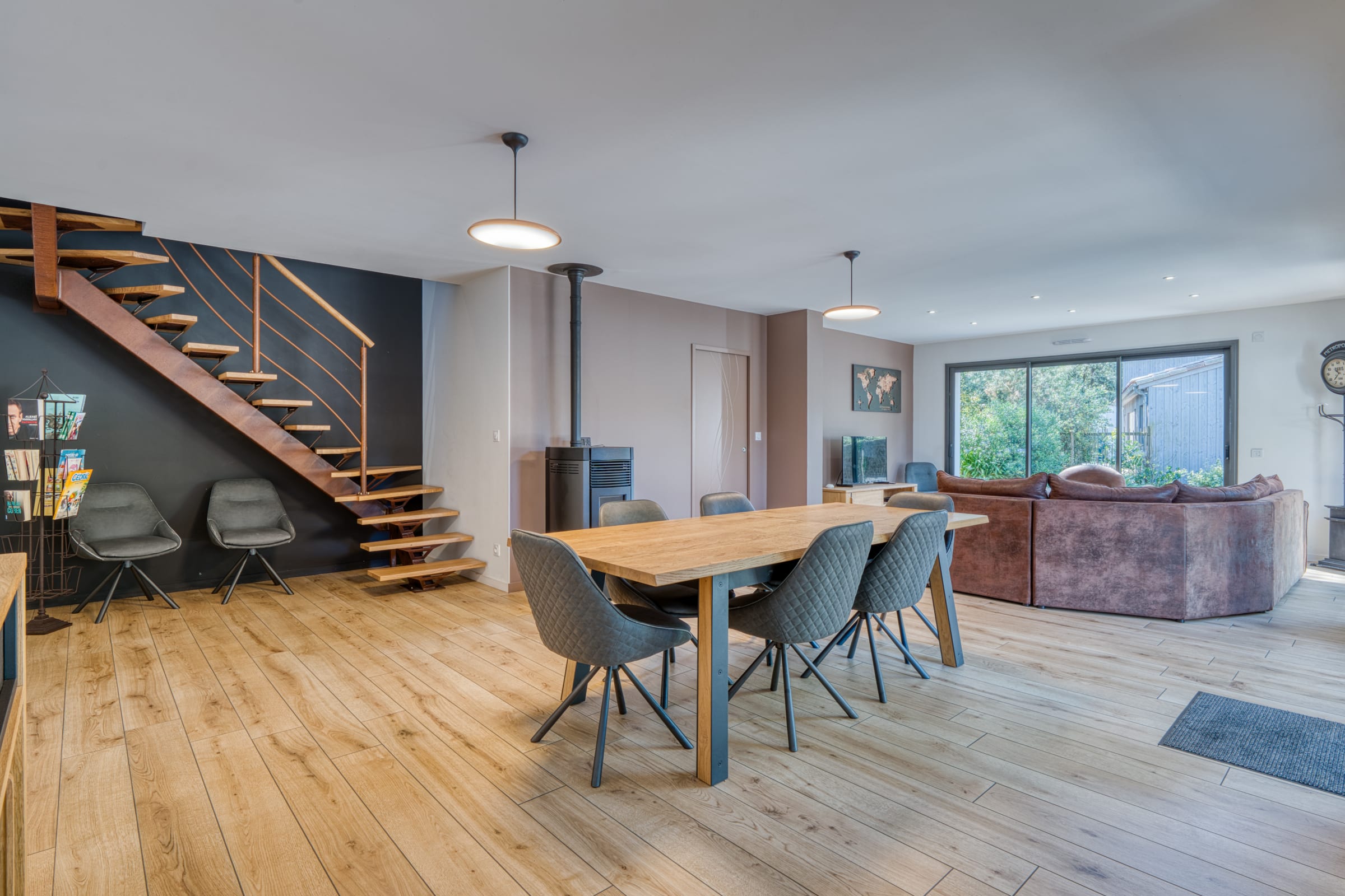 The heart of the villa opens onto a particularly bright and comfortable living area, designed for conviviality. It features a cozy lounge equipped with a TV area and a pellet stove, promising sweet evenings during your off-season stays. Beyond this, you will discover a beautiful American-style kitchen, fully equipped (American fridge, freezer, induction hob, oven, microwave, dishwasher, Nespresso and filter coffee machines, etc.), allowing you to easily prepare your meals while enjoying the company of your loved ones.