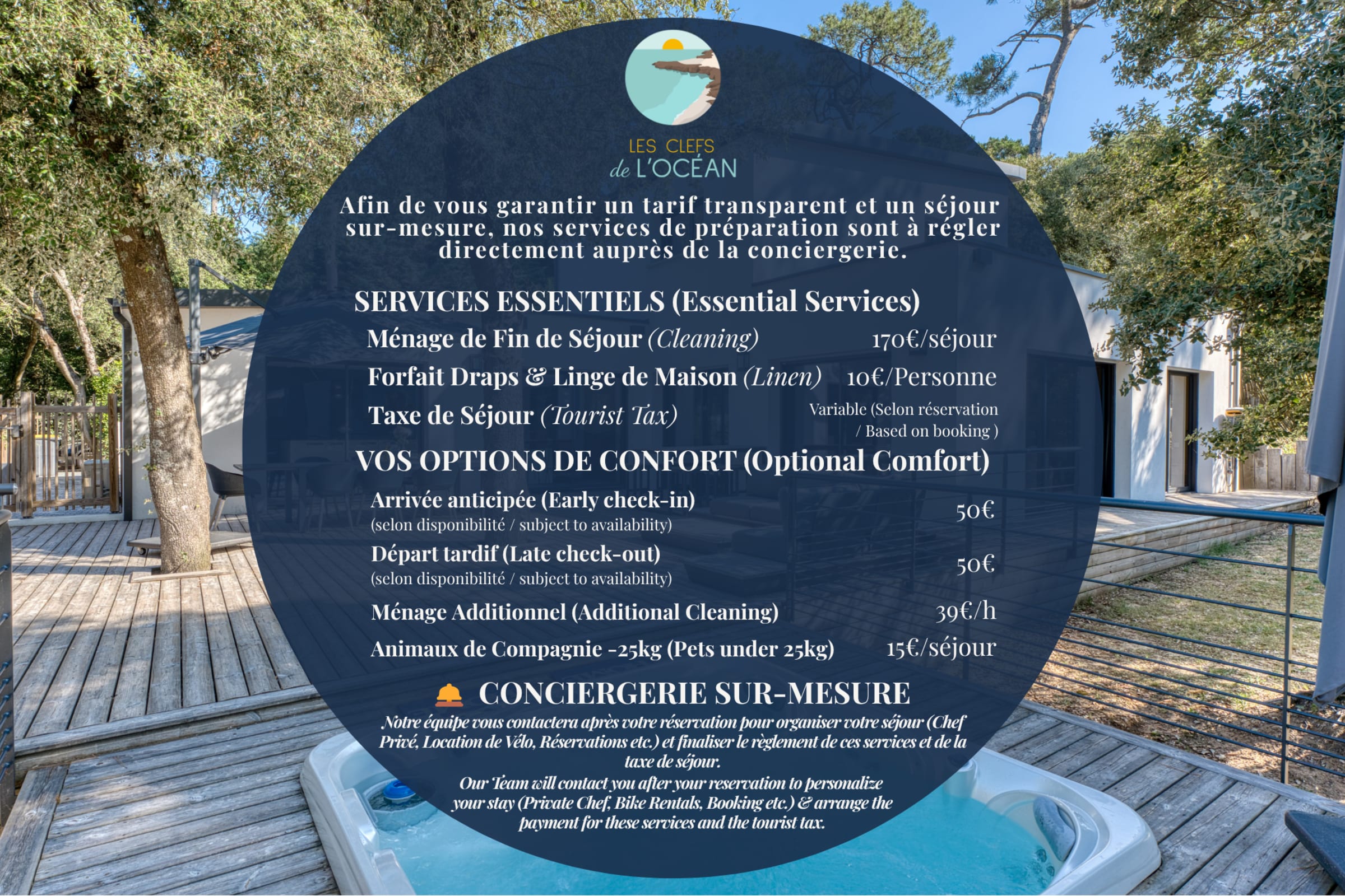 To guarantee you a hotel-quality standard and complete transparency regarding preparation fees, which are not included in the platform booking, payment is made directly to our concierge service "Les Clefs de l'Océan" after your reservation.