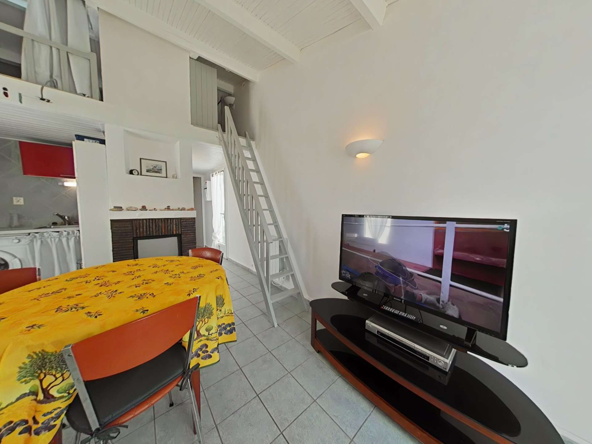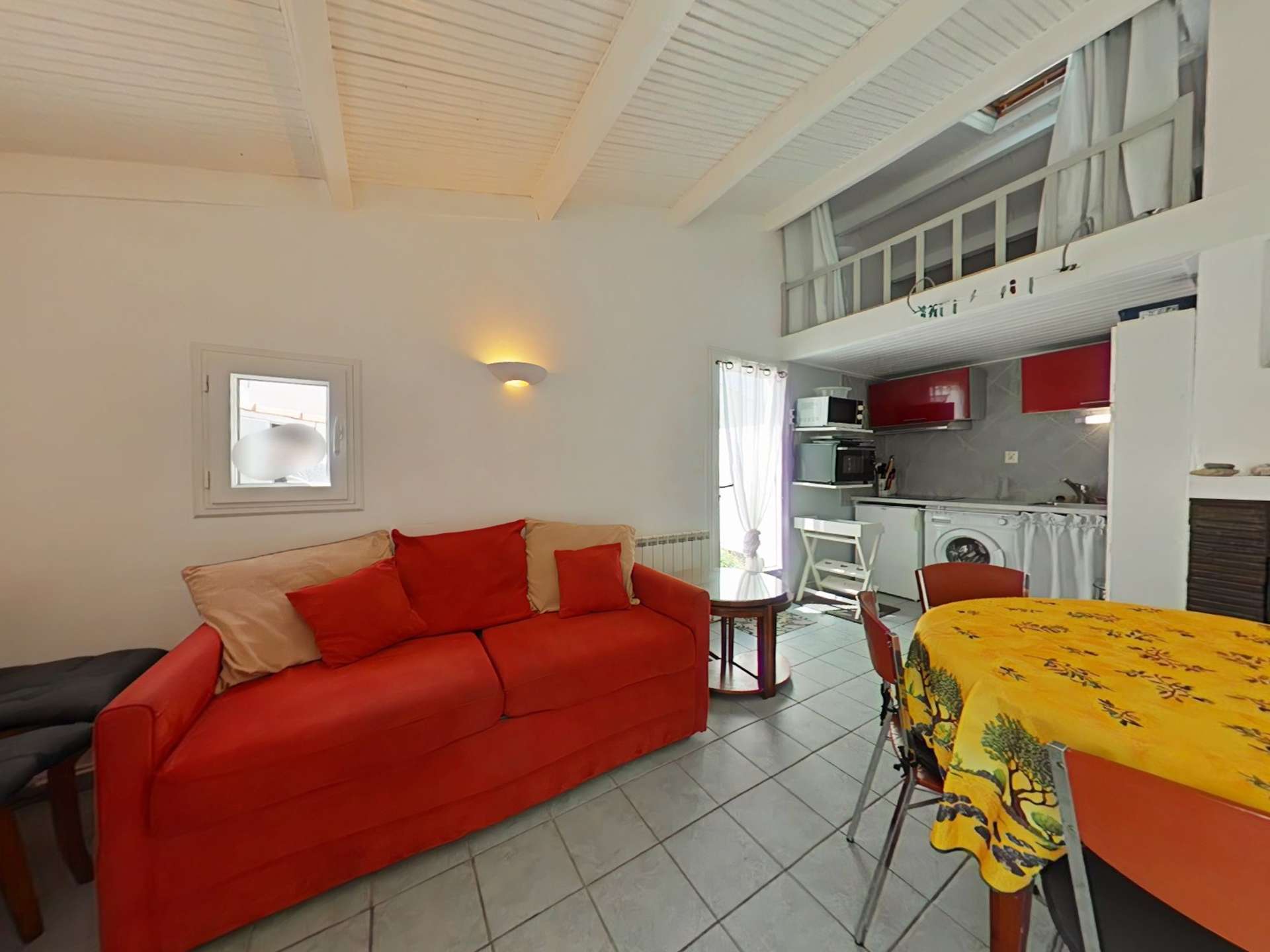 This comfortable holiday rental includes a fully equipped kitchenette with a microwave and washing machine, a living room with a sofa bed and TV, a bedroom with a double bed (160cm), a loft-style mezzanine (max height 1.40m) accessible via a ladder with two single beds (90cm), a bathroom, a separate toilet, and an outdoor storage shed.