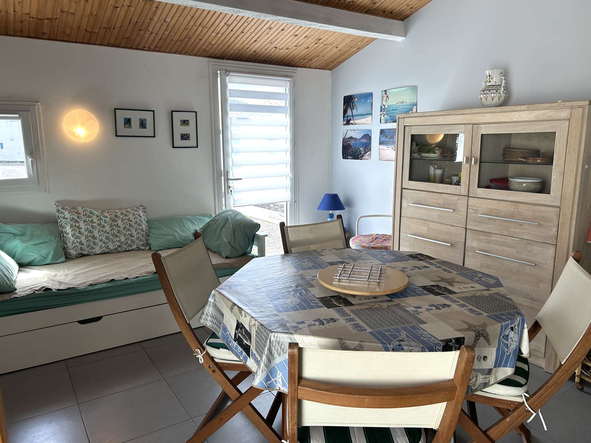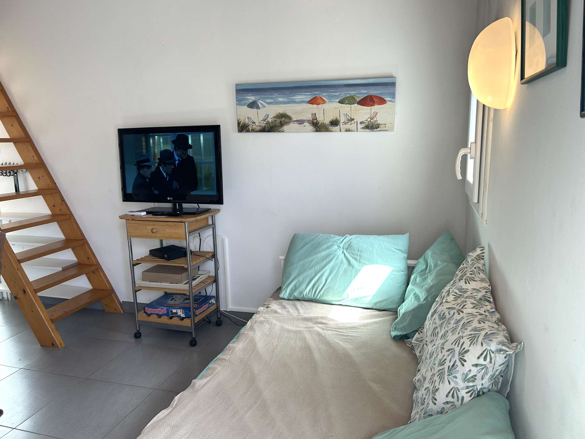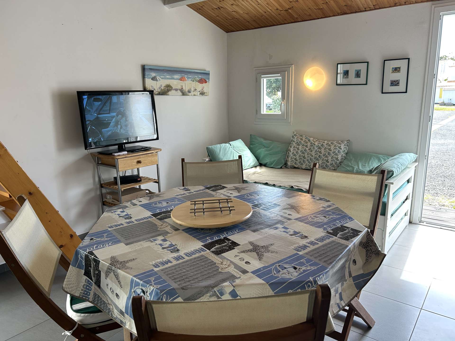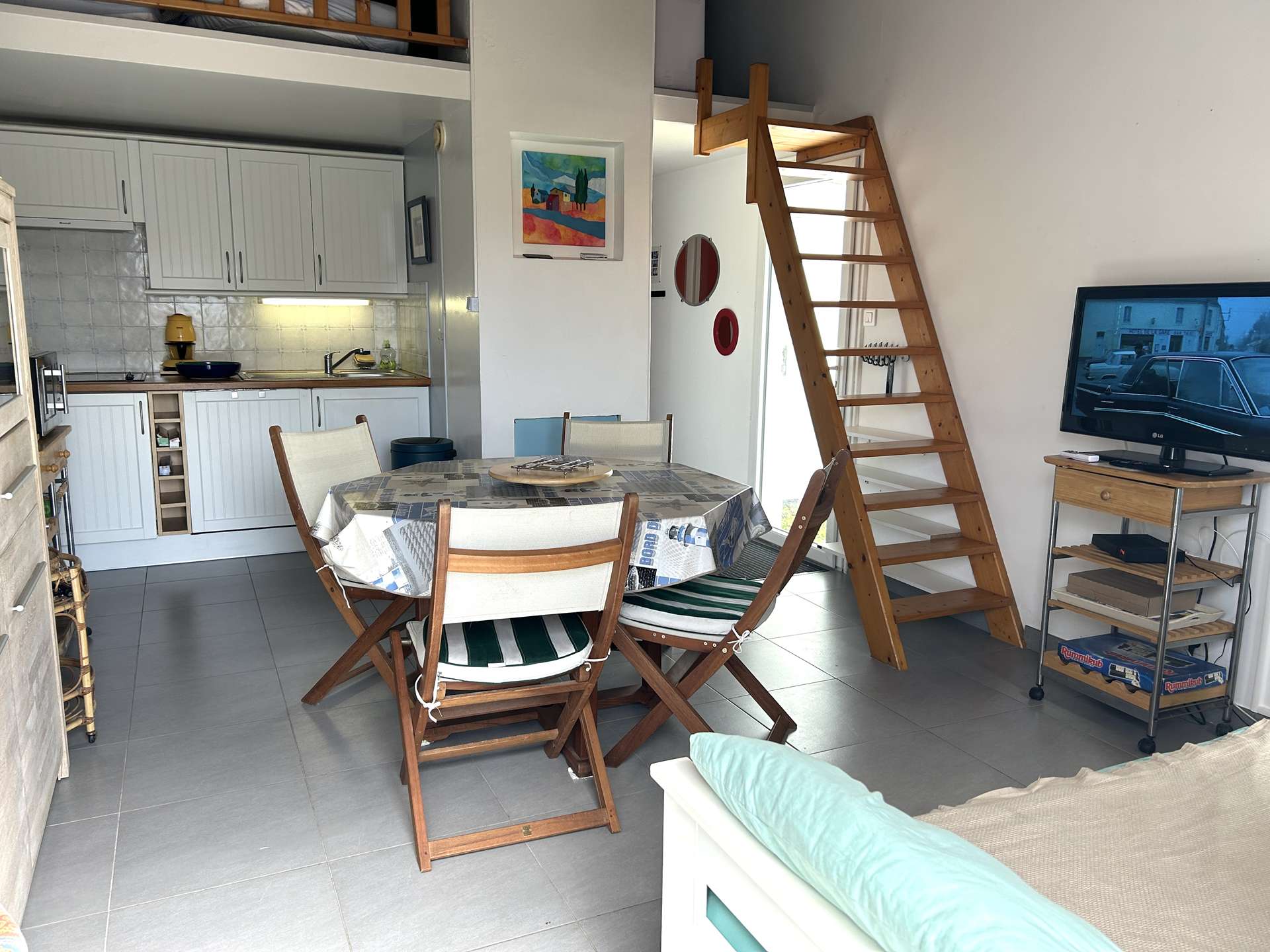 This holiday home includes an equipped kitchenette (dishwasher), a living room with television and sofa bed for two people, a bedroom with a double bed, a mezzanine (maximum height 1.40m with access via a miller's ladder) with two single beds, a shower room, a separate toilet.