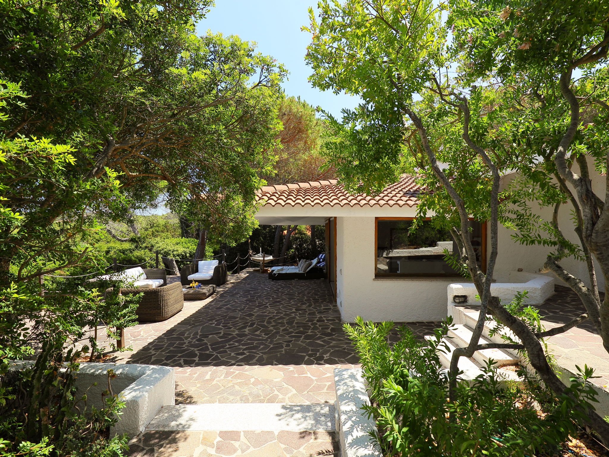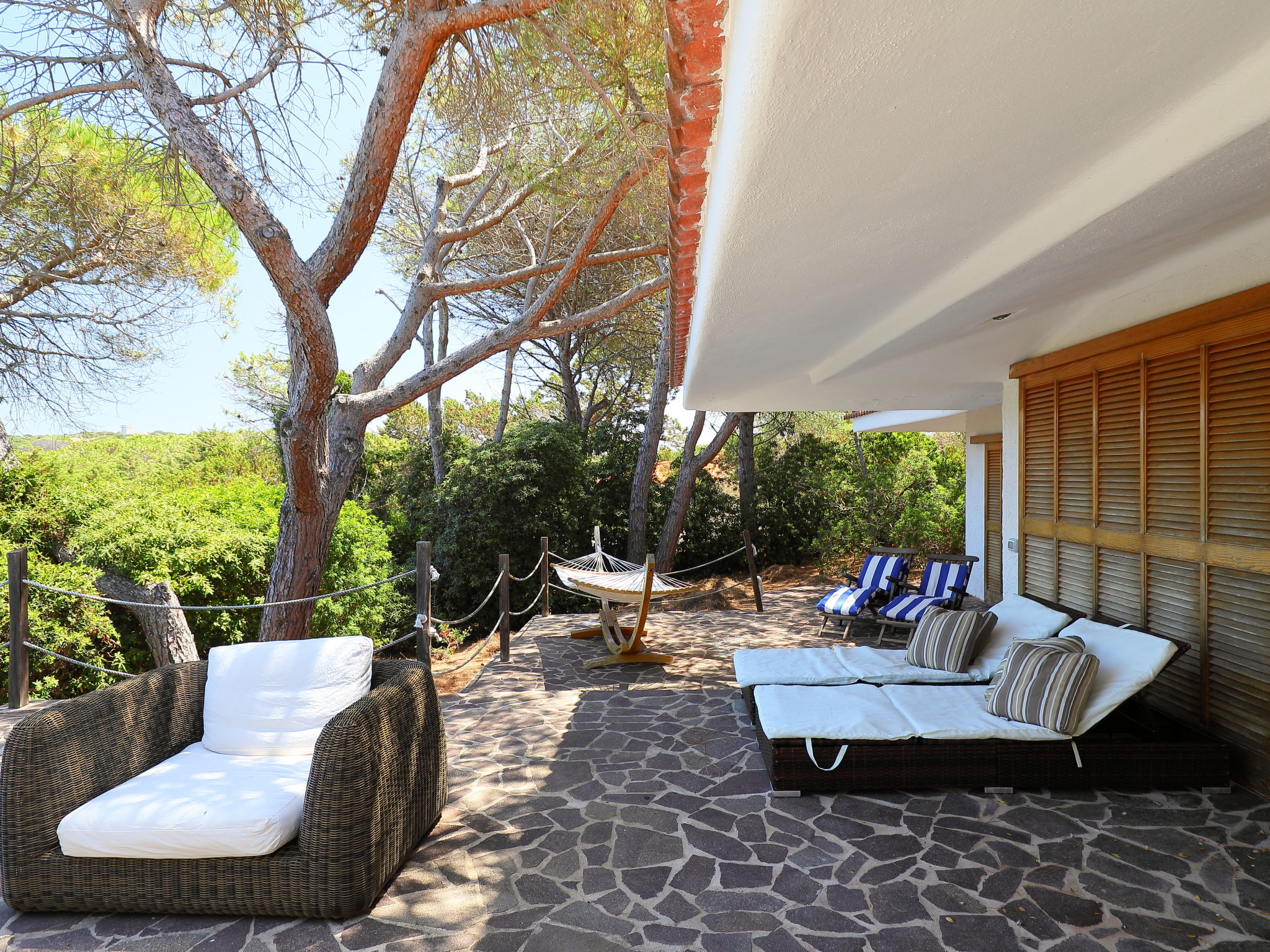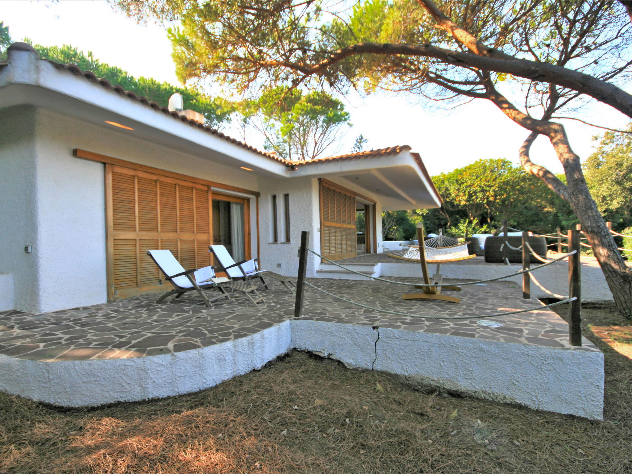 4-room house 120 m2. Large living/dining room, on 2 levels with satellite TV. Exit to the terrace. 1 double bedroom with shower/bidet/WC. Exit to the terrace. 1 room with 1 x 2 bunk beds. Exit to the garden. 1 room with 1 bed and 1 french bed. Exit to the garden. Open kitchen (4 hot plates, oven, dishwasher, microwave, freezer, electric coffee machine). Exit to the terrace. Shower/bidet/WC. No heating option. Parquet floors. Large terrace partly roofed. Terrace furniture, barbecue, deck chairs (2). Facilities: washing machine, hair dryer. Internet (WiFi, free). Maximum 1 pet/ dog allowed. IT090062C2000Q2681