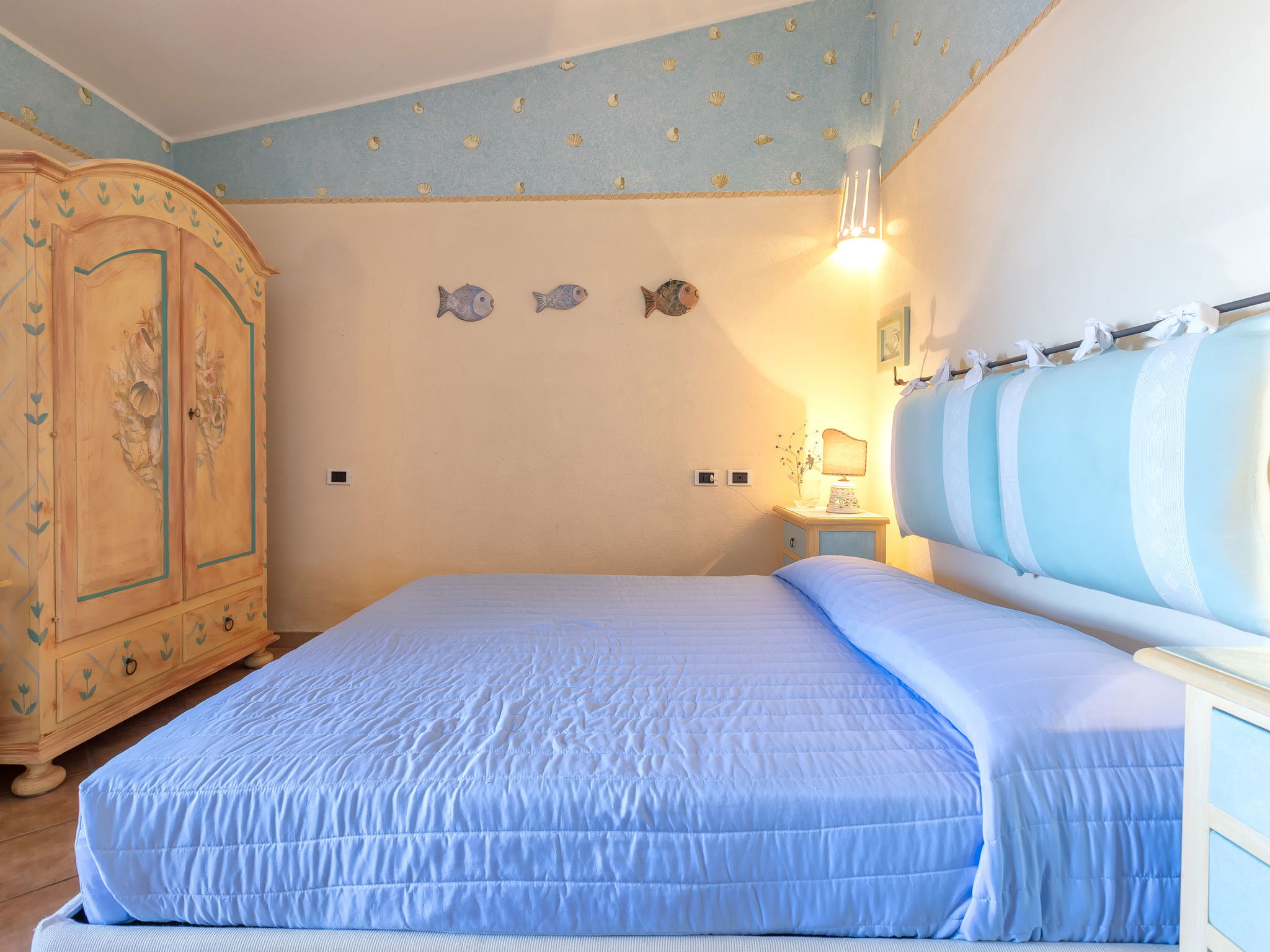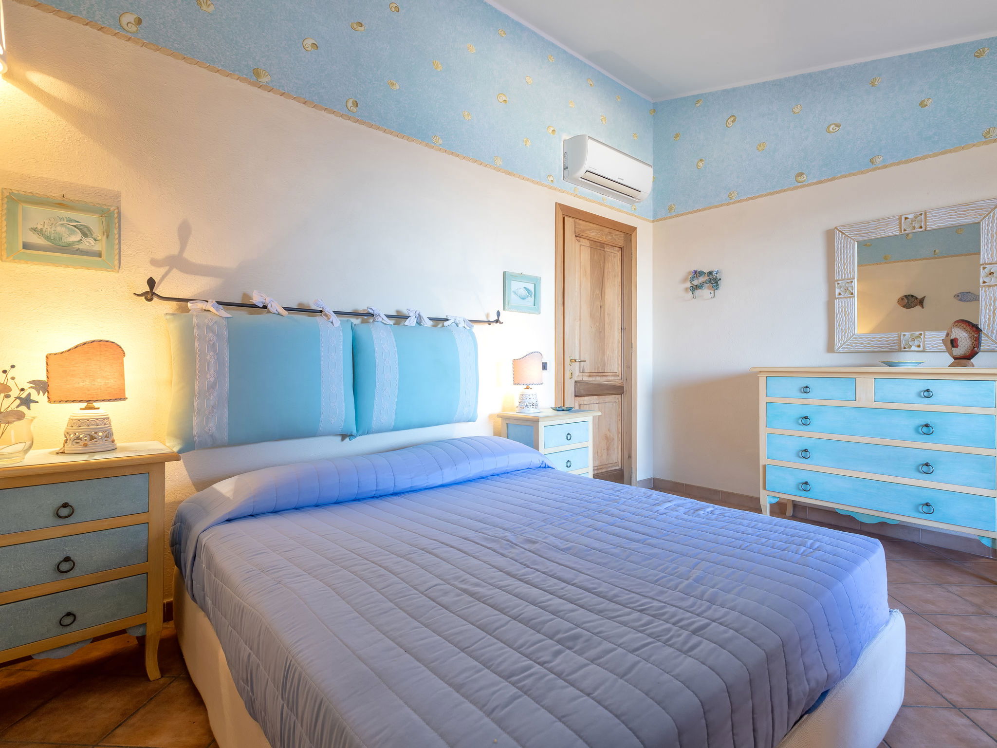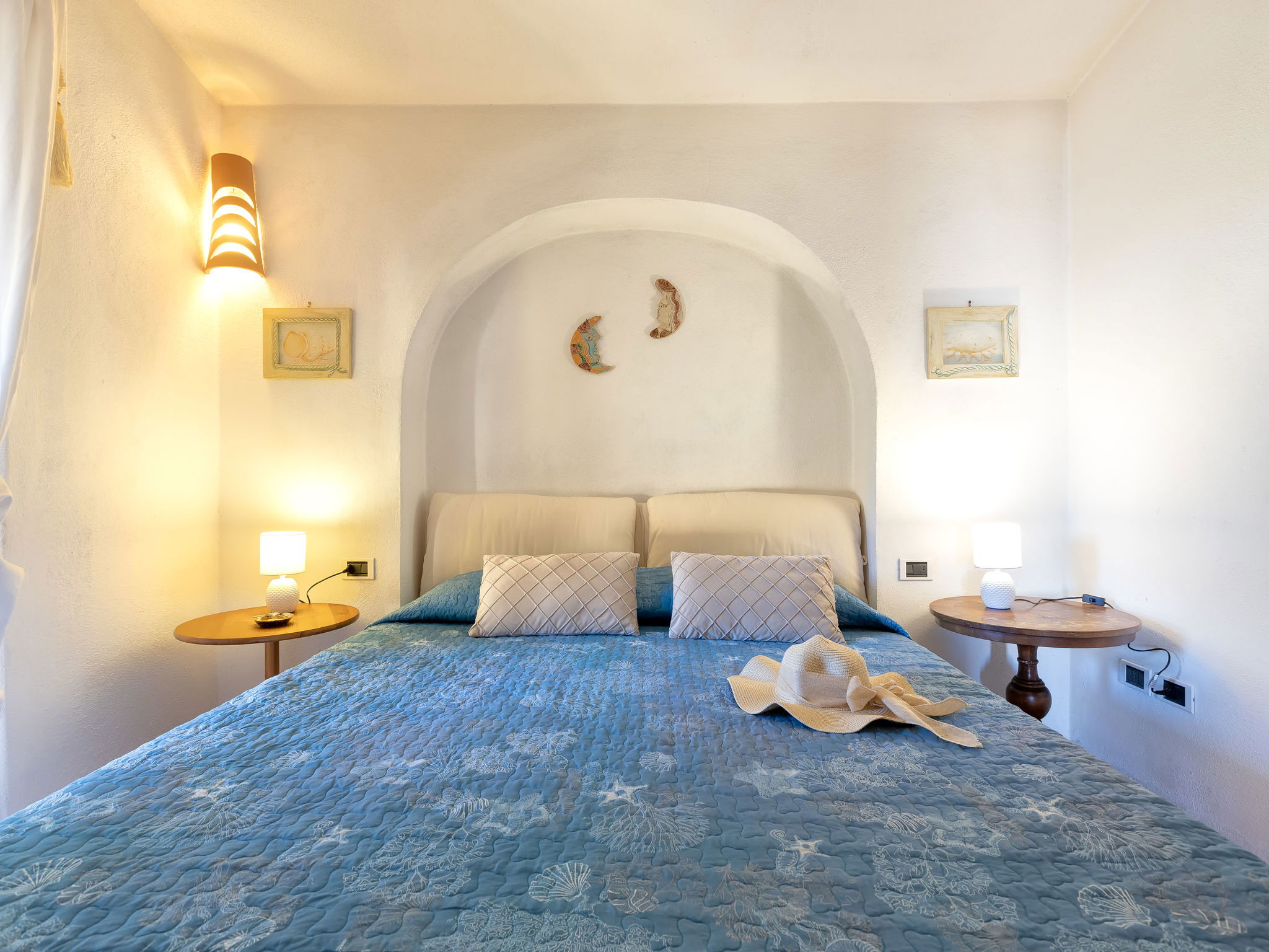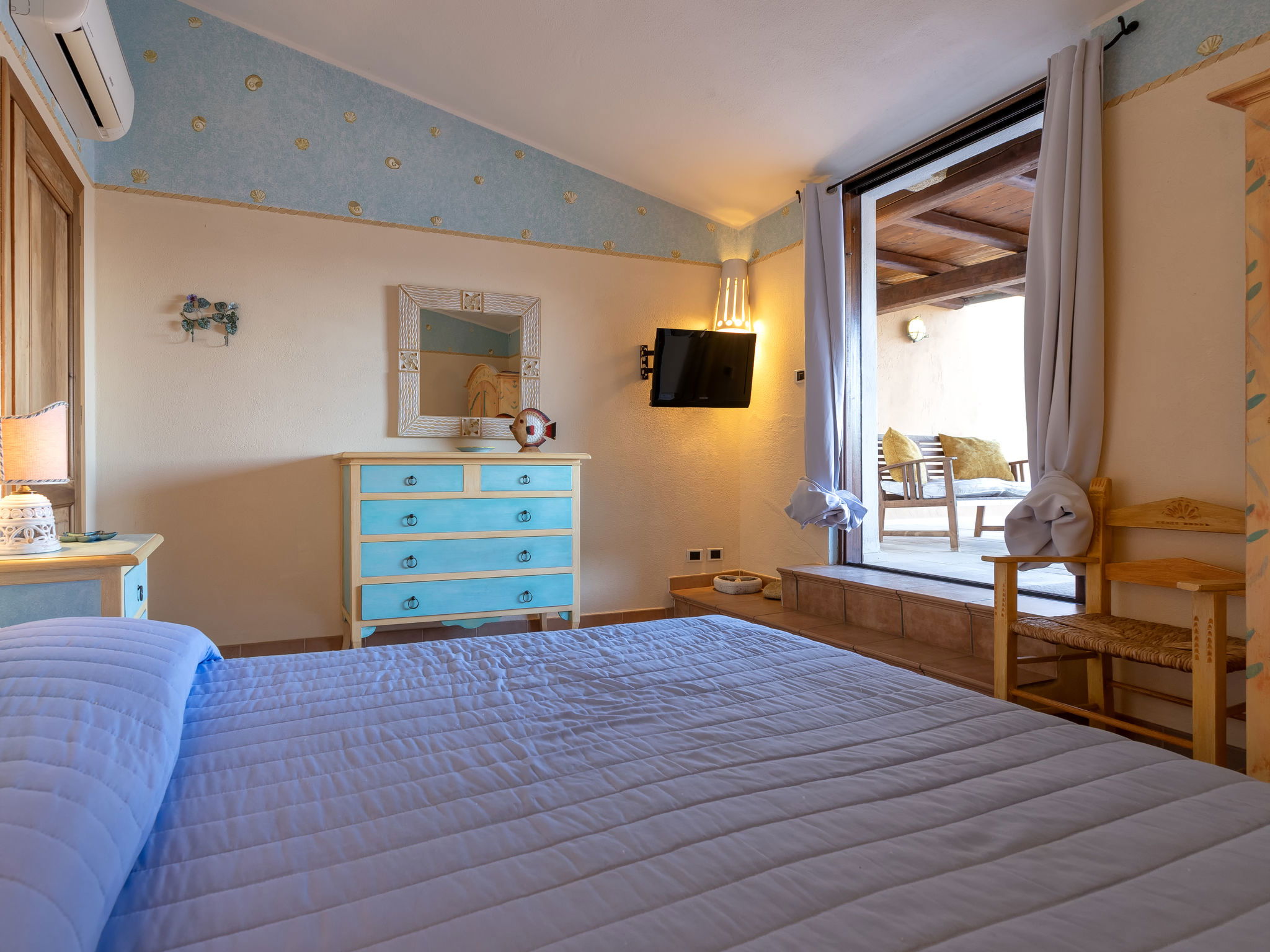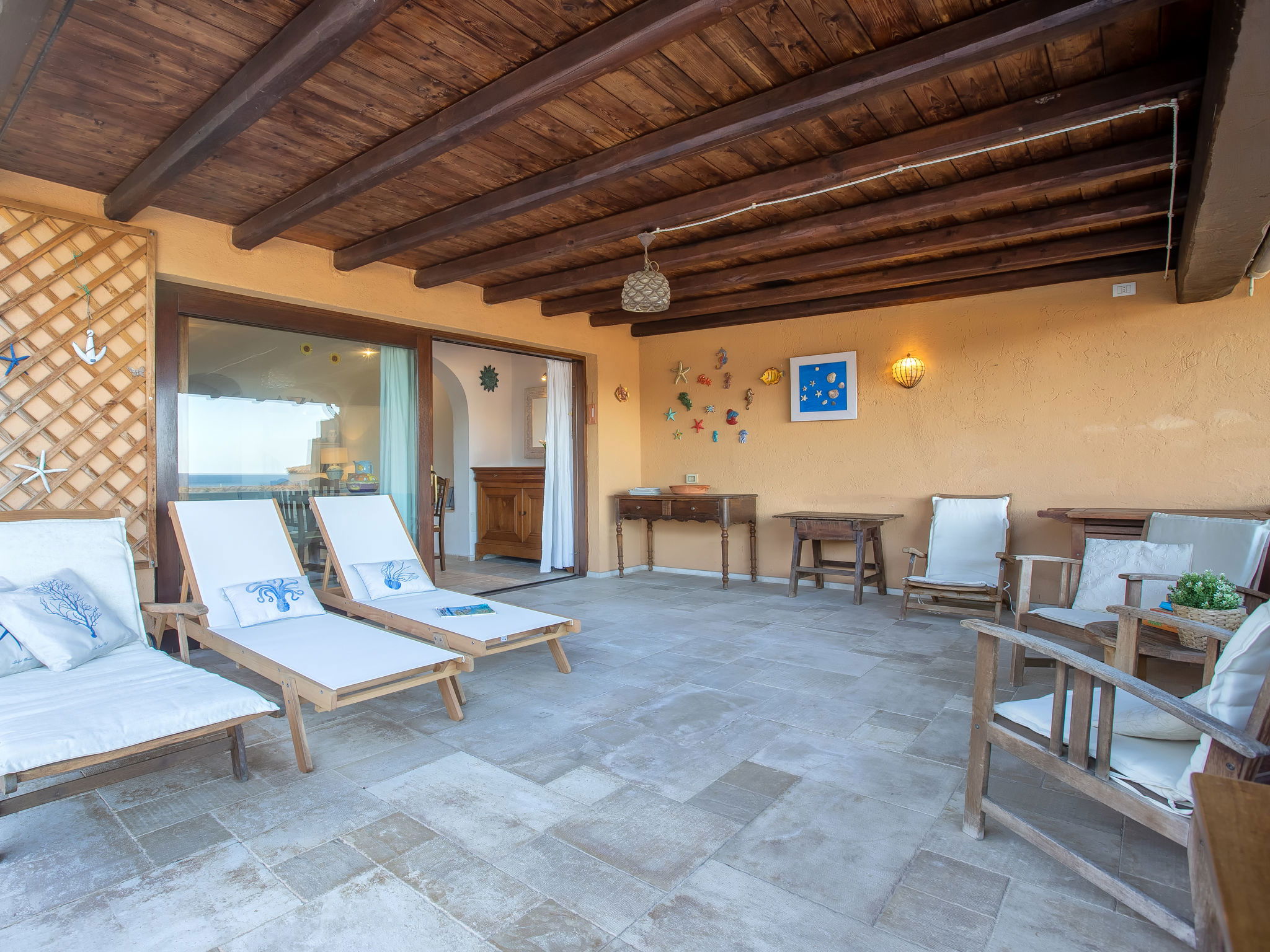 "Valentina", 5-room house 200 m2 on 2 levels. Comfortable and cosy furnishings: living/dining room with digital TV, air conditioning and forced-air heating. Exit to the veranda. 1 double bedroom. 1 double bedroom. Exit to the terrace. Kitchenette (oven, dishwasher, 4 gas rings, toaster, kettle, microwave). 2 showers/bidet/WC. Upper floor: 1 double bedroom with air conditioning and forced-air heating. Exit to the terrace. 1 double bedroom with veranda with air conditioning and forced-air heating. Shower/bidet/WC. Air-conditioning, forced-air heating (extra). Heating not available in all rooms. Large terrace, patio roofed, garden 50 m2. Terrace furniture, barbecue. Very beautiful view of the sea and the resort. Facilities: washing machine, children's high chair, baby cot (extra). Internet (WiFi, free). Please note: non-smoking house. Maximum 1 pet/ dog allowed. Private entrance. One Shower/bidet/WC is outside the apartment. IT090006C2000Q8553
